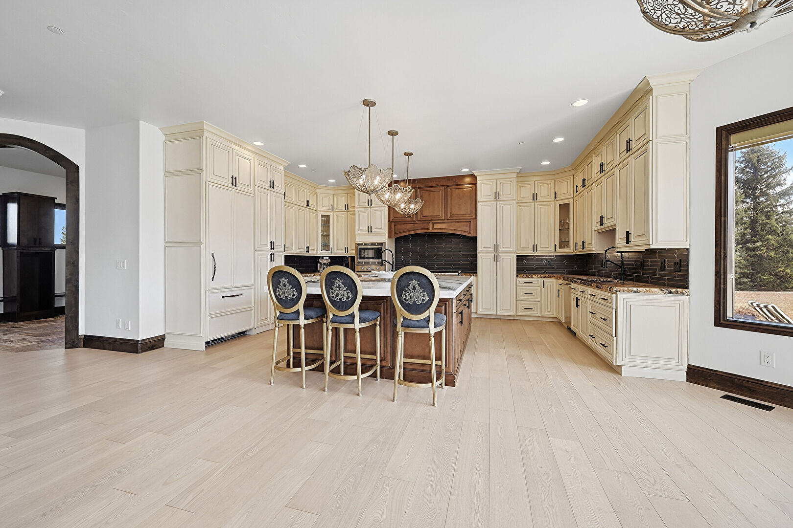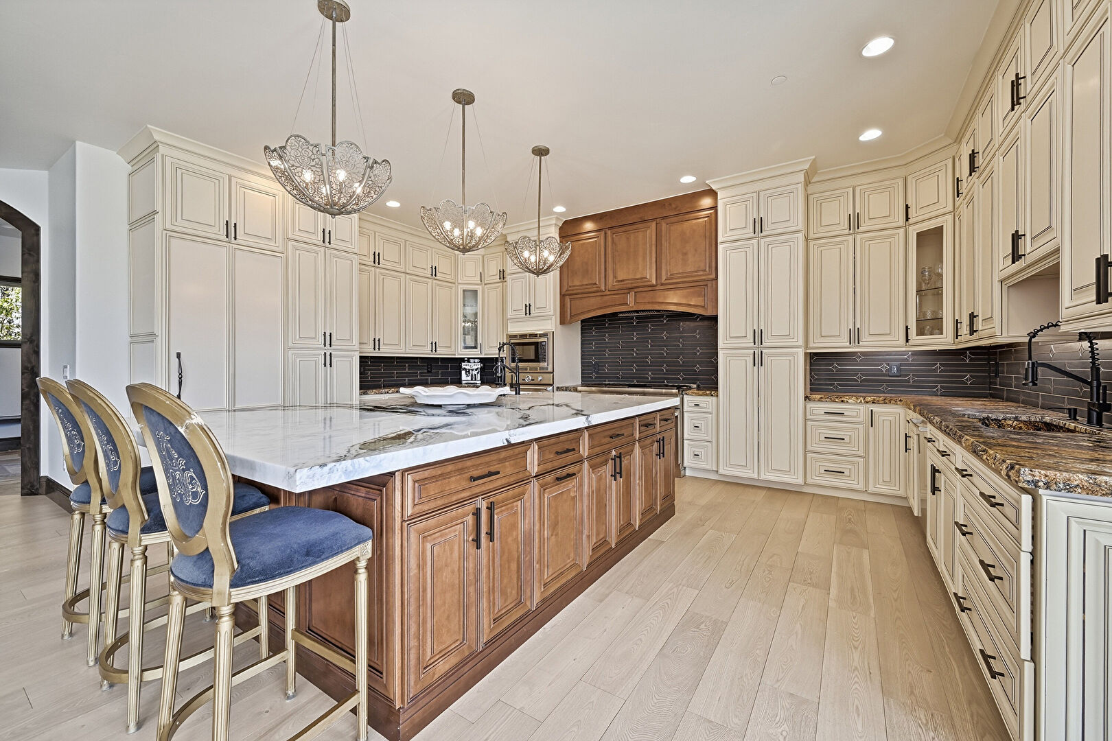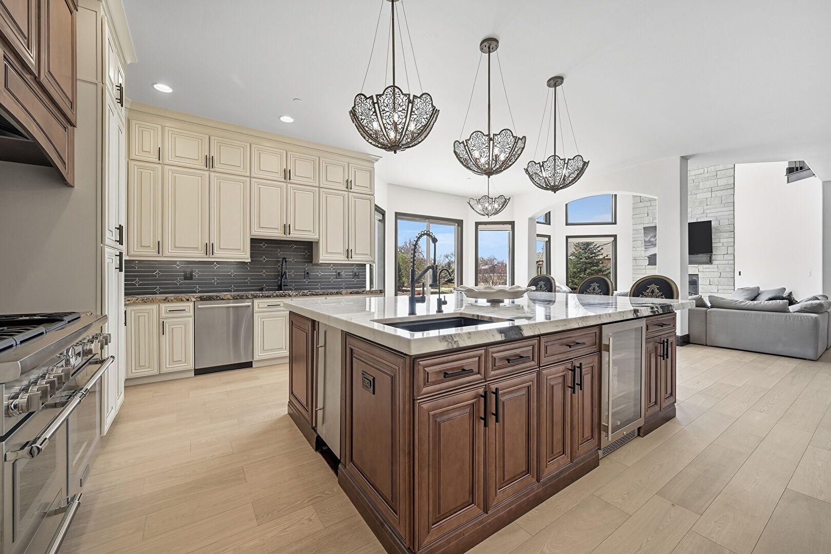 Arched Walkways, Baseboards Wall, Cream Cabinets, Crown Molding Cabinets, Dark Brown Cabinets, Drywall, Fireplace, Glass Insert Cabinets, Kitchen Bar, Kitchen Island, Medium Brown Cabinets, Natural Light, Notable Chandelier, Open Shelves, Opens To Living Area, Pendant Lighting, Pot Filler, Raised Cabinets, Recessed Lighting, Stone Countertops, Stone Finish Floor, U Shaped Kitchen, Vent, Wine Cooler, Wood Finish Floor, Baseboards Wall, Medium Brown Cabinets, Notable Chandelier, Opens To Living Area, Pendant Lighting, Recessed Lighting, Stone Countertops