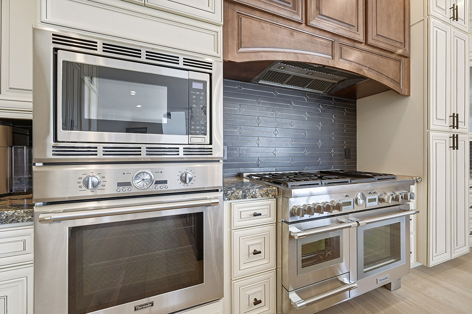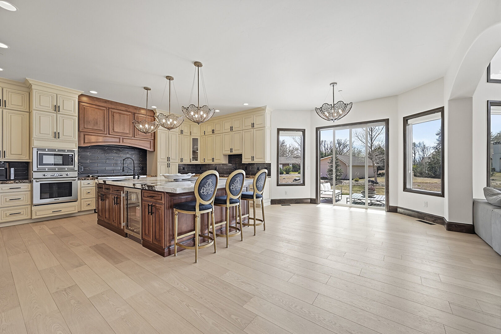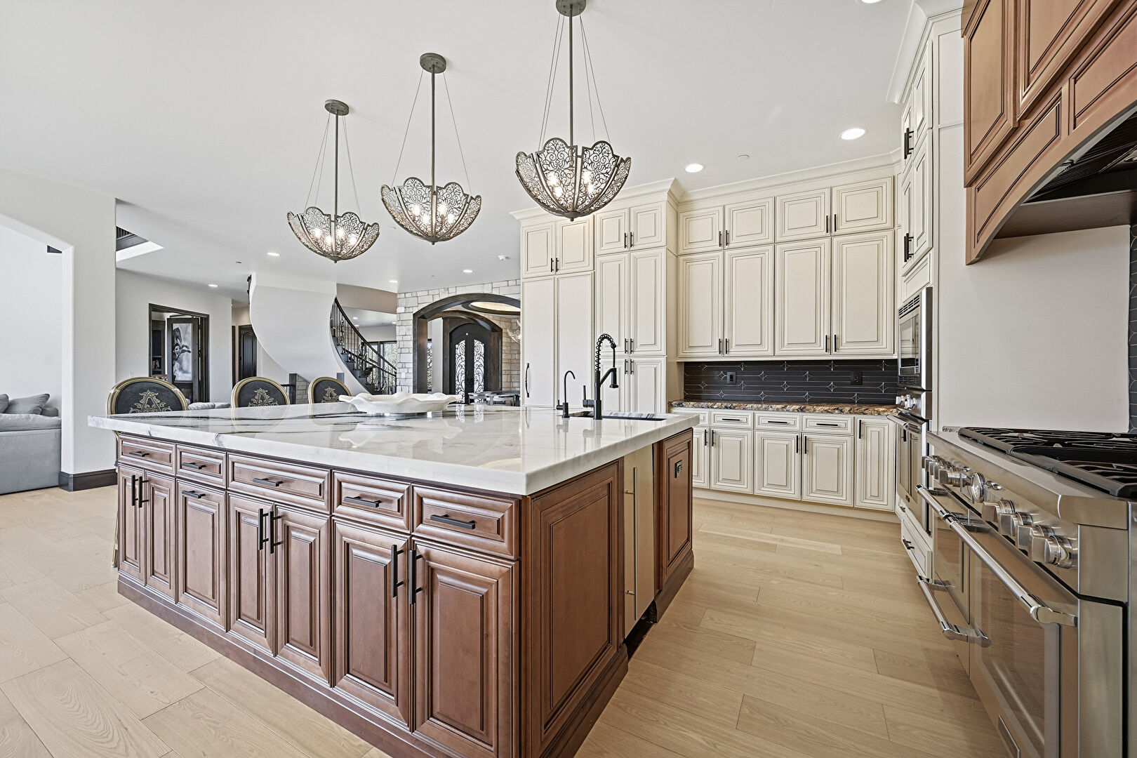 Arched Walkways, Baseboards Wall, Cream Cabinets, Crown Molding Cabinets, Dark Brown Cabinets, Drywall, Fireplace, Glass Insert Cabinets, Kitchen Bar, Kitchen Island, Medium Brown Cabinets, Natural Light, Notable Chandelier, Open Shelves, Opens To Living Area, Pendant Lighting, Pot Filler, Raised Cabinets, Recessed Lighting, Stone Countertops, Stone Finish Floor, U Shaped Kitchen, Vent, Wine Cooler, Wood Finish Floor, Baseboards Wall, Medium Brown Cabinets, Notable Chandelier, Opens To Living Area, Pendant Lighting, Recessed Lighting, Stone Countertops