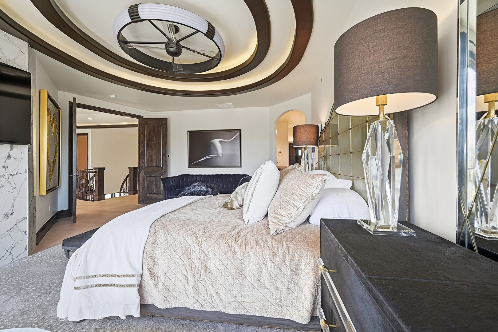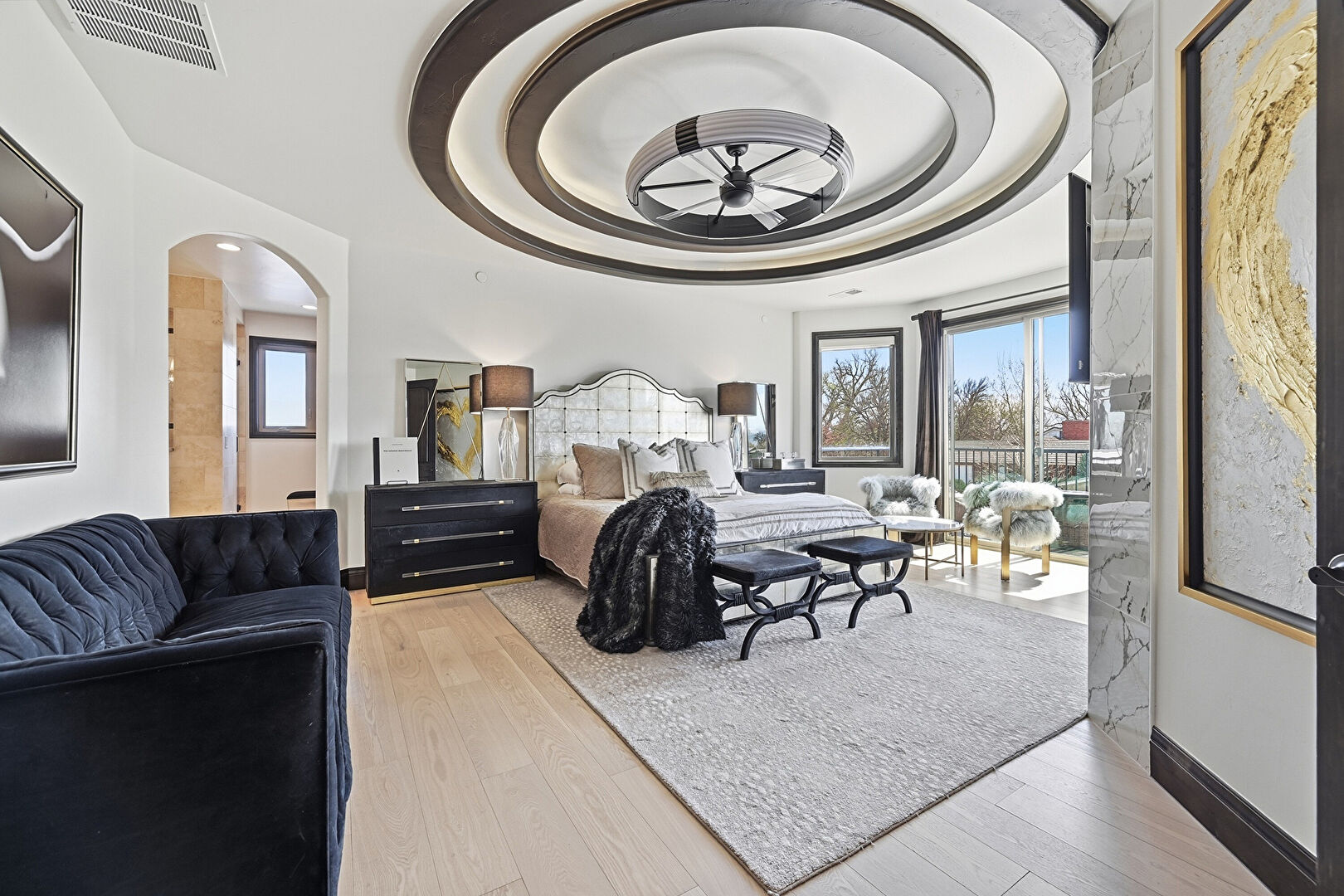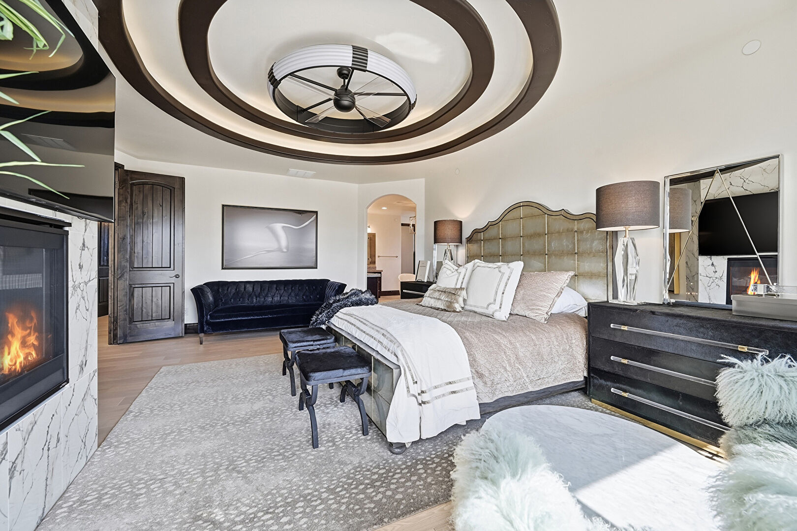 Access To Exterior, Arched Walkways, Baseboards Wall, Ceiling Fan, Drywall, Ensuite Bathroom, Fireplace, Natural Light, Smoke Carbon Monoxide Detector, Tray Ceiling, Vent, Wood Finish Floor, Drywall, Vent, Wood Finish Floor