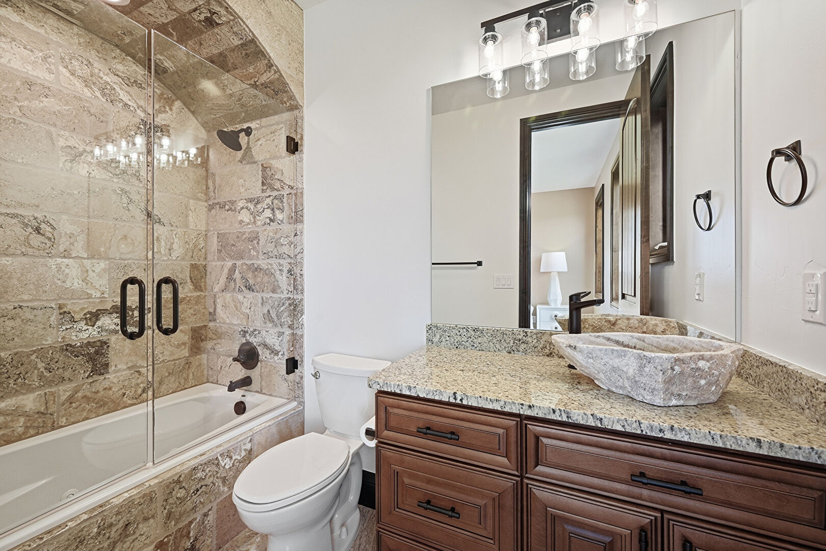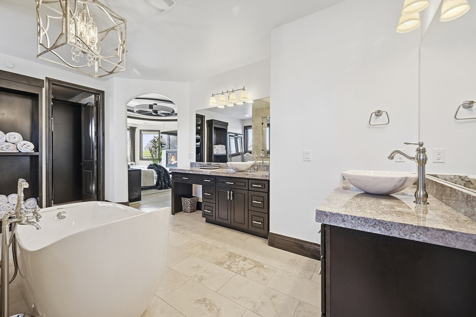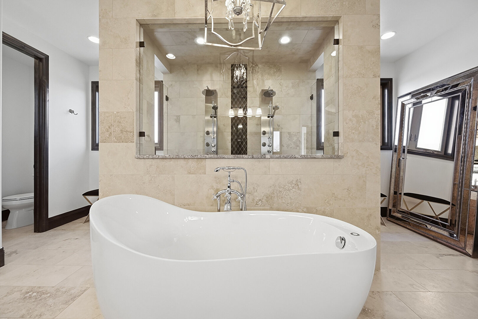 Baseboards Wall, Drywall, Ensuite Bathroom, Full Bathroom, Natural Light, Notable Chandelier, Recessed Lighting, Stone Finish Floor, Tile Wall, Two Single Vanities, Vanity, Vent, Ensuite Bathroom, Notable Chandelier, Recessed Lighting, Water Closet