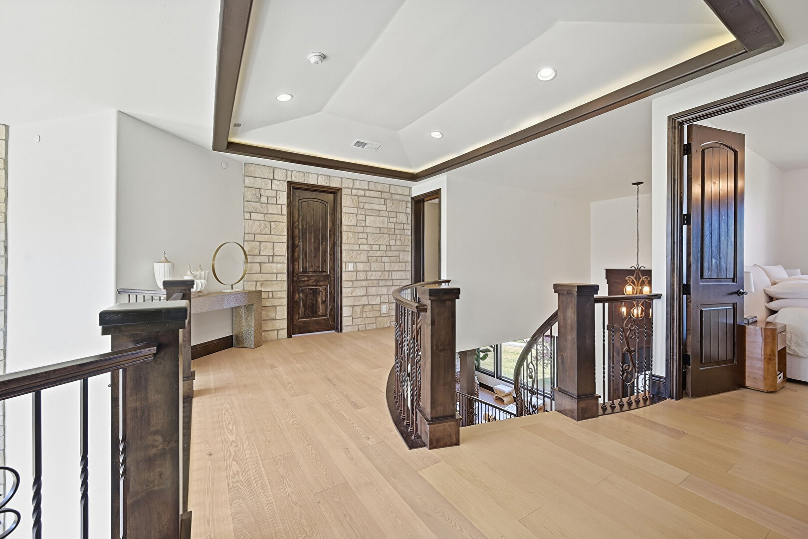 Recessed Lighting, Tray Ceiling, Upstairs Landing, Vent, Wood Finish Floor, Drywall