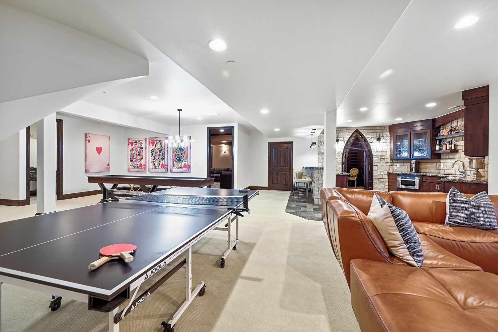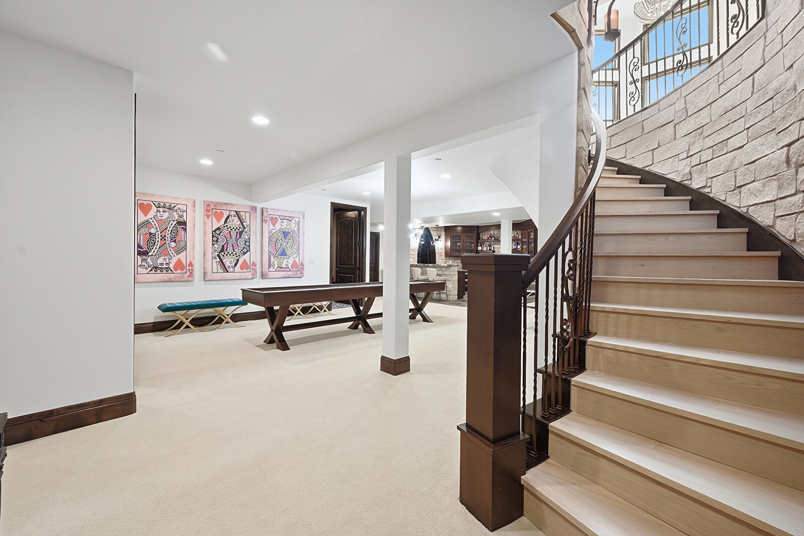 Baseboards Wall, Billiards, Carpet, Drywall, Indoor Bar, Recessed Lighting, Stone Wall, Baseboards Wall, Drywall