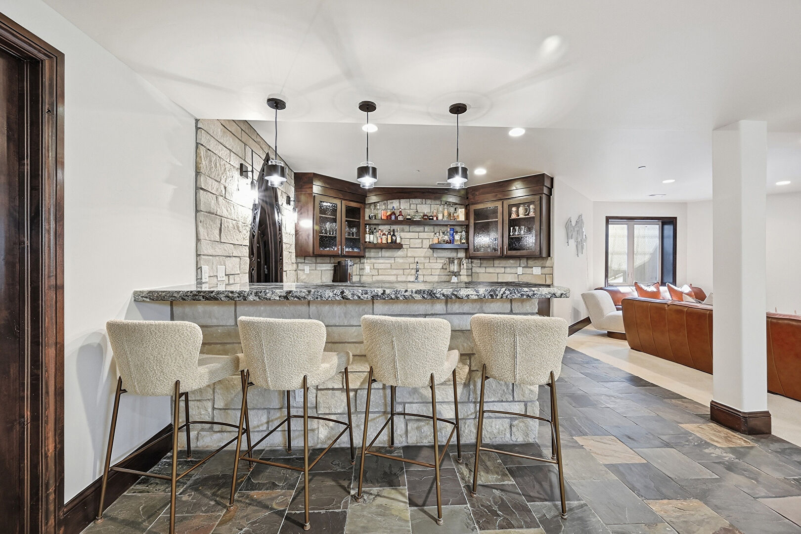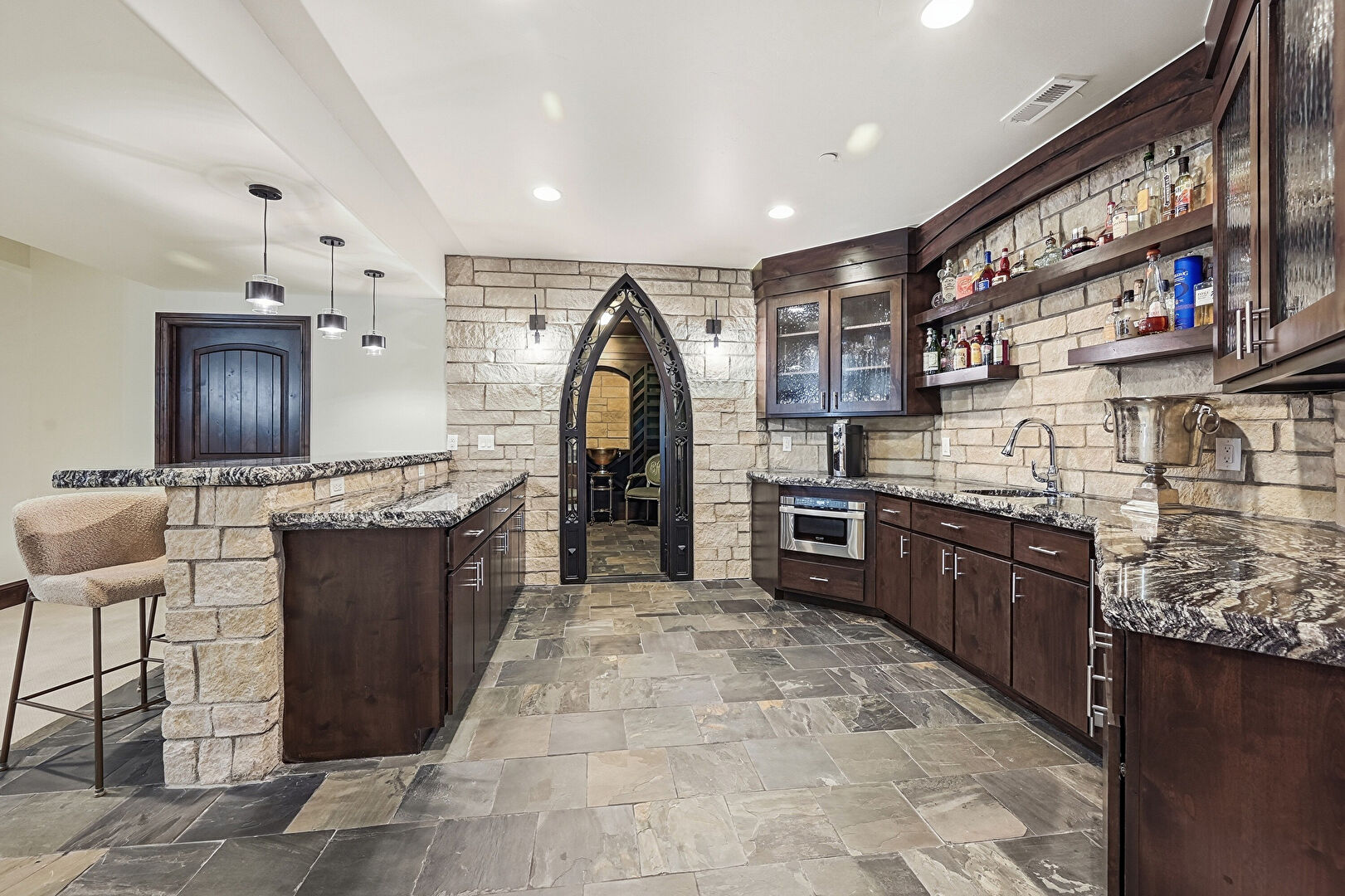 Arched Walkways, Baseboards Wall, Dark Brown Cabinets, Drywall, Glass Insert Cabinets, Indoor Bar, Natural Light, Open Shelves, Pendant Lighting, Recessed Lighting, Stone Countertops, Stone Finish Floor, Stone Wall, Vent, Stone Countertops, Stone Finish Floor