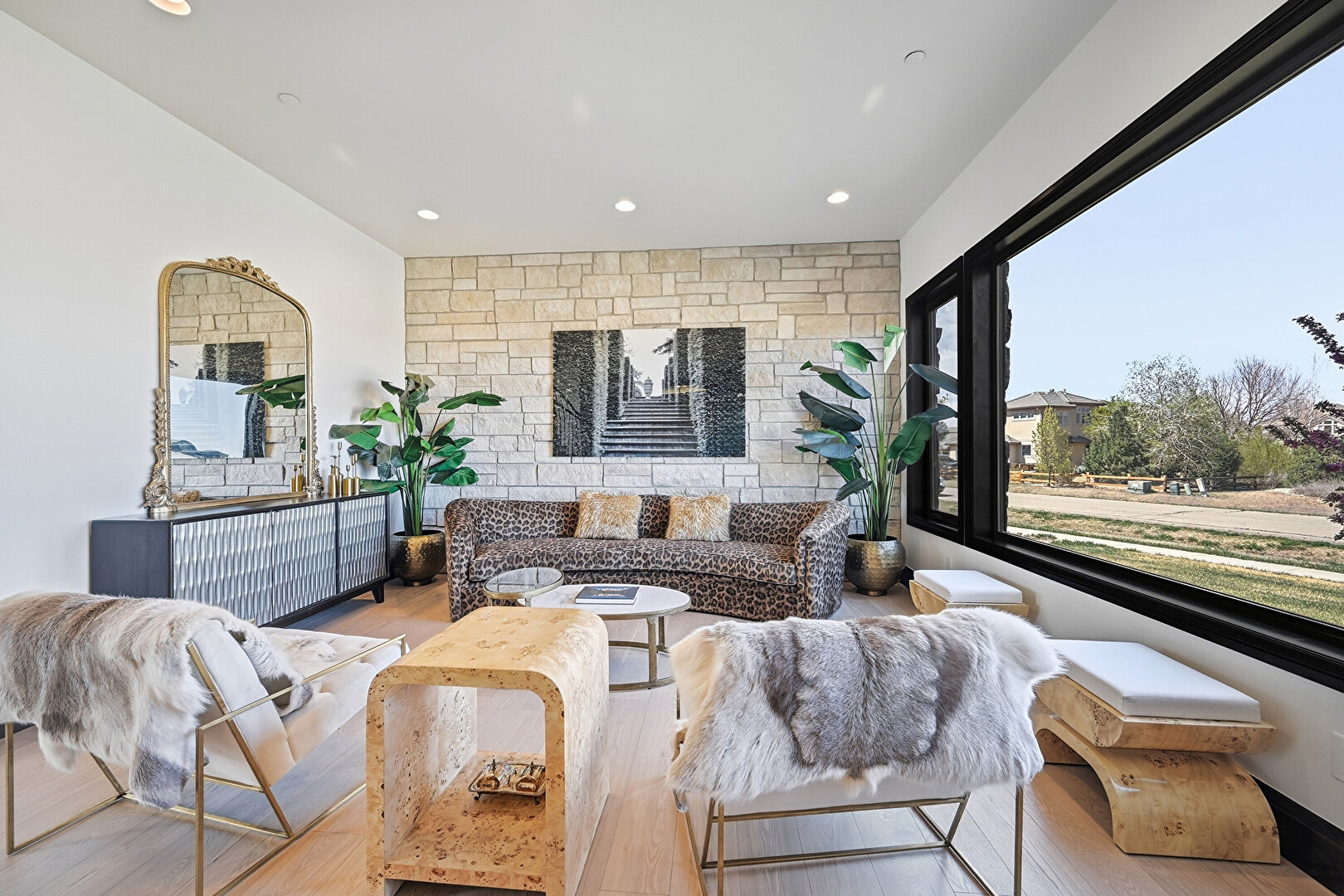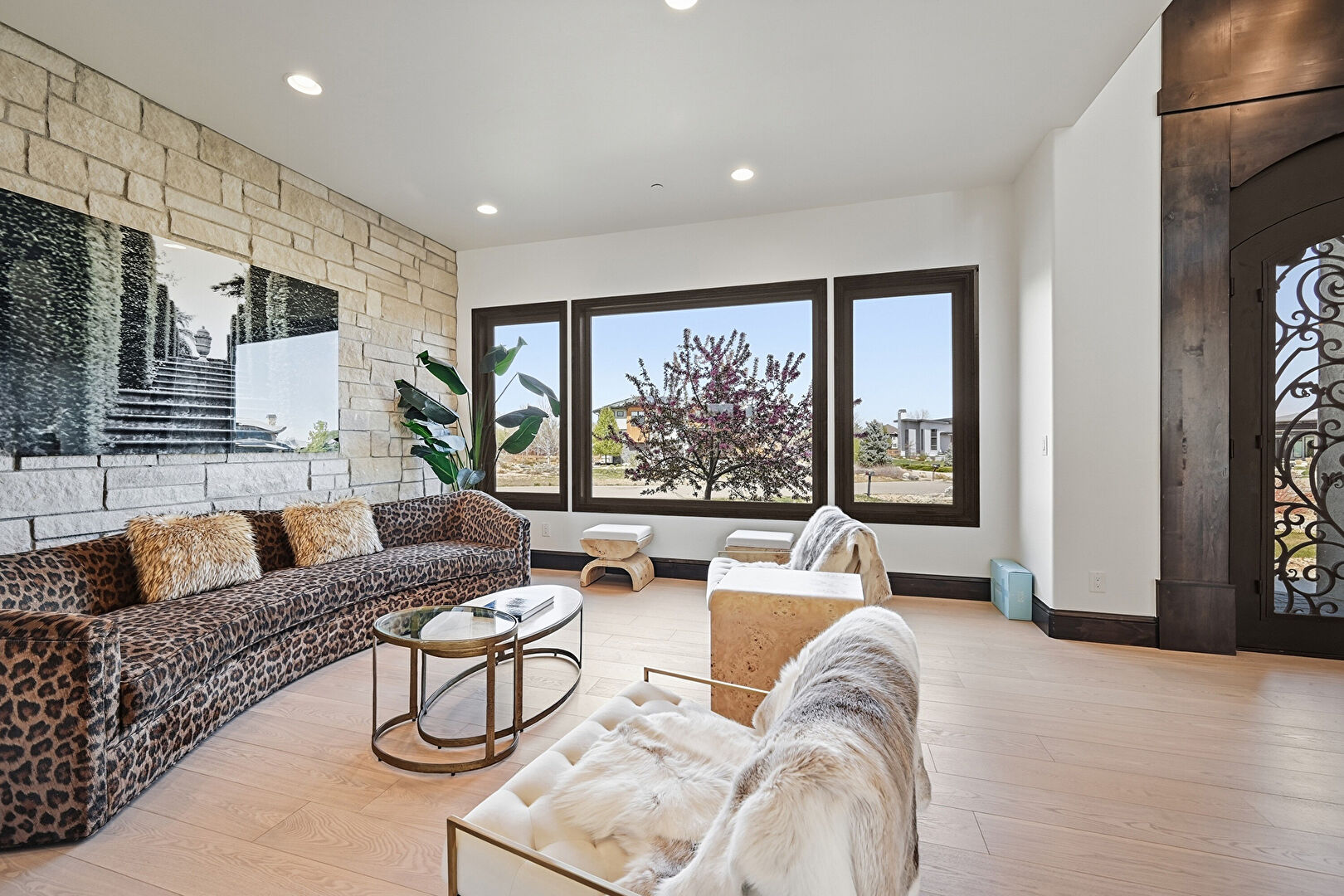 Accent Wall, Baseboards Wall, Drywall, Natural Light, Recessed Lighting, Stone Wall, Wood Finish Floor, Accent Wall, Recessed Lighting