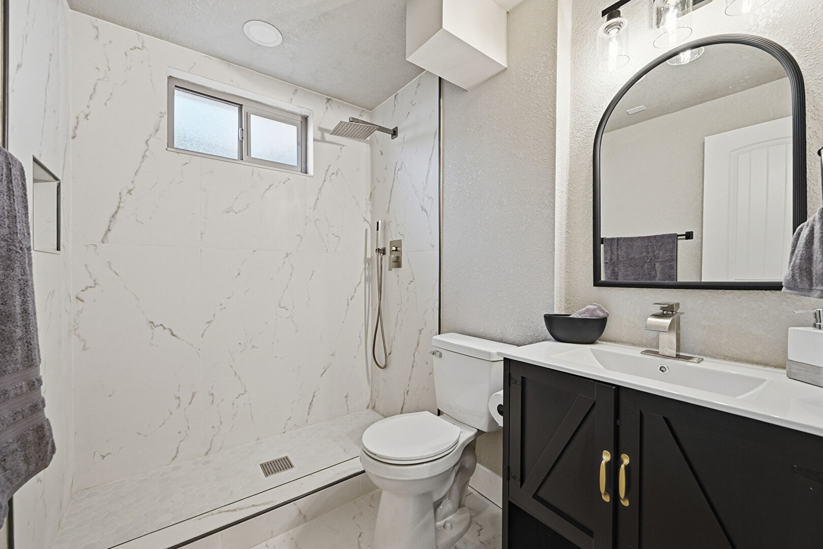 Basement, Full Bathroom, Marble Finish Floor, Natural Light, Textured Wall, Vanity