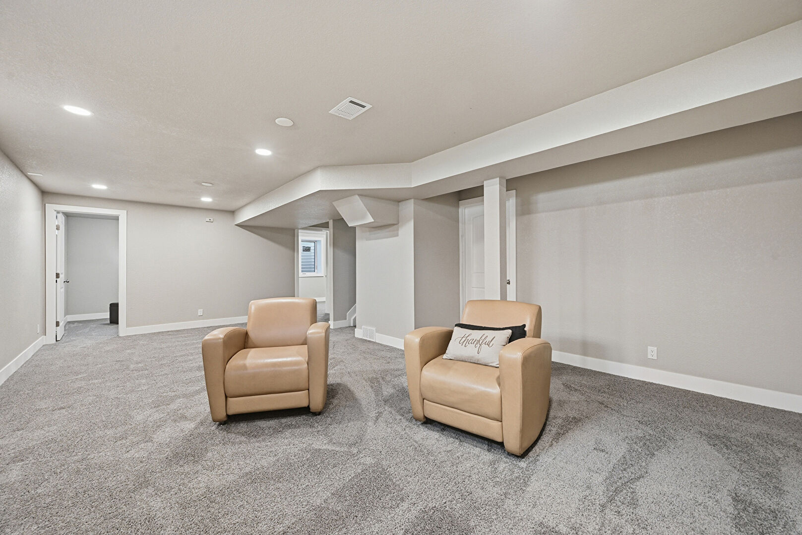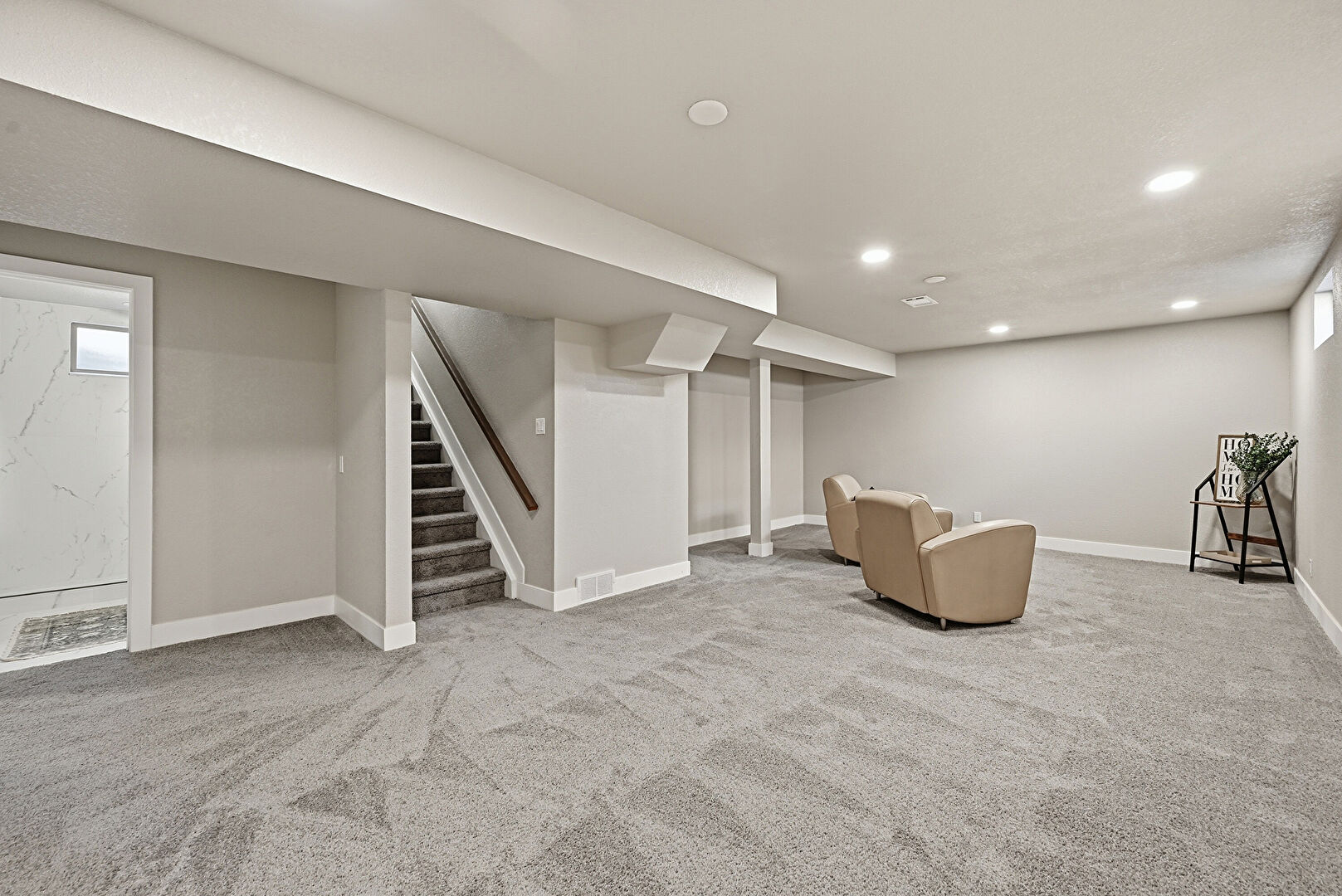 Baseboards Wall, Basement, Carpet, Drywall, Recessed Lighting, Stairs, Vent, Baseboards Wall, Basement