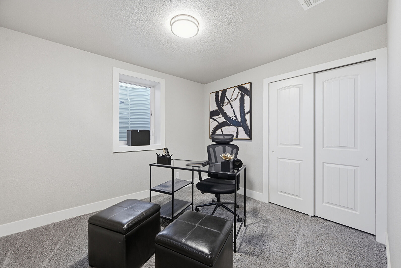 Baseboards Wall, Carpet, Drywall, Textured Ceiling, Vent, Office Area