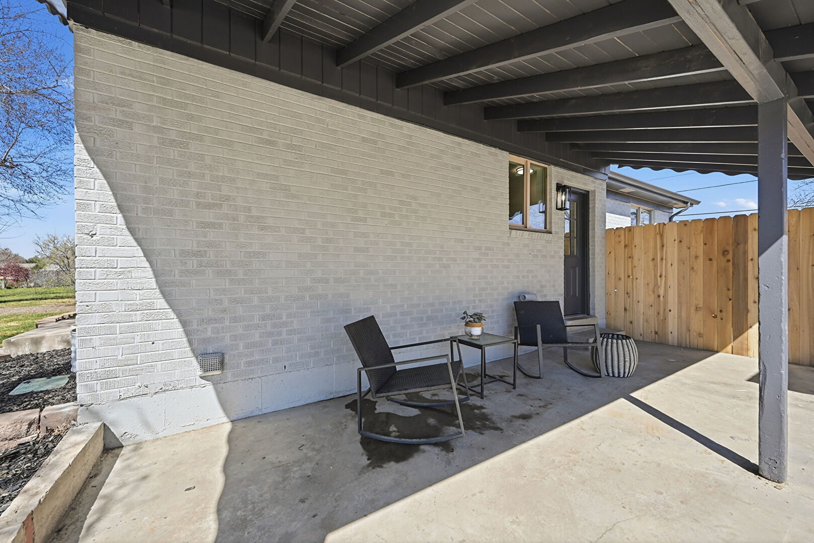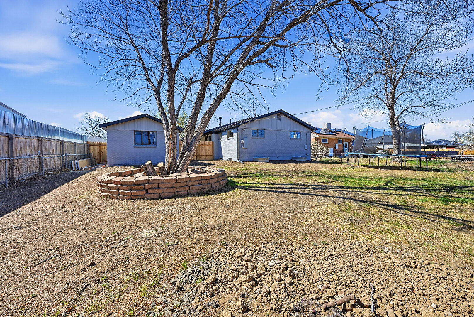 Brick Siding, Fence, Lawn, Trampoline, Vertical Siding, Outdoor Structure