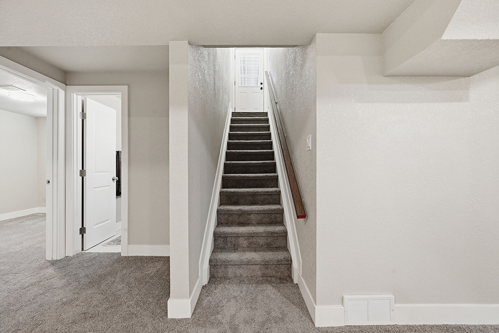 Baseboards Wall, Carpet, Drywall, Textured Ceiling, Textured Wall, Vent, Stairs