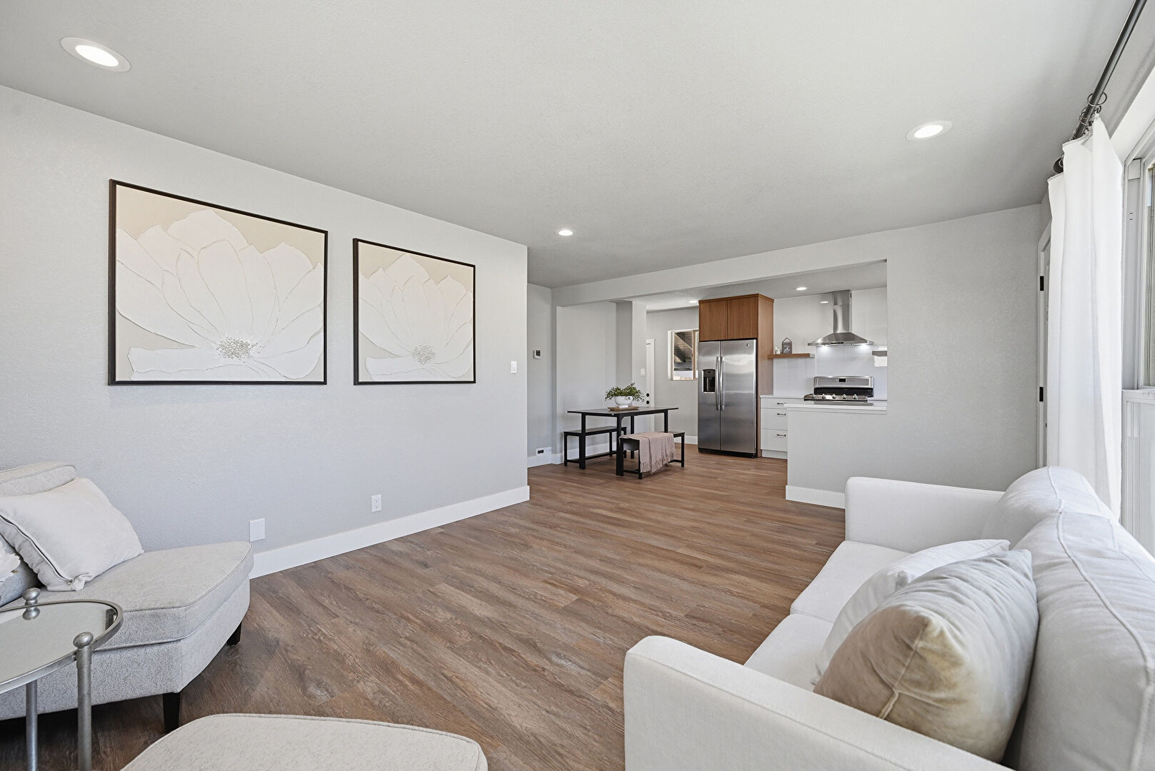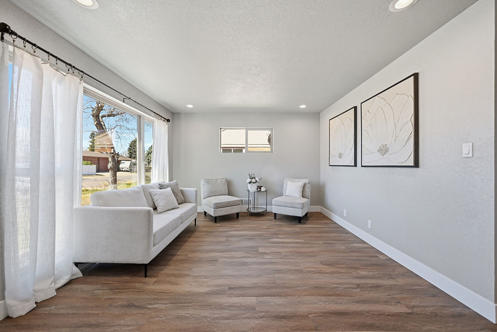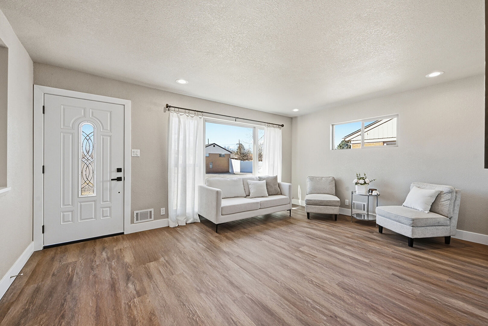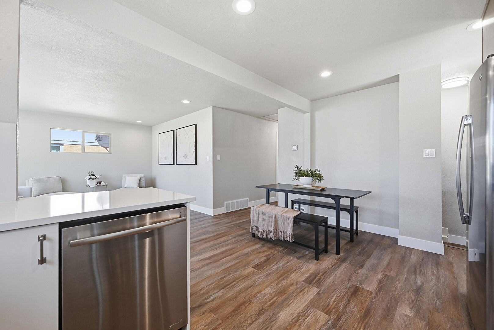 Baseboards Wall, Drywall, Natural Light, Recessed Lighting, Scuttle, Textured Ceiling, Wood Finish Floor, Drywall, Textured Ceiling, Vent