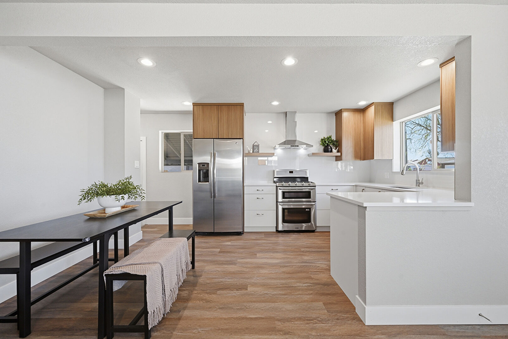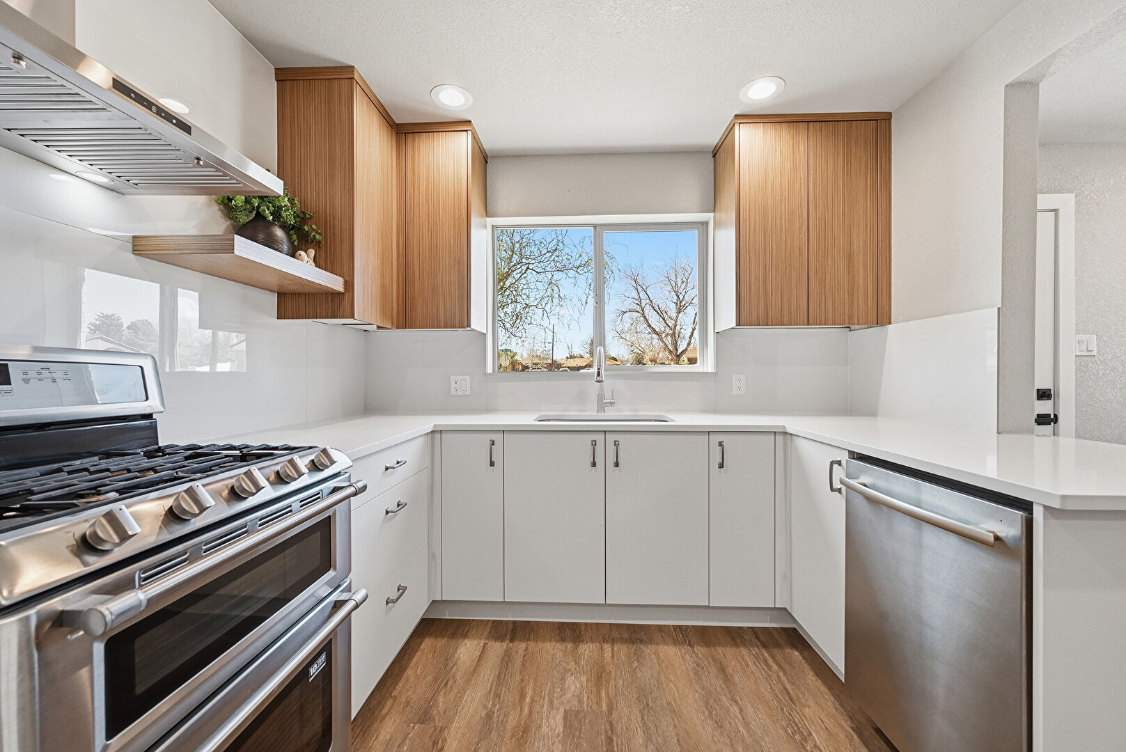 Baseboards Wall, Drywall, Flat Panel Cabinets, Kitchen Peninsula, Medium Brown Cabinets, Natural Light, Open Shelves, Recessed Lighting, Stone Countertops, Textured Ceiling, Vent, Wood Finish Floor, Open Shelves, Opens To Living Area, U Shaped Kitchen, Wood Finish Floor