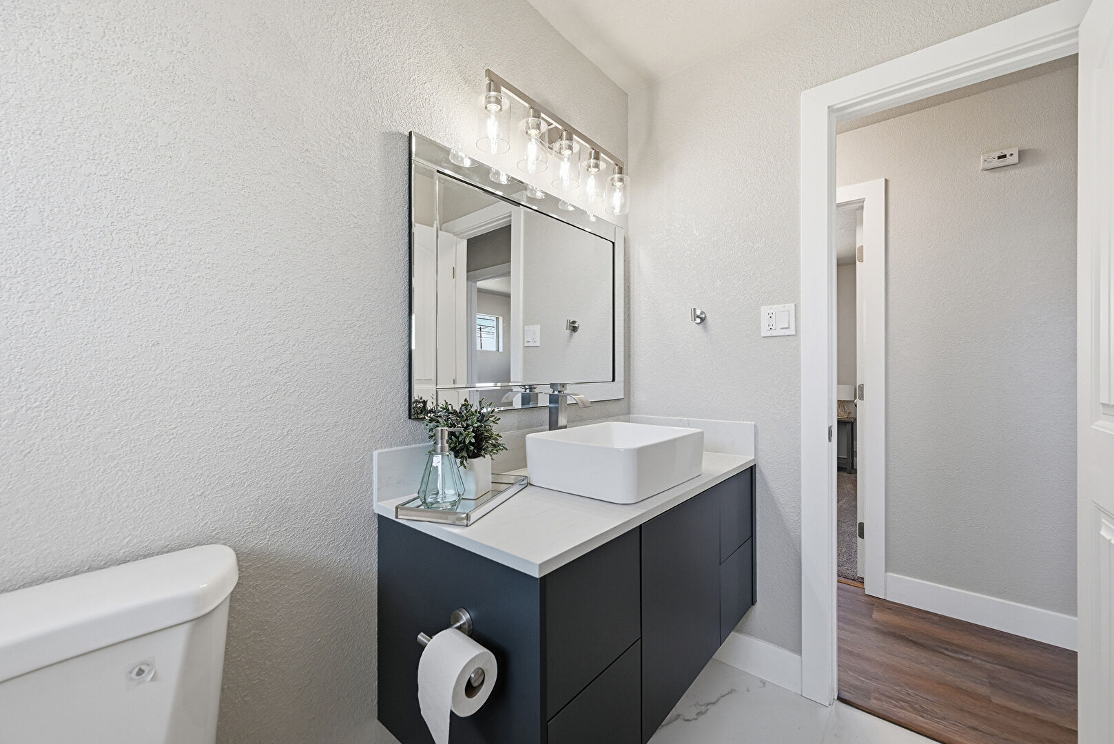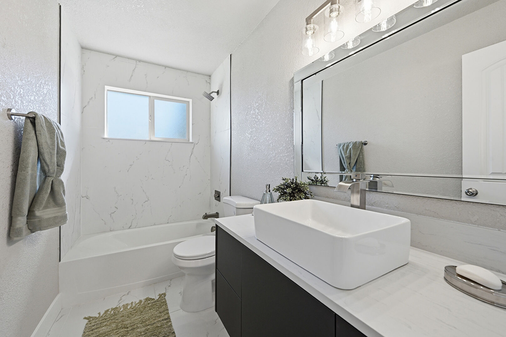 Baseboards Wall, Combined Bath Shower, Full Bathroom, Half Bathroom, Marble Finish Floor, Natural Light, Textured Wall, Vanity, Marble Finish Floor, Vanity