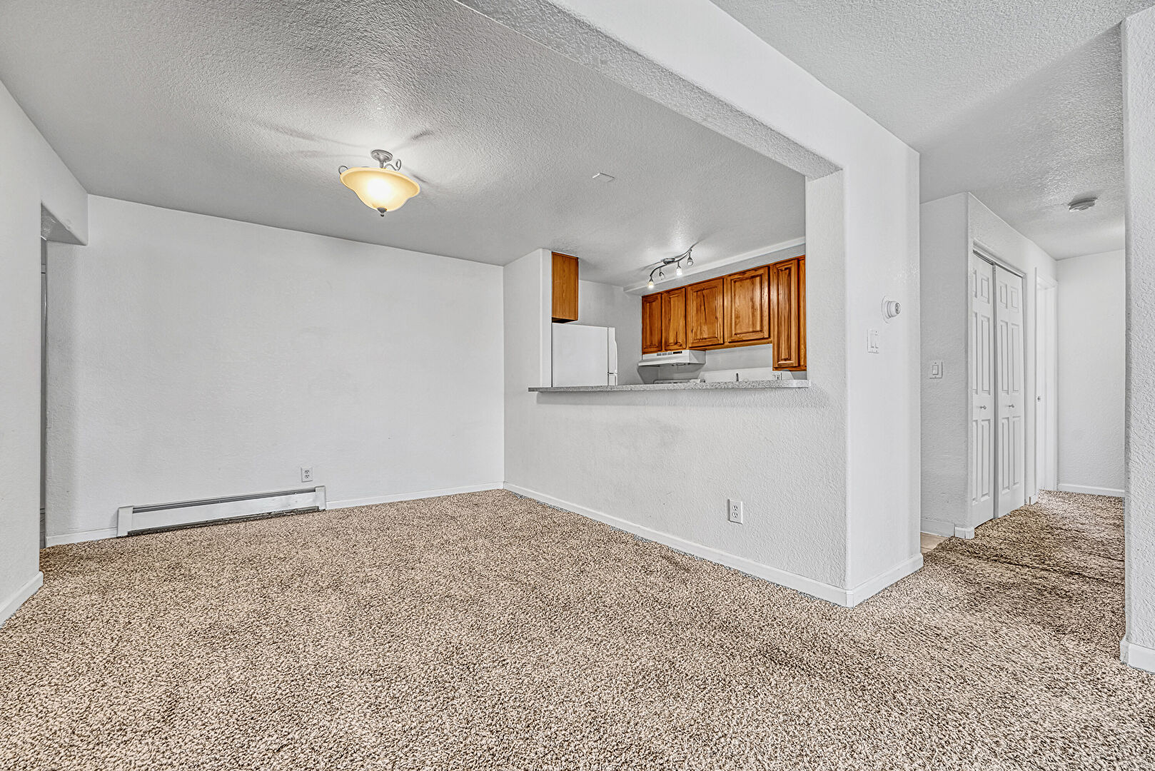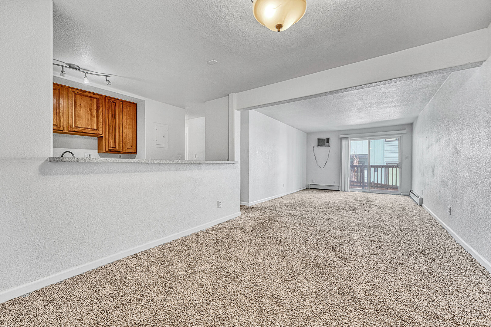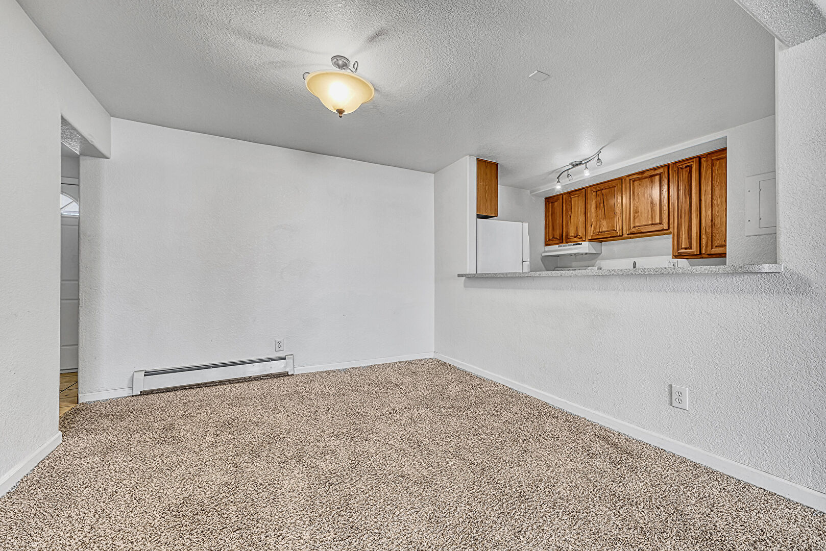 Baseboard Radiator, Baseboards Wall, Carpet, Drywall, Natural Light, Textured Ceiling, Textured Wall, Track Lighting, Wall Mounted Ac, Baseboards Wall, Natural Light, Textured Ceiling