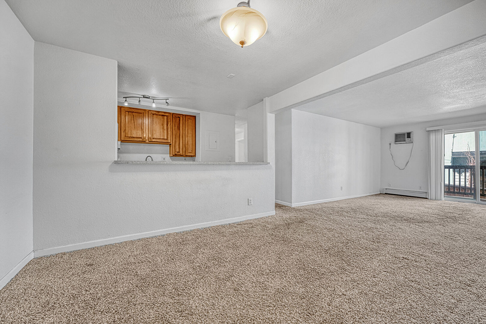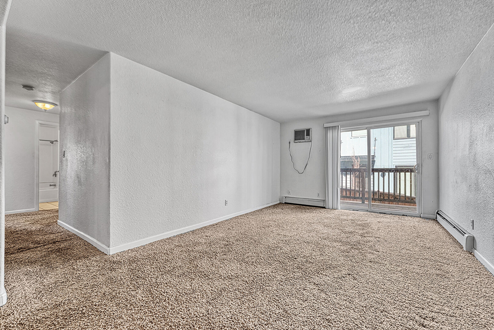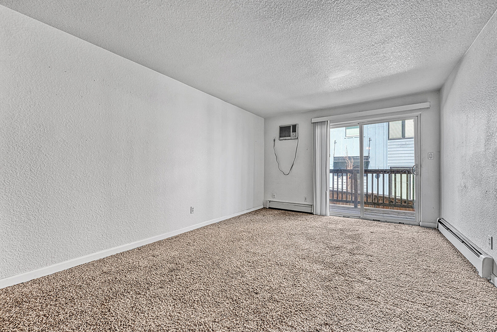 Baseboard Radiator, Baseboards Wall, Carpet, Drywall, Natural Light, Textured Ceiling, Textured Wall, Track Lighting, Wall Mounted Ac, Baseboards Wall, Natural Light, Textured Ceiling