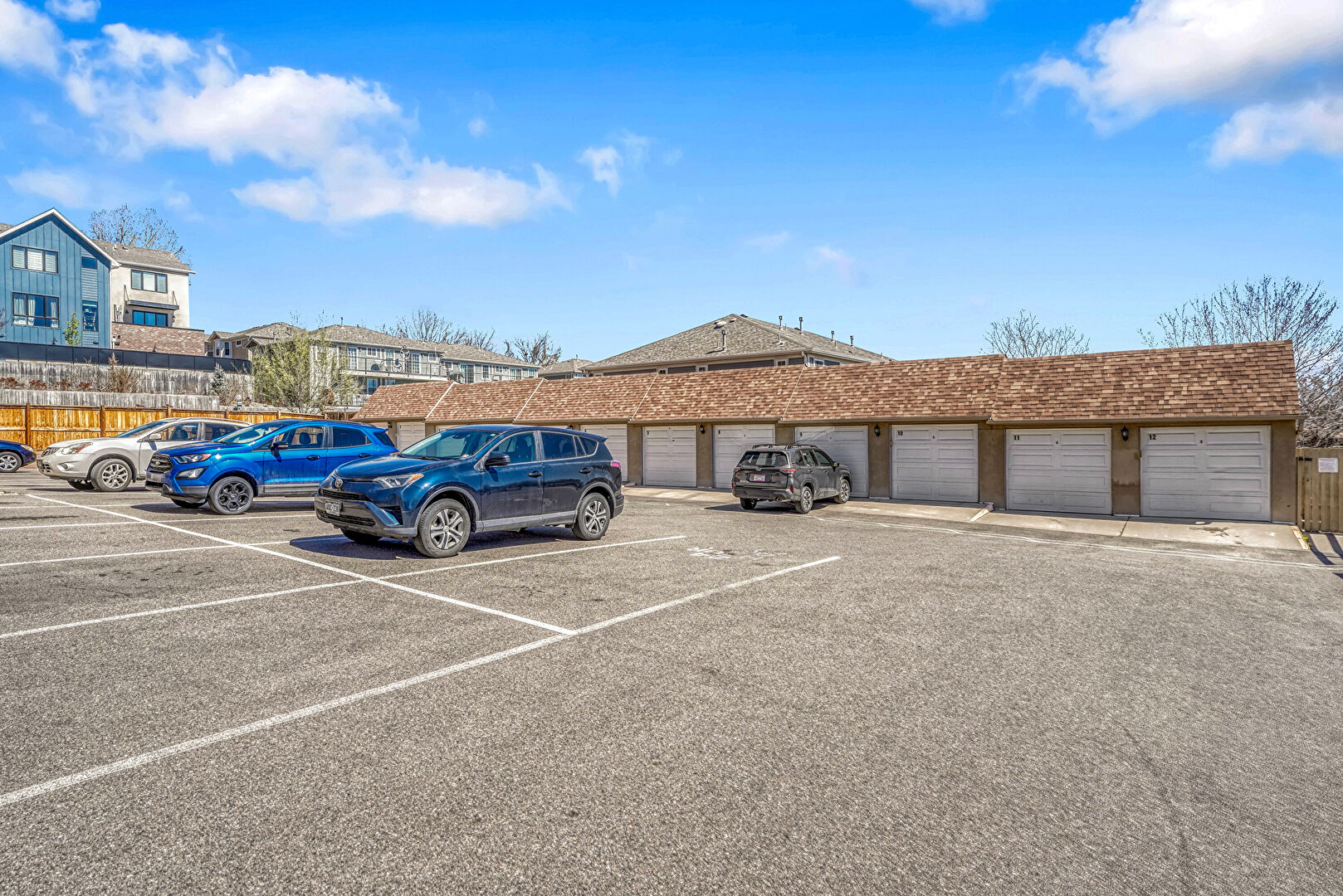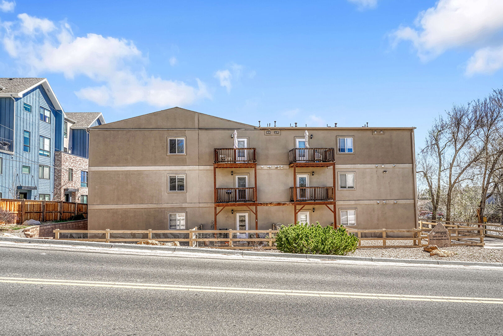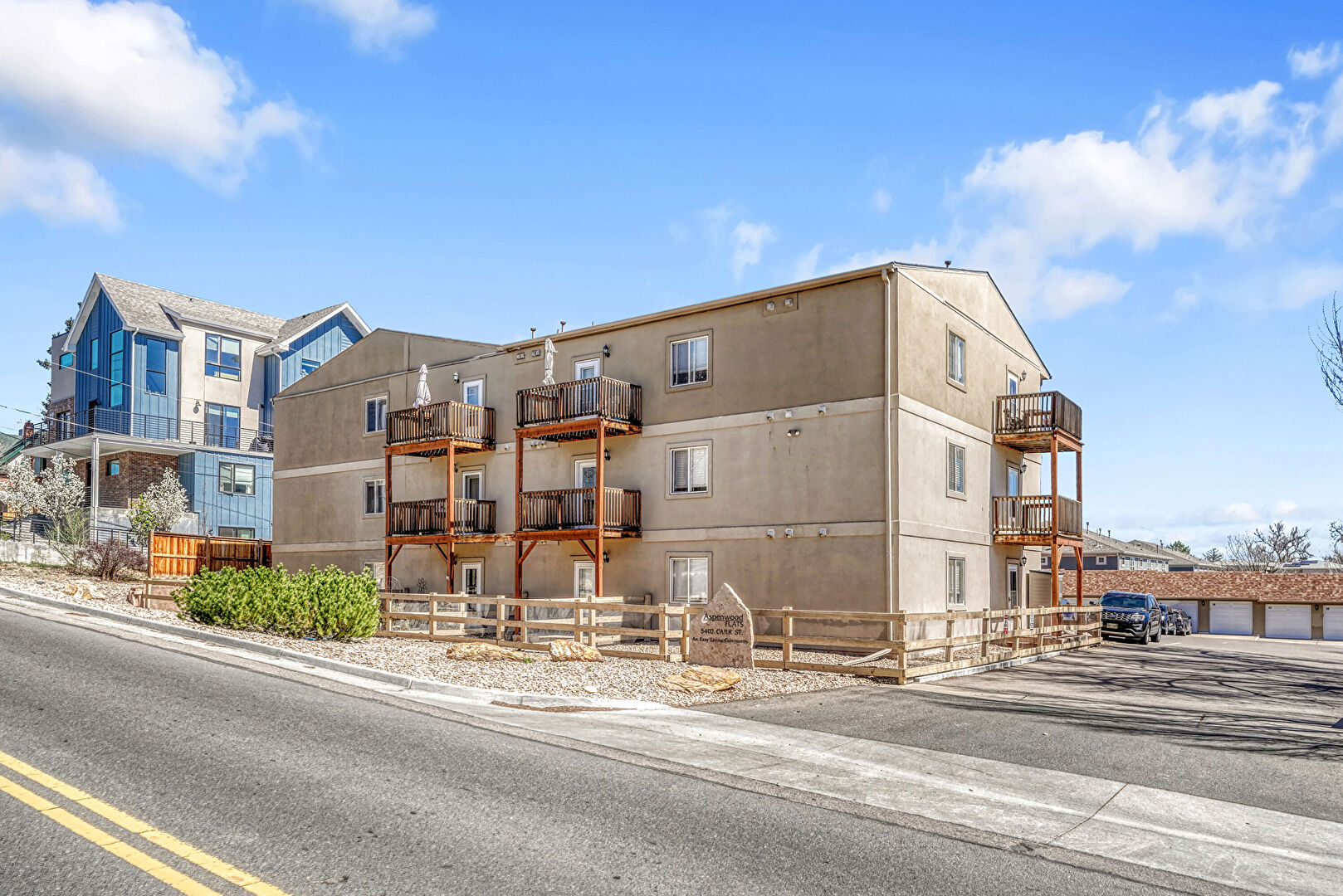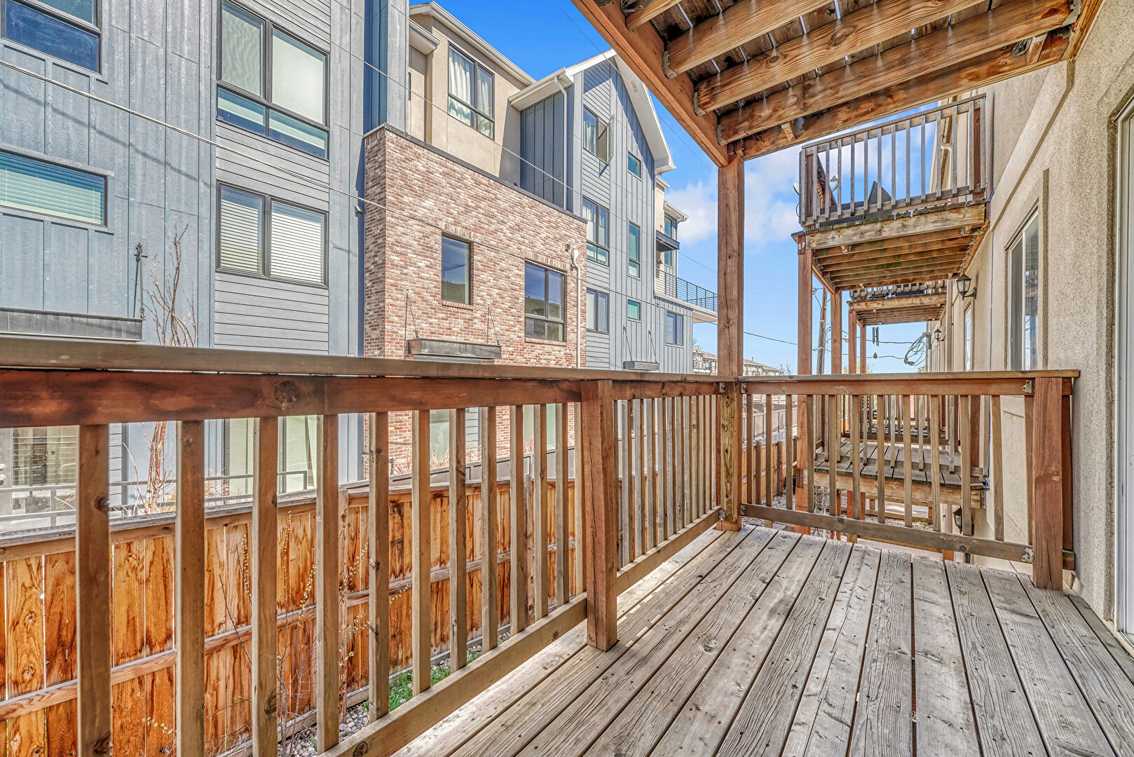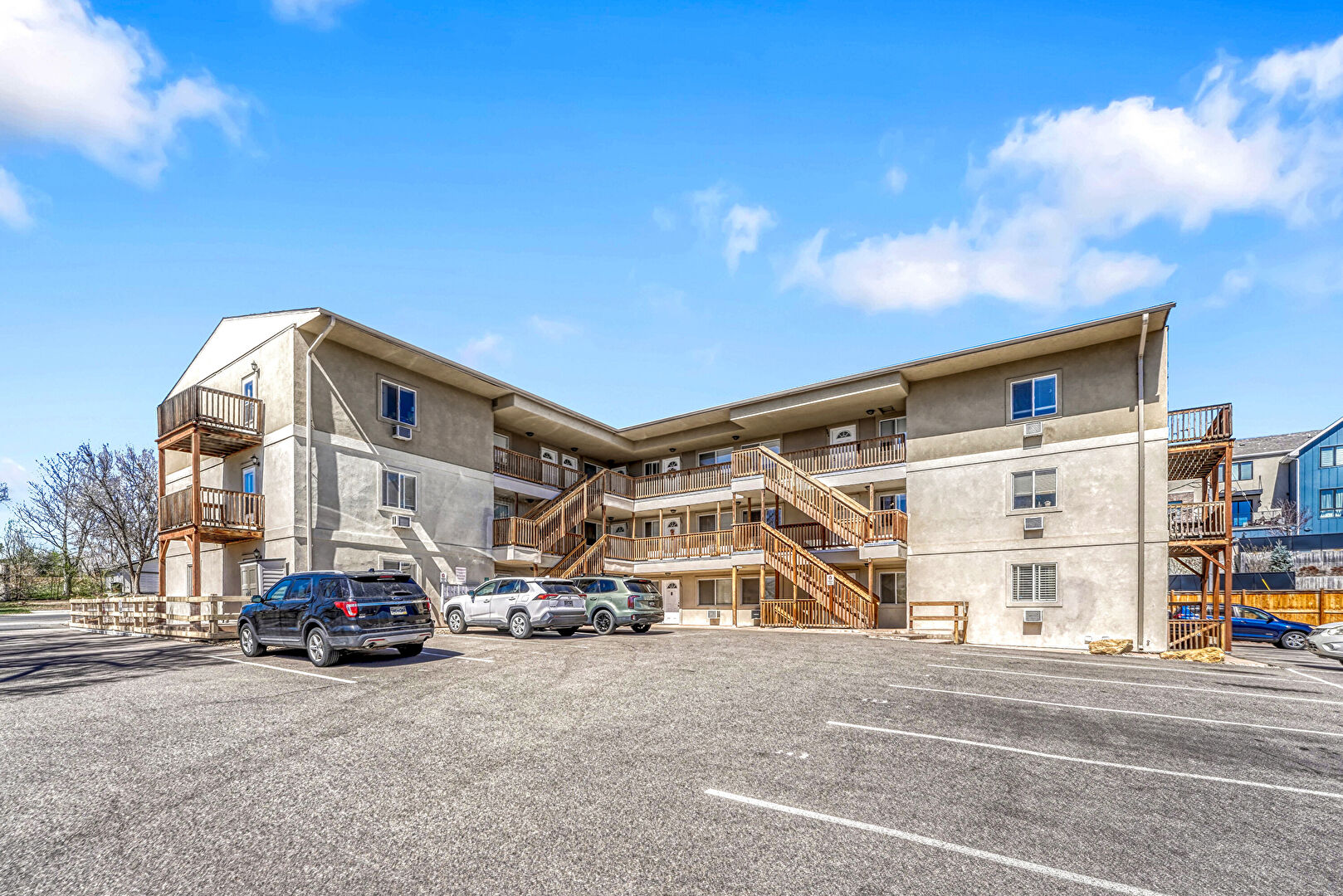 Apartment Complex View, Balcony, Fence, Parking Lot, Apartment Complex View, Stairs, Stucco Siding