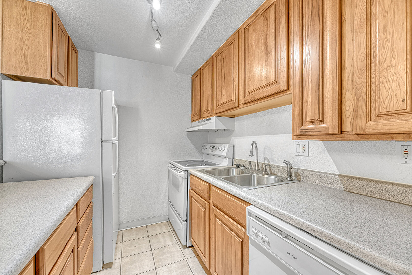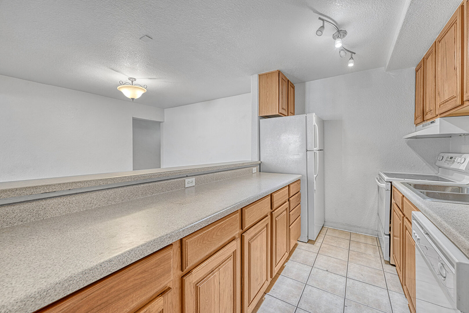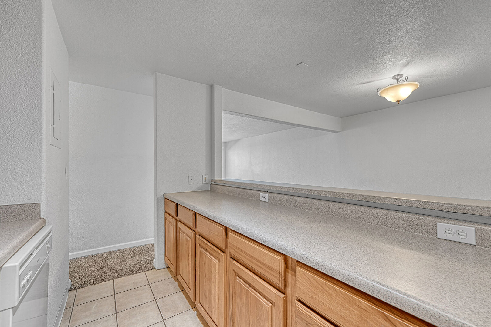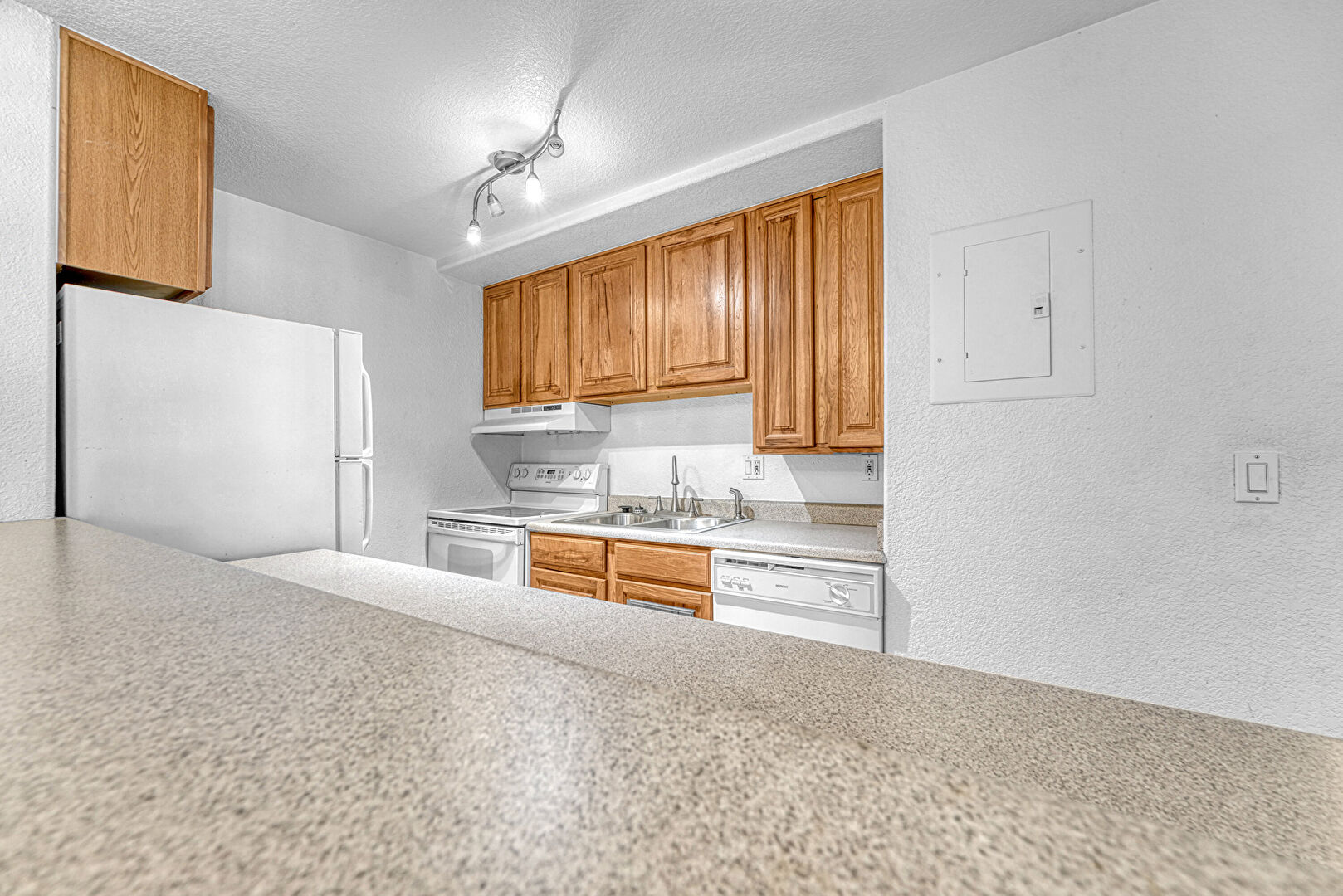 Baseboards Wall, Drywall, Electric Panel, Medium Brown Cabinets, Raised Cabinets, Textured Ceiling, Textured Wall, Tile Floor, Track Lighting, U Shaped Kitchen, Baseboards Wall, Medium Brown Cabinets, Textured Ceiling, Textured Wall, Tile Floor
