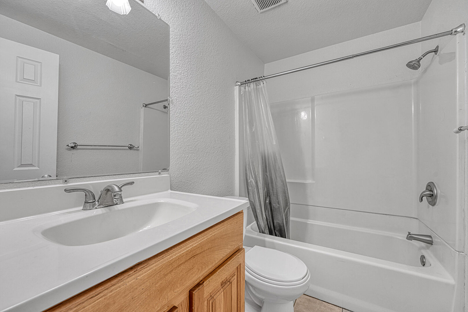 Baseboards Wall, Carpet, Combined Bath Shower, Full Bathroom, Half Bathroom, Textured Ceiling, Textured Wall, Tile Floor, Vanity, Textured Wall, Vent