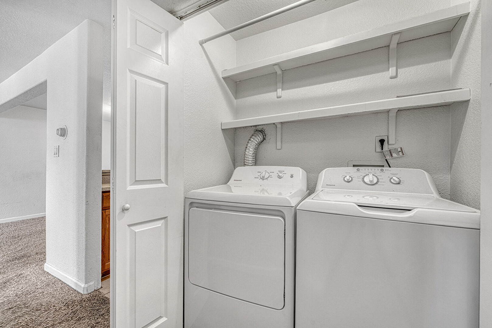 Baseboards Wall, Laundry, Textured Ceiling, Textured Wall, Washer Hookup, Carpet