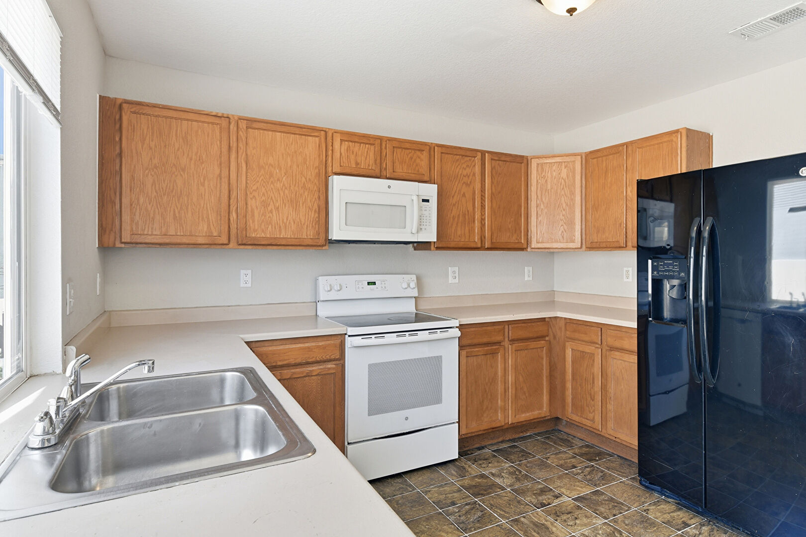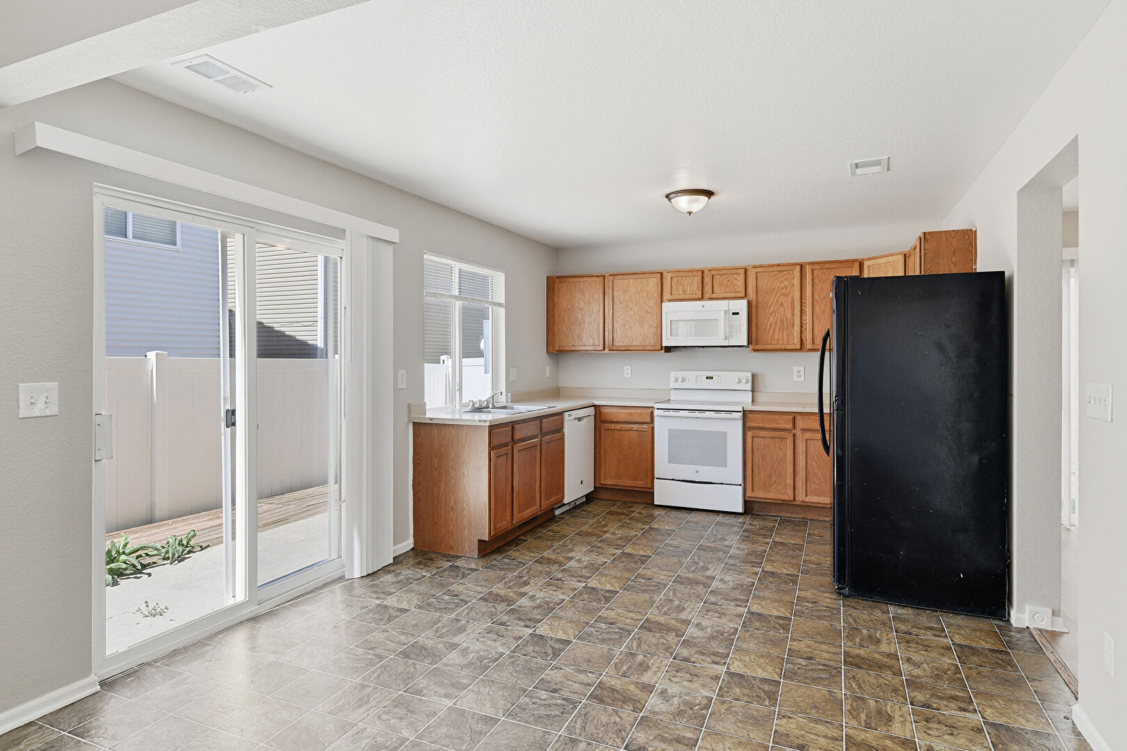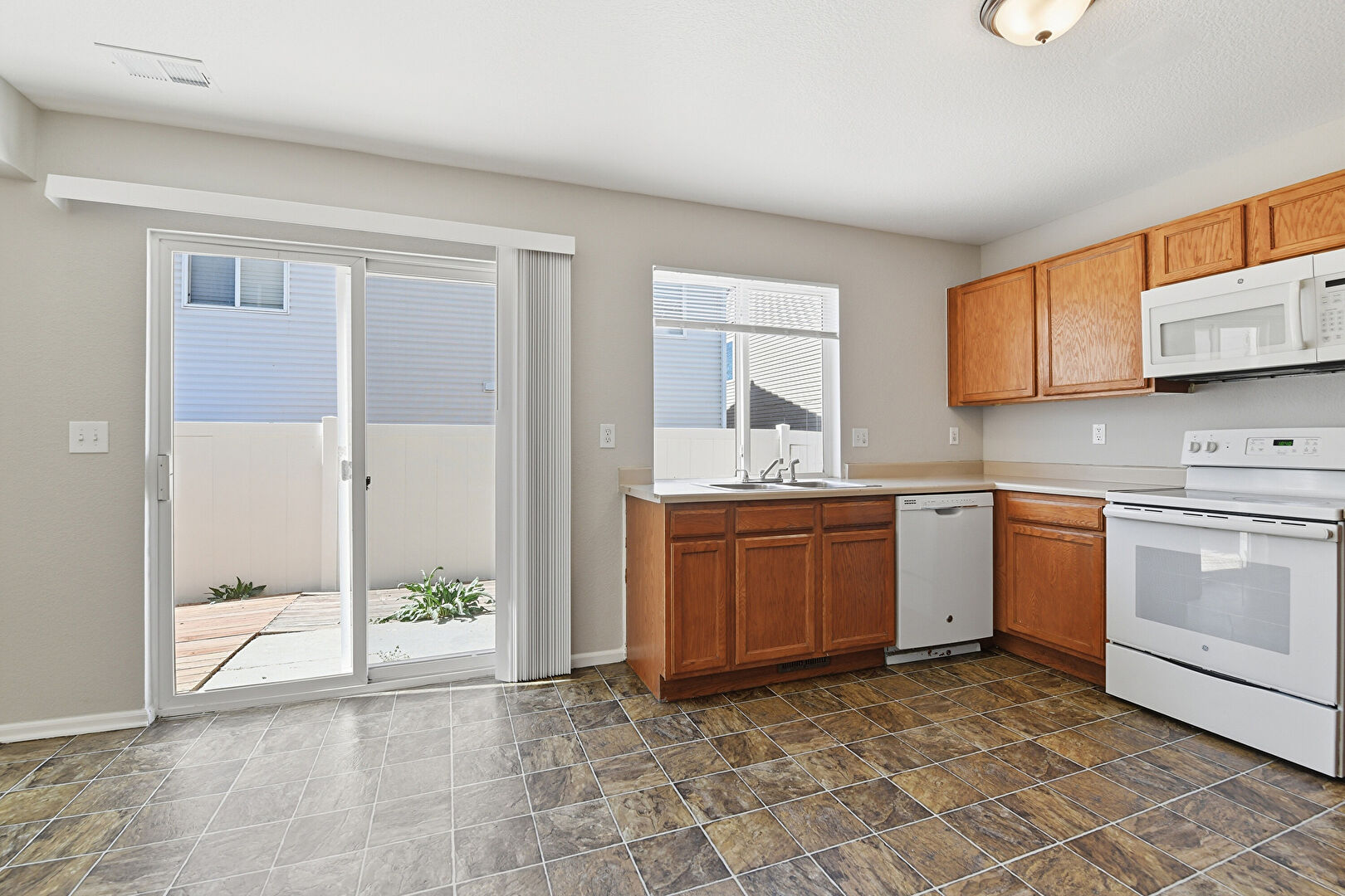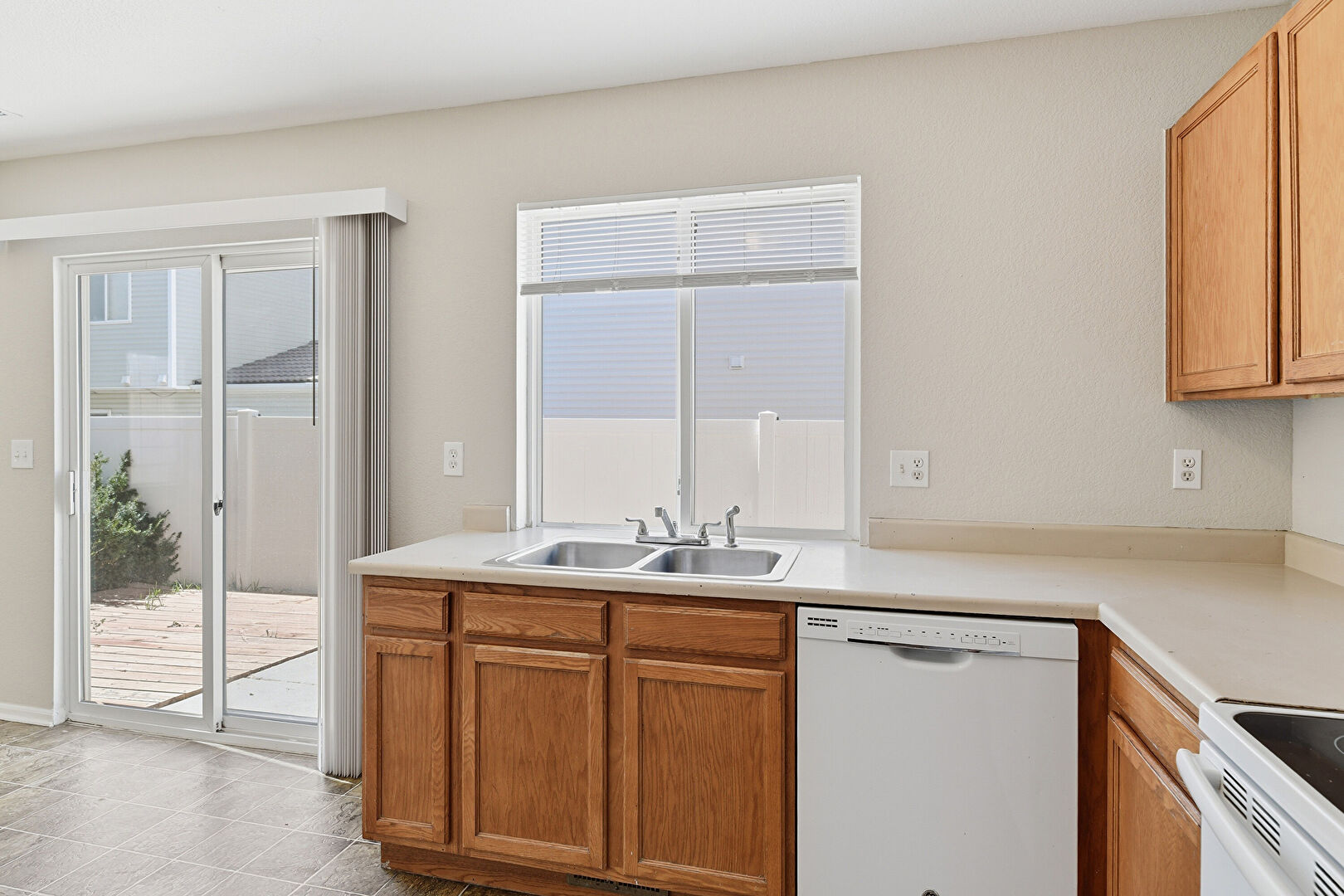 Baseboards Wall, Drywall, Medium Brown Cabinets, Natural Light, Shaker Cabinets, Stone Finish Floor, U Shaped Kitchen, Vent, Drywall, Natural Light, Shaker Cabinets, Stone Finish Floor