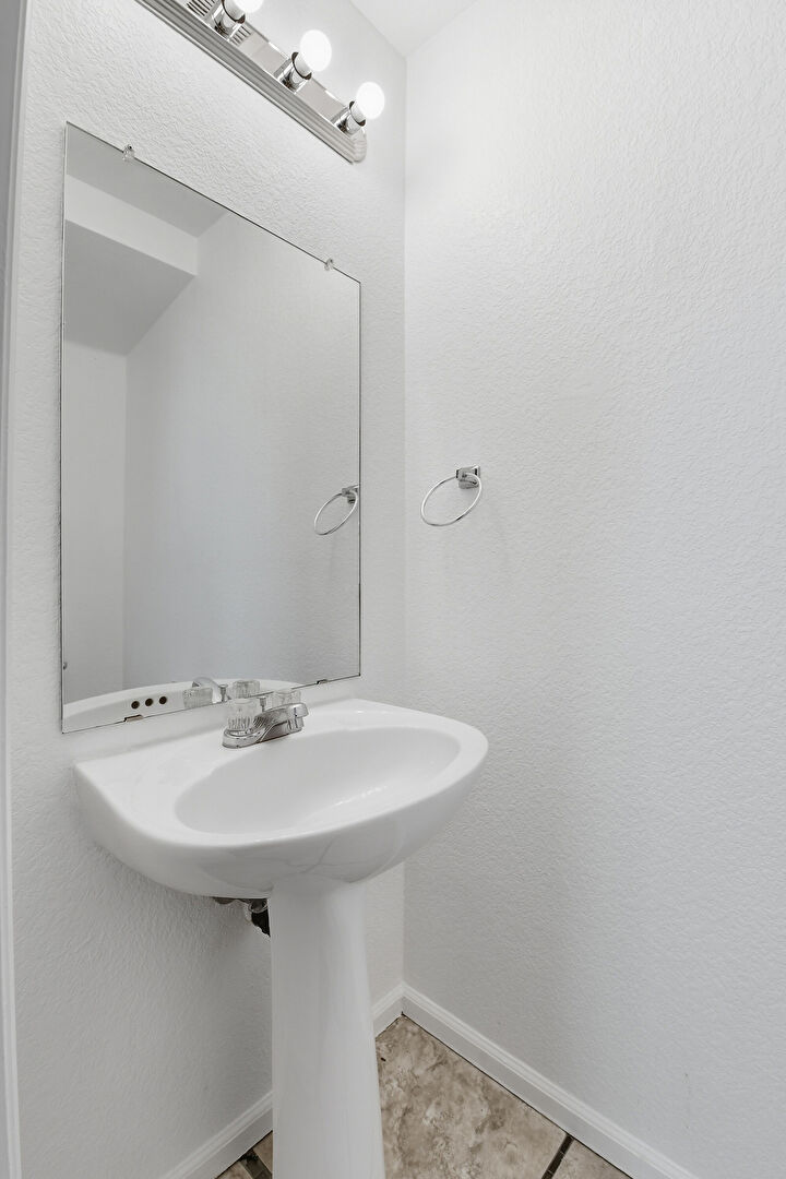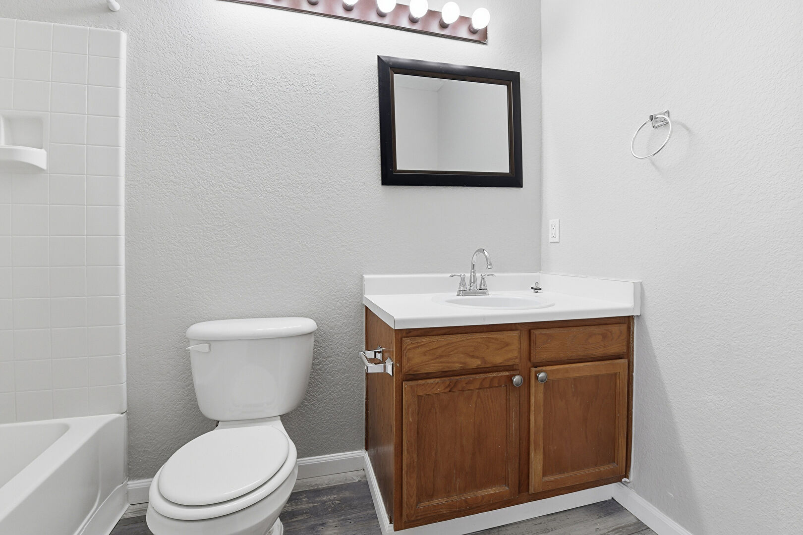 Baseboards Wall, Combined Bath Shower, Full Bathroom, Textured Wall, Vanity, Wood Finish Floor, Full Bathroom, Textured Wall