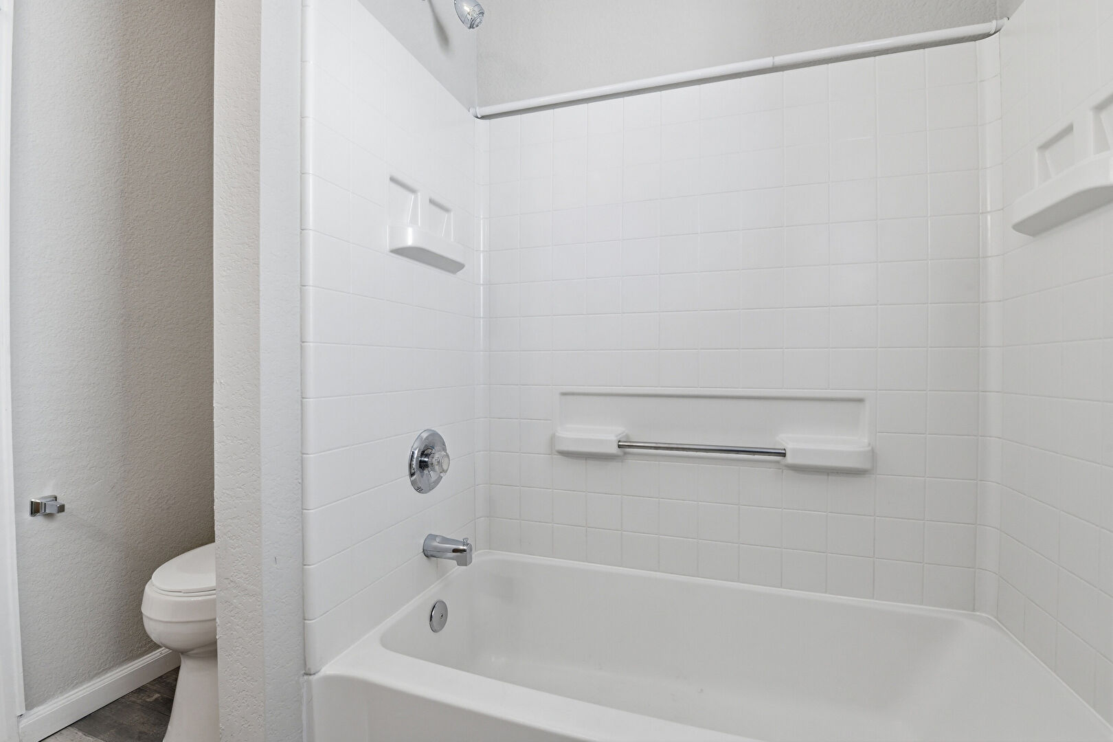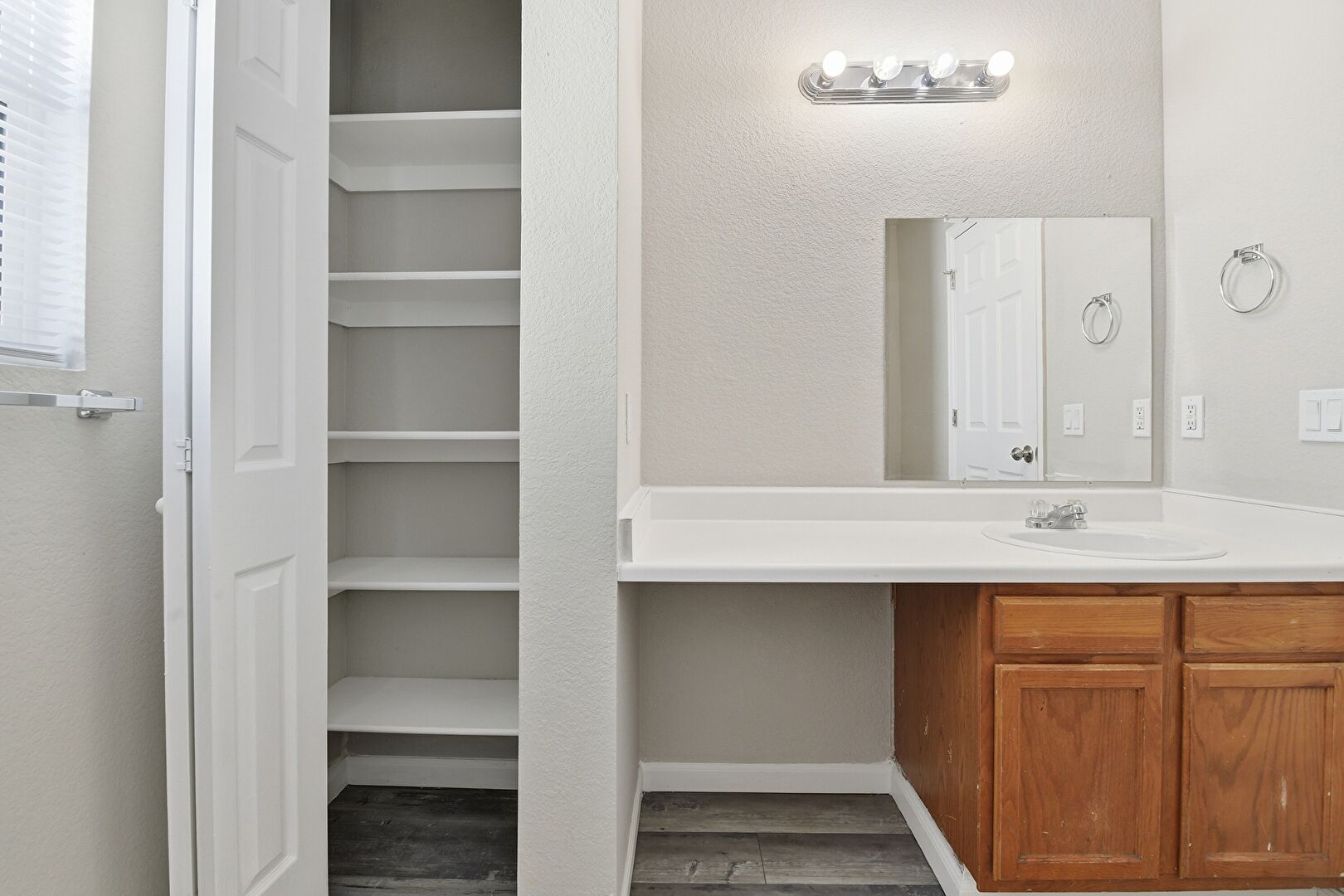 Baseboards Wall, Full Bathroom, Textured Wall, Tile Floor, Vanity, Walk In Closet, Wood Finish Floor, Combined Bath Shower, Textured Wall, Wood Finish Floor