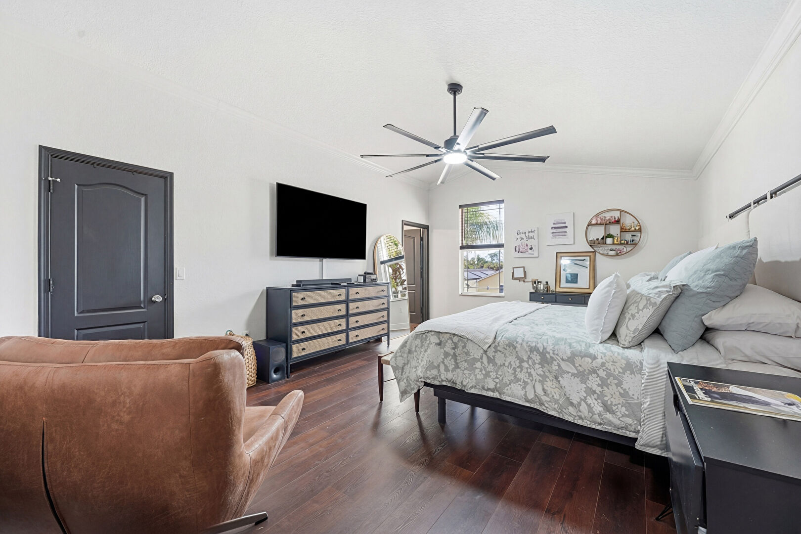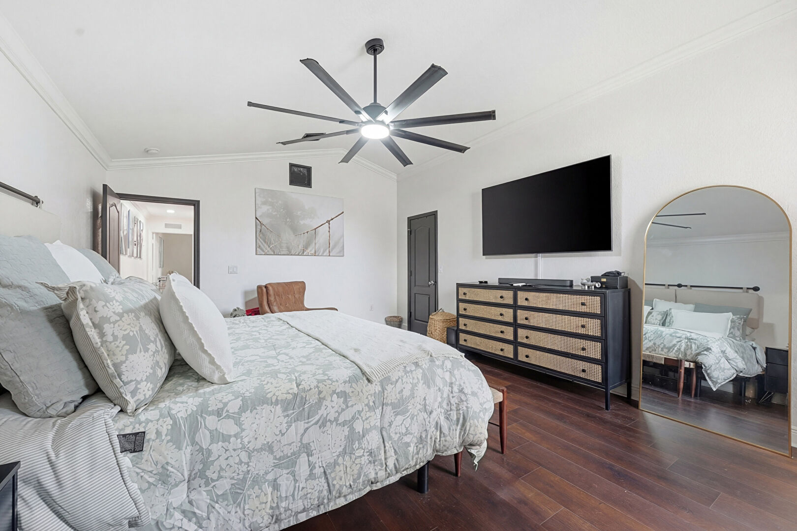 Baseboards Wall, Cathedral Ceiling, Ceiling Fan, Crown Molding, Drywall, Natural Light, Vaulted Ceiling, Wood Finish Floor, Vaulted Ceiling, Wood Finish Floor