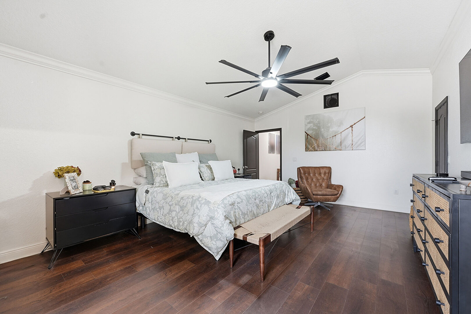 Baseboards Wall, Ceiling Fan, Crown Molding, Drywall, Recessed Lighting, Textured Ceiling, Vent, Wood Finish Floor, Natural Light