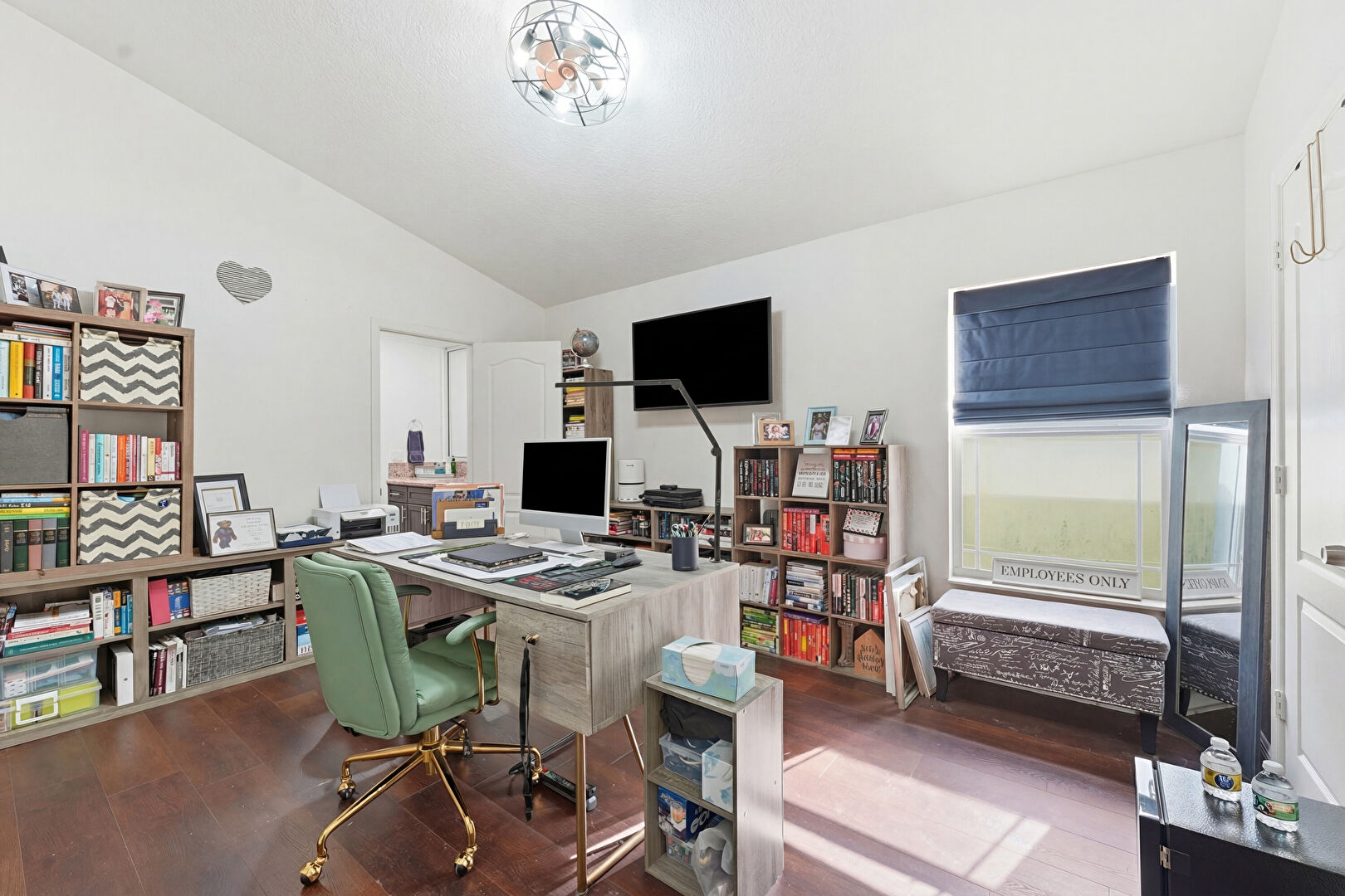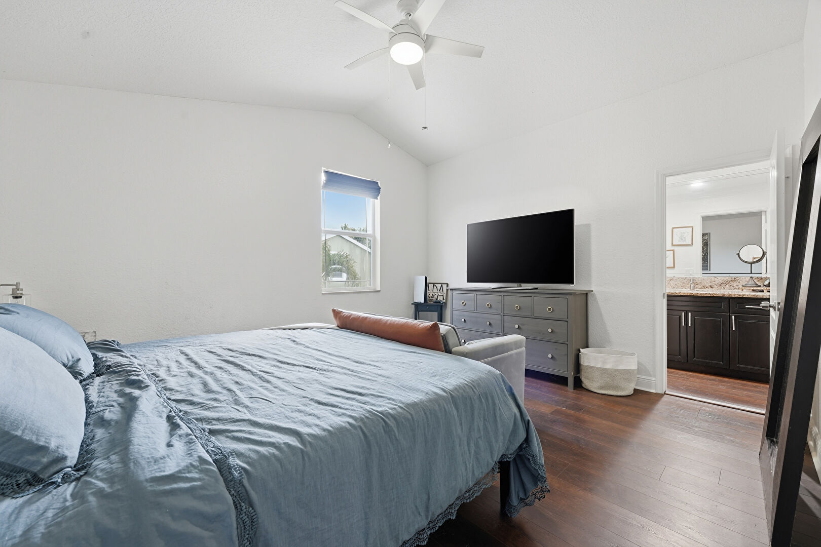 Cathedral Ceiling, Ceiling Fan, Drywall, Ensuite Bathroom, Natural Light, Office Area, Textured Ceiling, Vaulted Ceiling, Vent, Wood Finish Floor, Baseboards Wall, Vaulted Ceiling