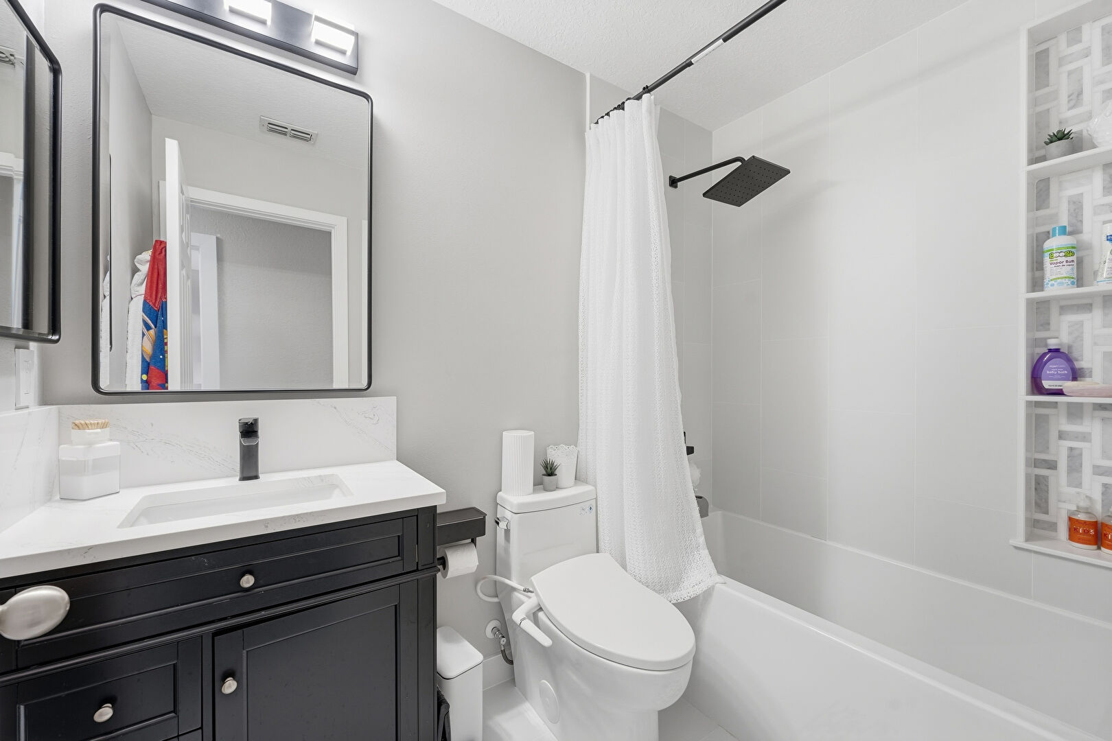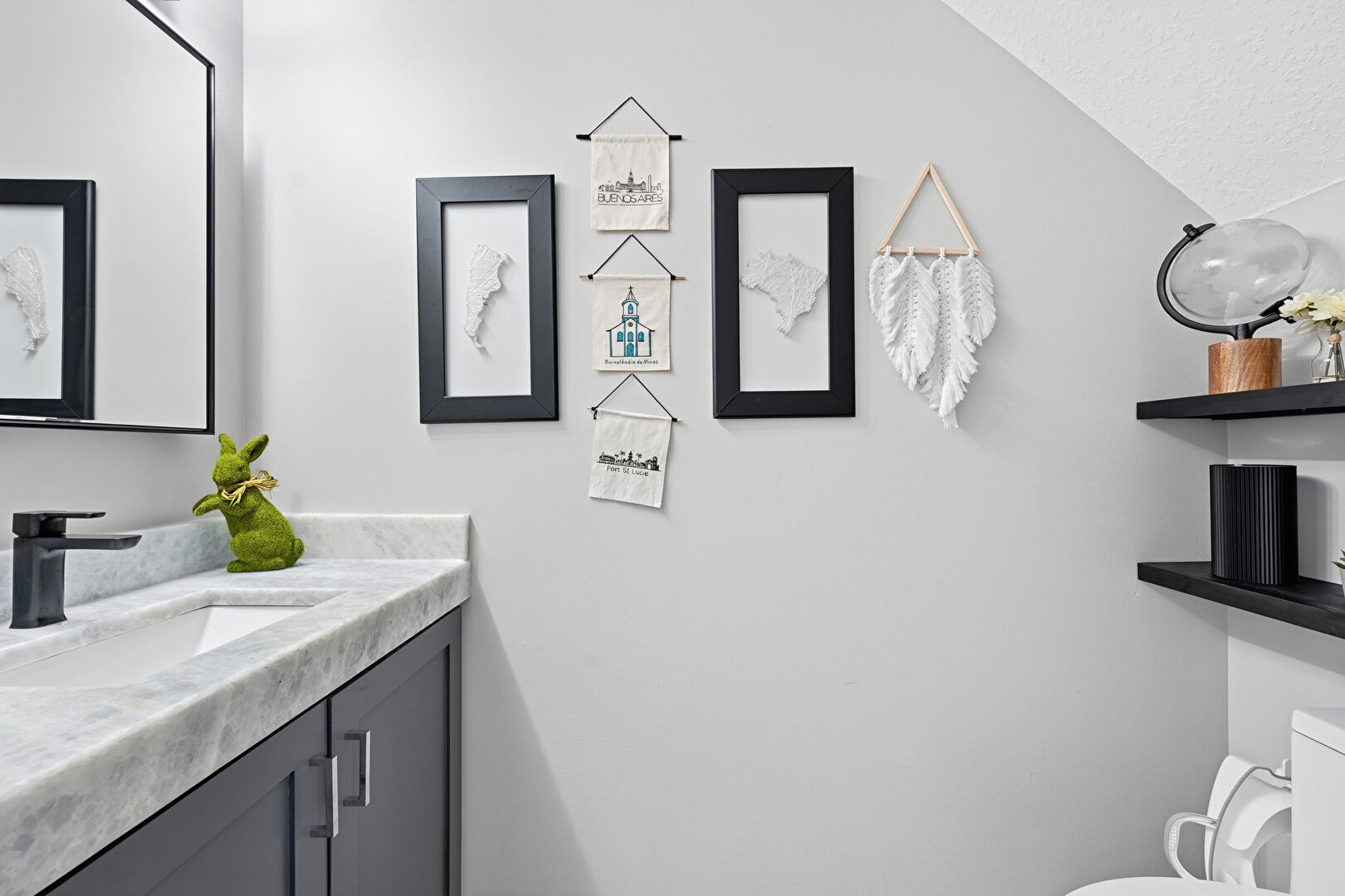 Drywall, Full Bathroom, Half Bathroom, Textured Ceiling, Vanity, Vaulted Ceiling, Vent, Combined Bath Shower, Vanity