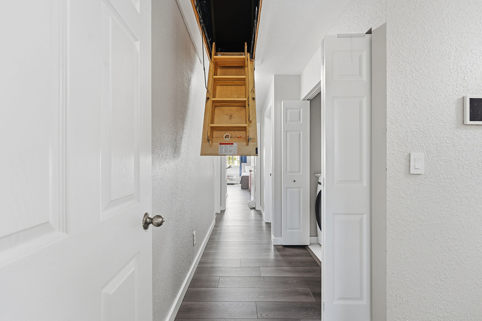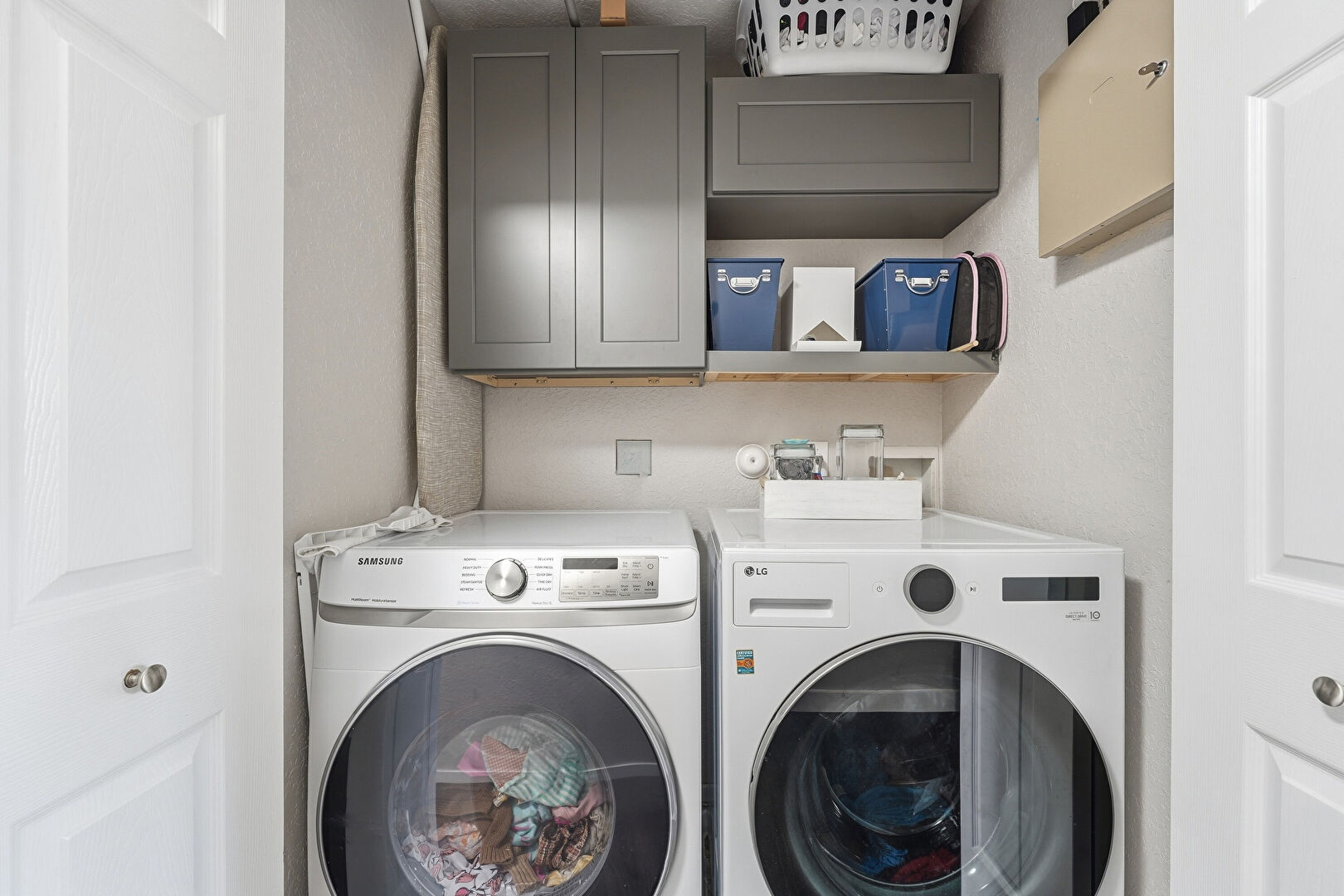 Baseboards Wall, Laundry, Natural Light, Textured Wall, Wood Finish Floor, Washer Dryer