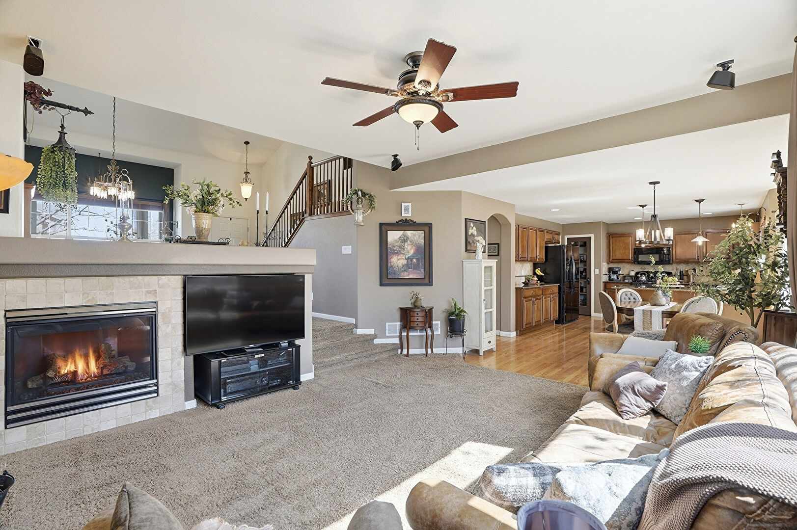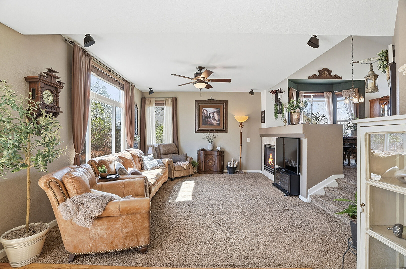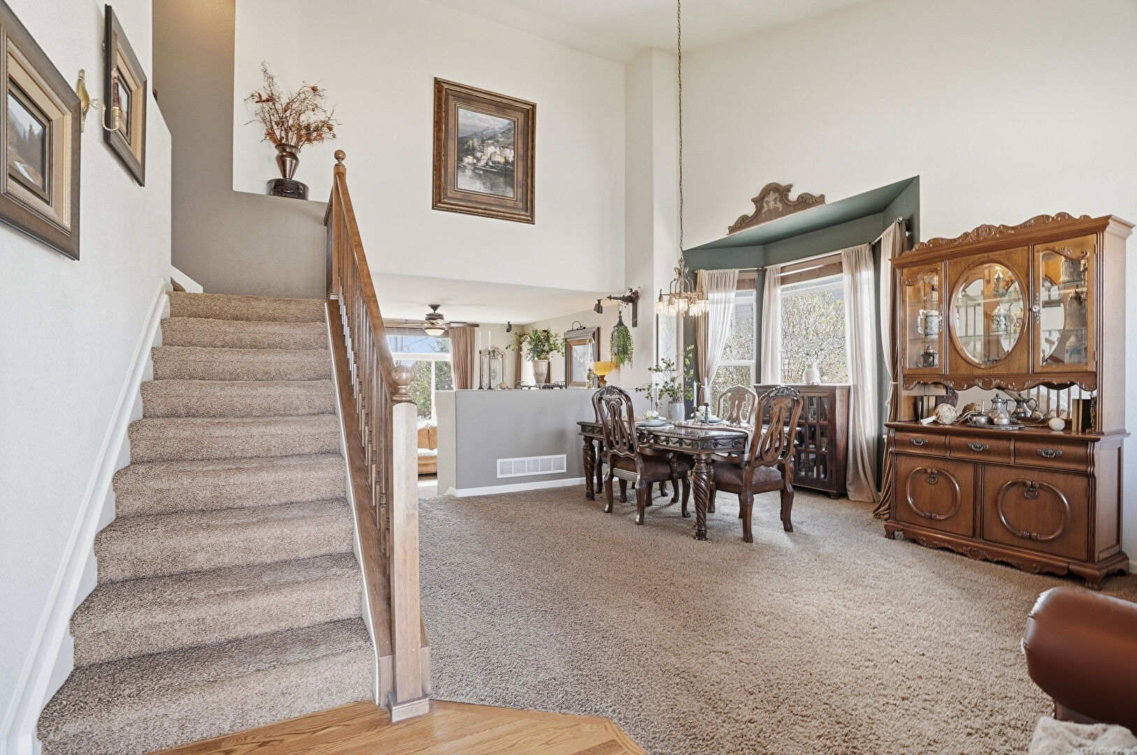 Arched Walkways, Baseboards Wall, Carpet, Ceiling Fan, Drywall, Fireplace, High Ceiling, L Shaped Kitchen, Natural Light, Notable Chandelier, Recessed Lighting, Stairs, Vaulted Ceiling, Vent, Wood Finish Floor, Ceiling Fan, Drywall, High Ceiling, Natural Light, Notable Chandelier, Recessed Lighting, Stairs, Vaulted Ceiling, Vent