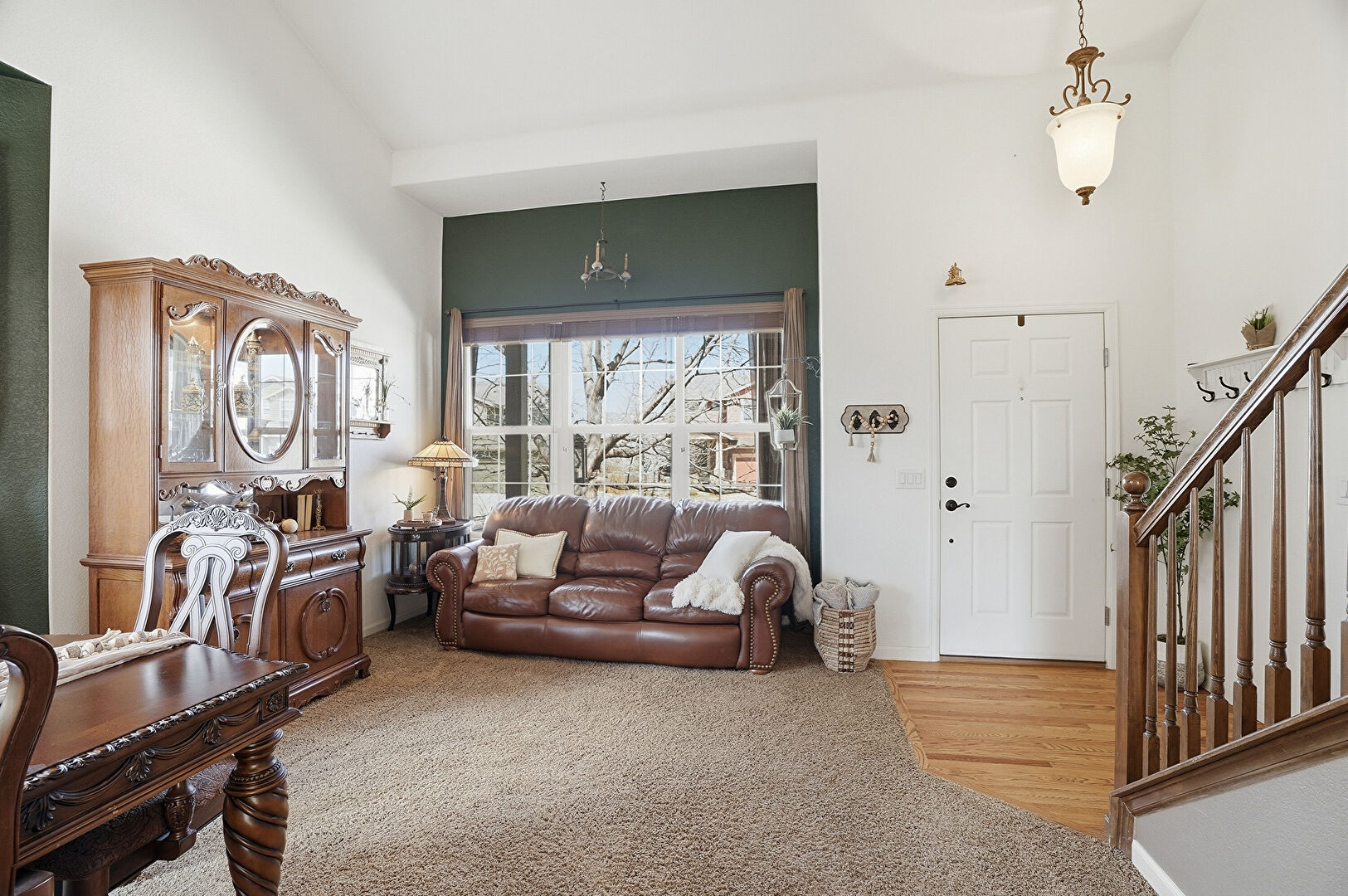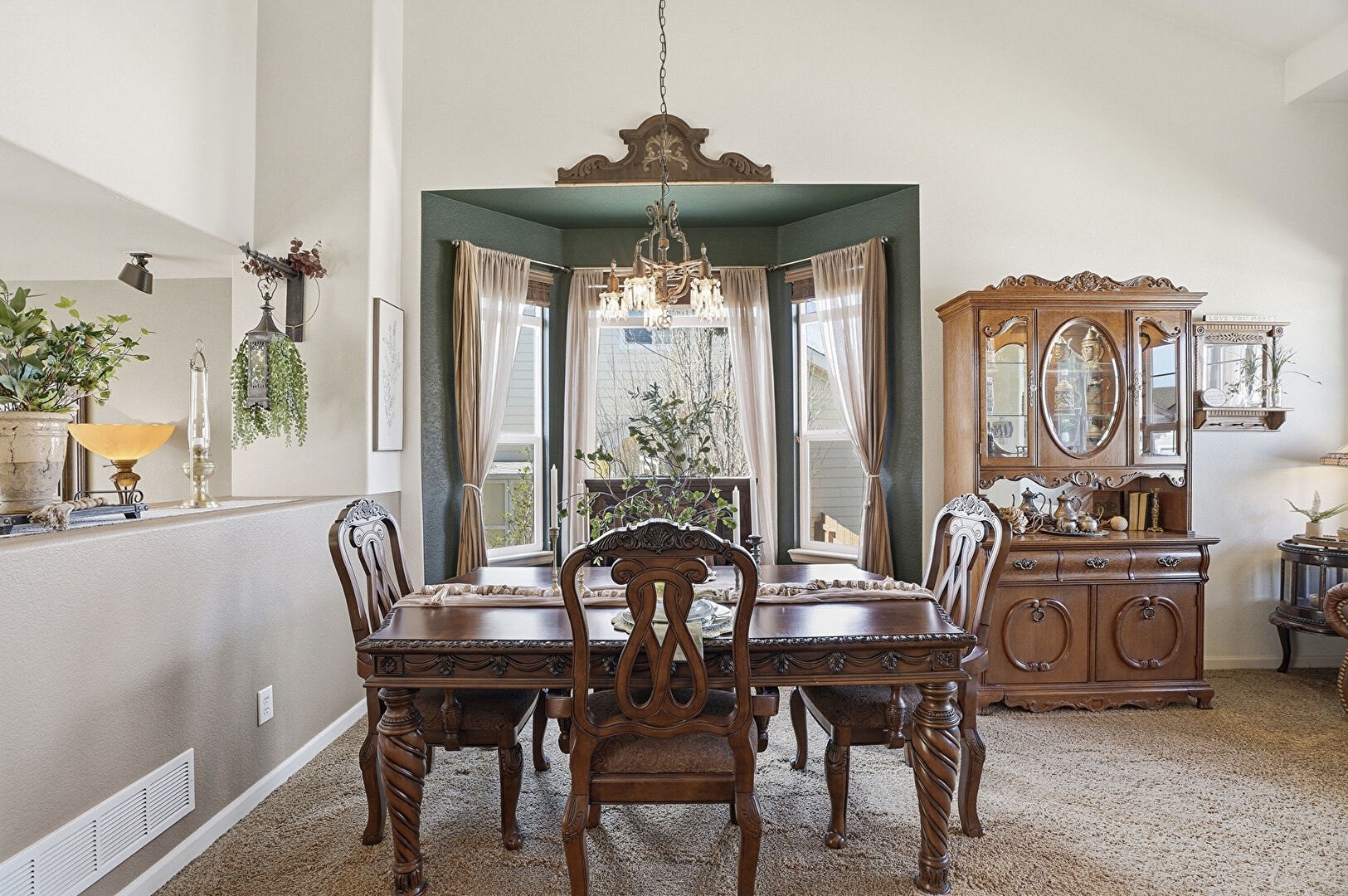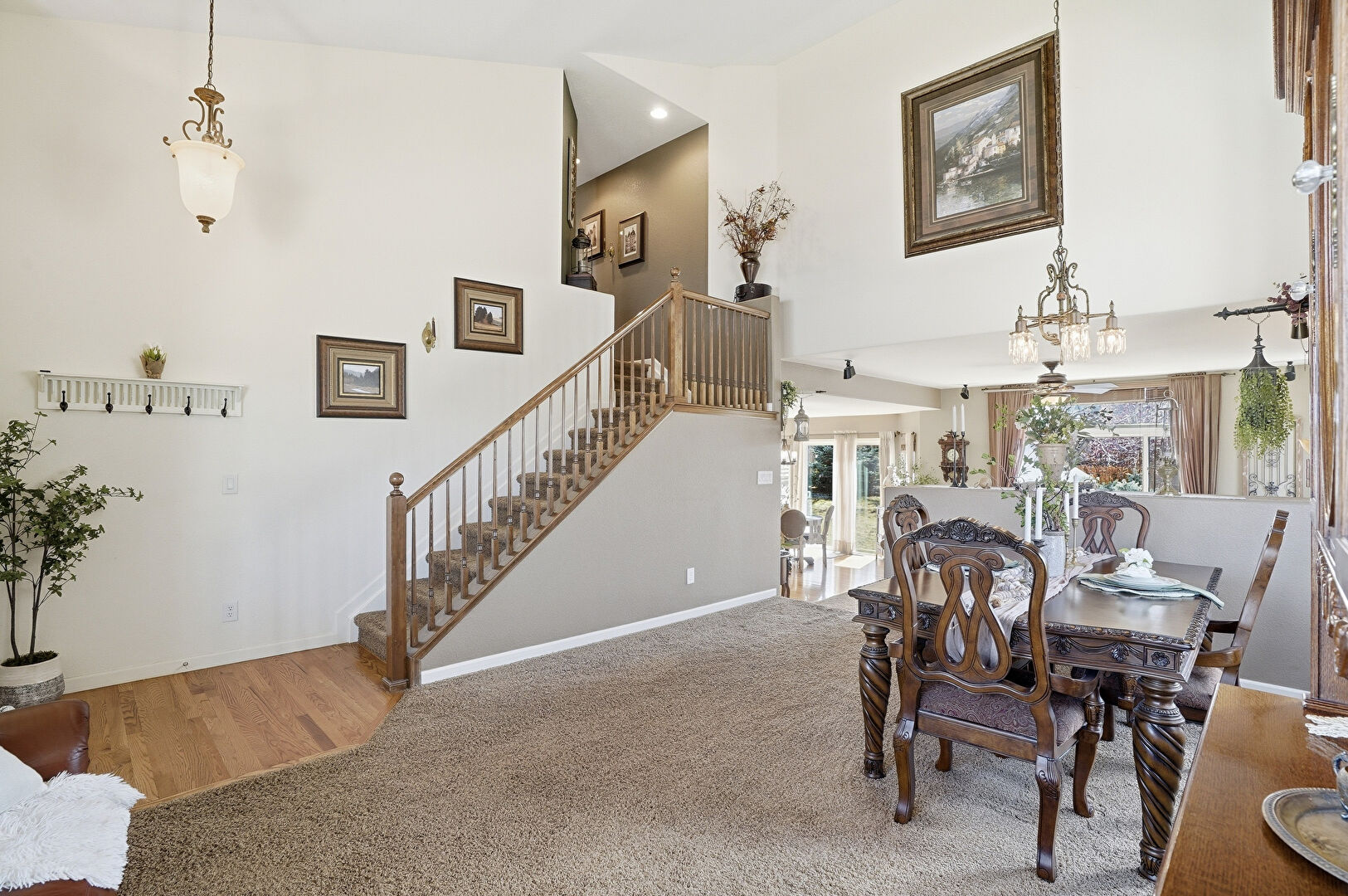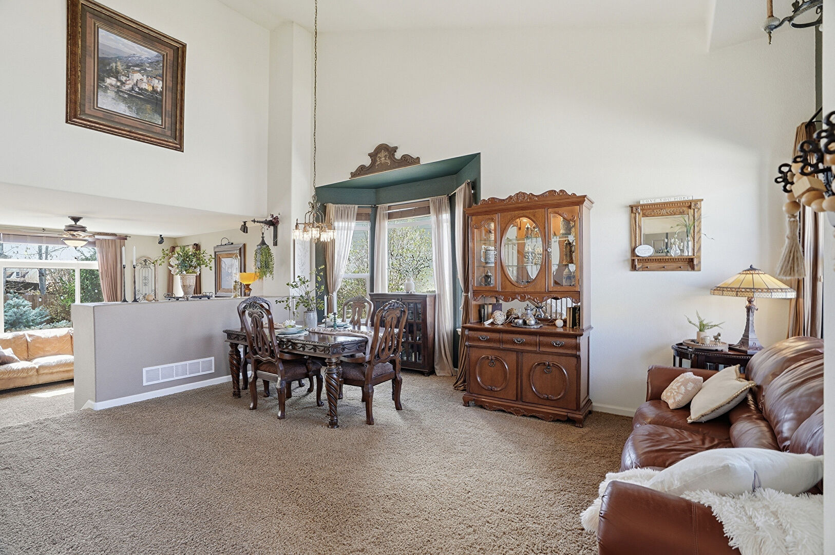 Arched Walkways, Baseboards Wall, Carpet, Ceiling Fan, Drywall, Fireplace, High Ceiling, L Shaped Kitchen, Natural Light, Notable Chandelier, Recessed Lighting, Stairs, Vaulted Ceiling, Vent, Wood Finish Floor, Ceiling Fan, Drywall, High Ceiling, Natural Light, Notable Chandelier, Recessed Lighting, Stairs, Vaulted Ceiling, Vent