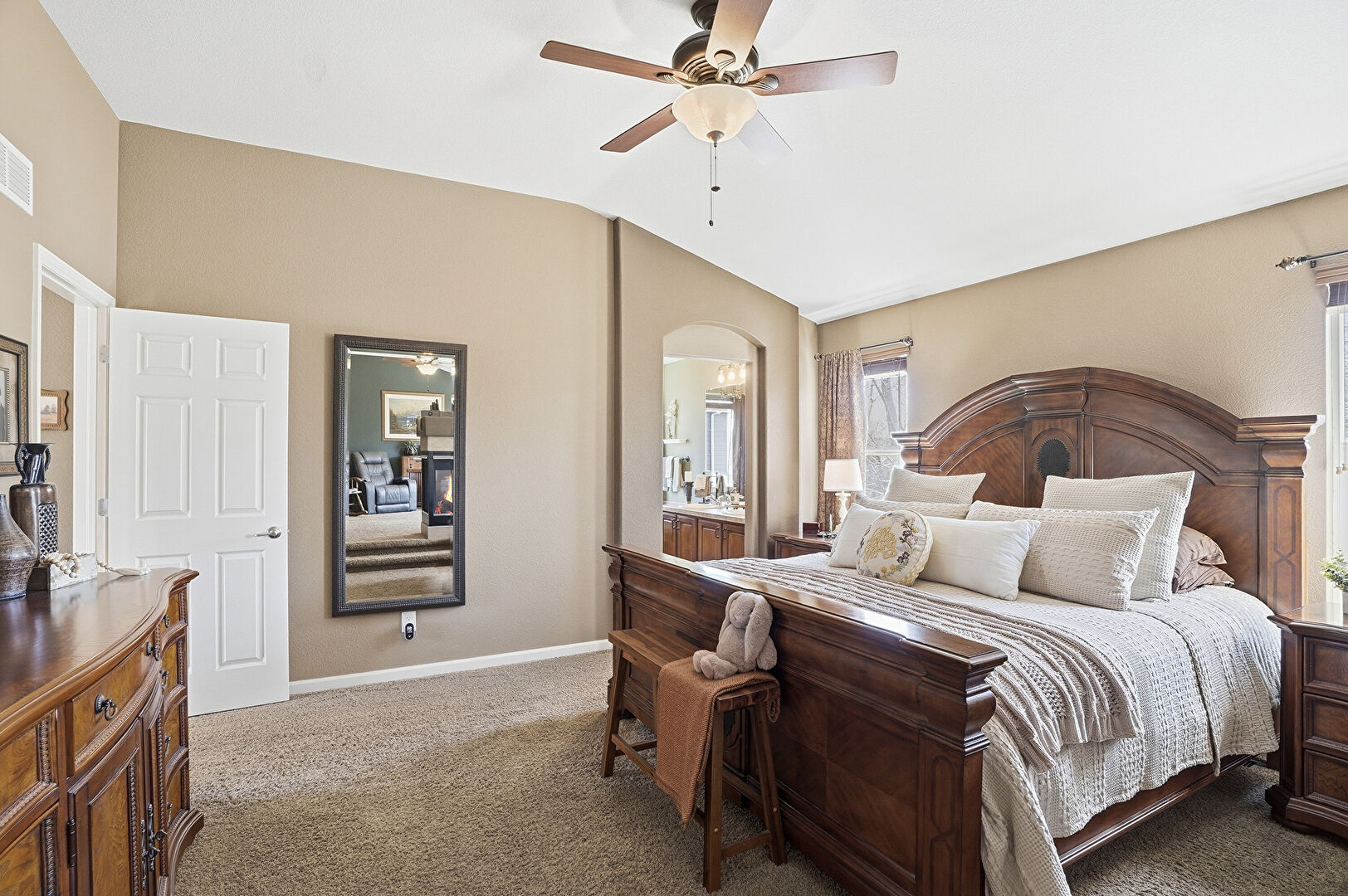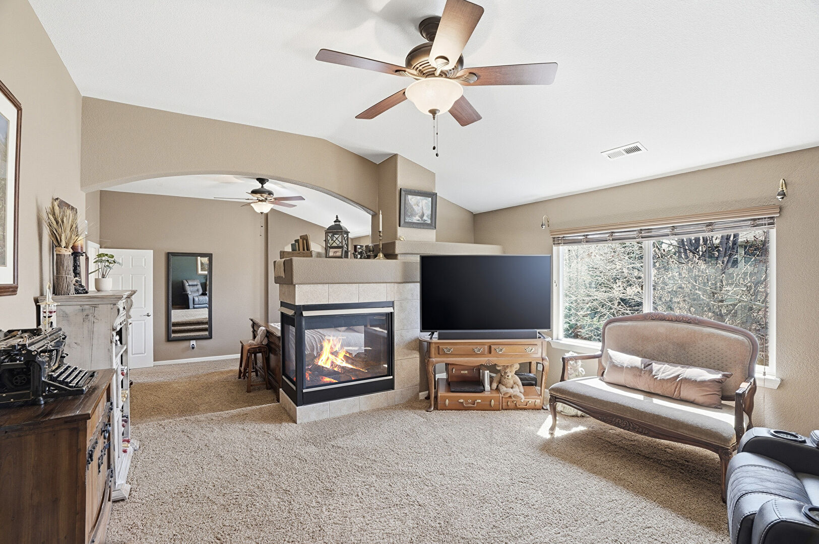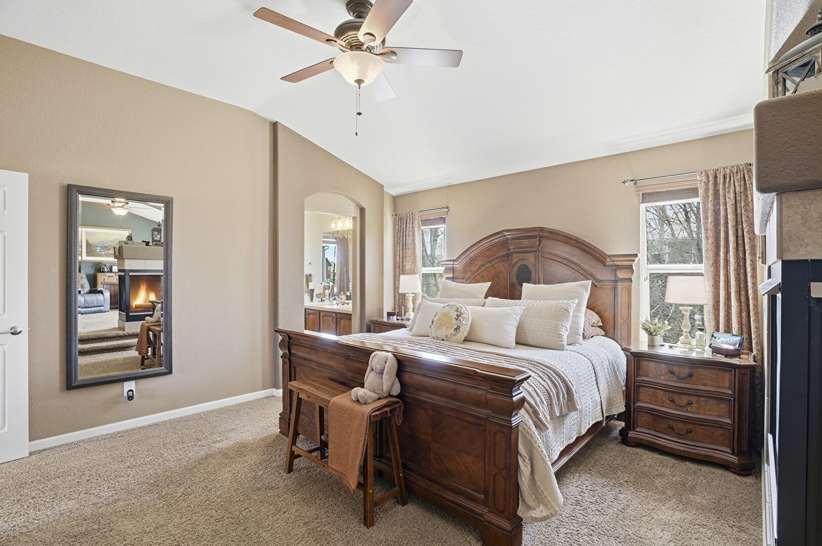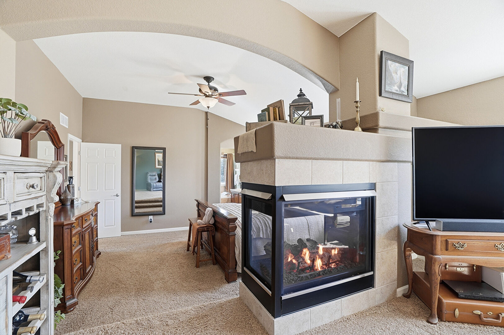 Arched Walkways, Baseboards Wall, Carpet, Cathedral Ceiling, Ceiling Fan, Drywall, Ensuite Bathroom, Fireplace, Natural Light, Smoke Carbon Monoxide Detector, Vaulted Ceiling, Vent, Baseboards Wall, Carpet, Drywall, Natural Light, Vaulted Ceiling