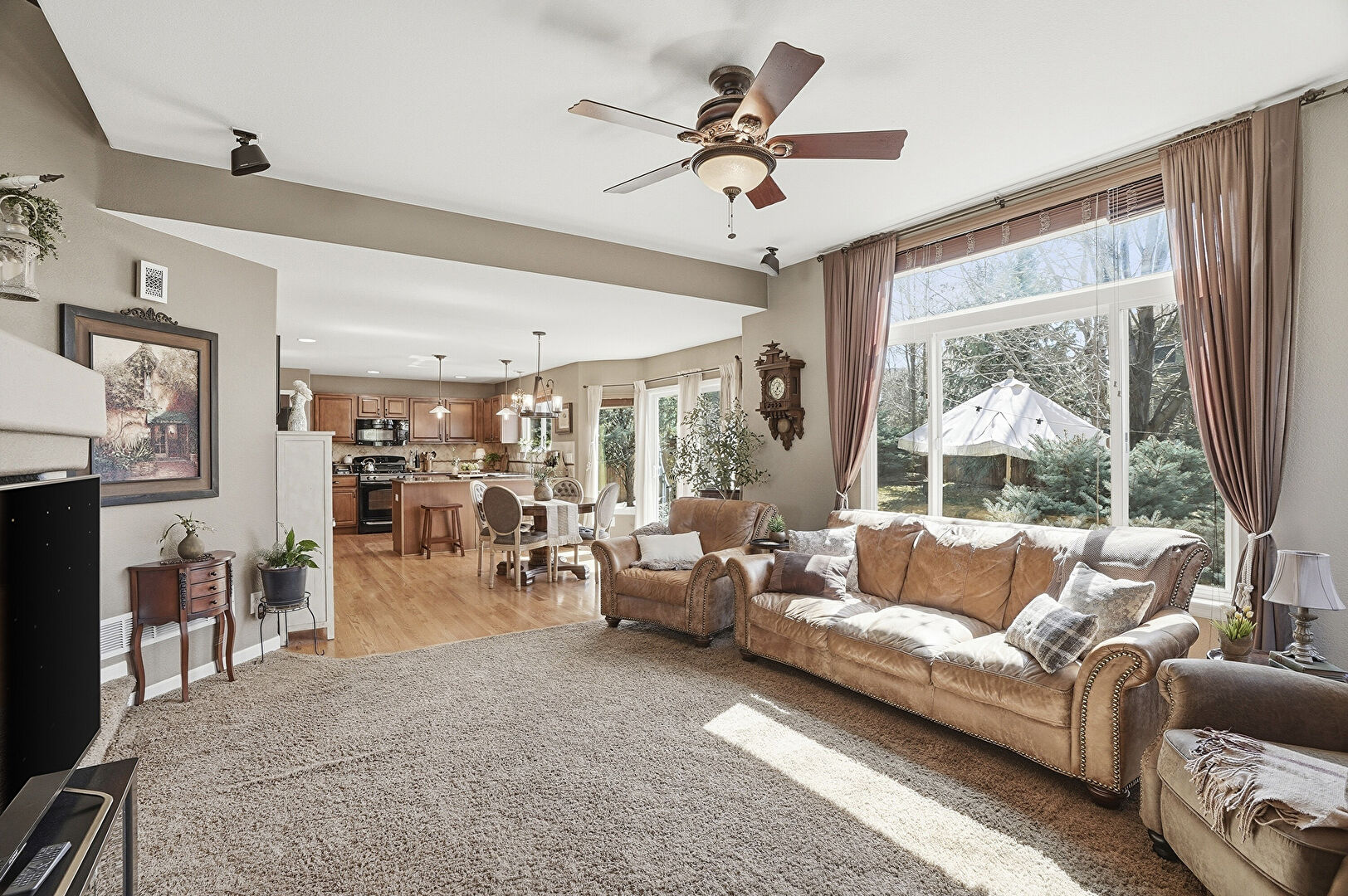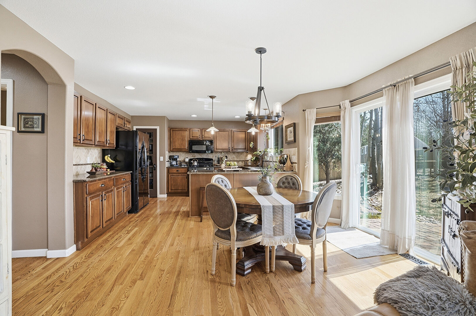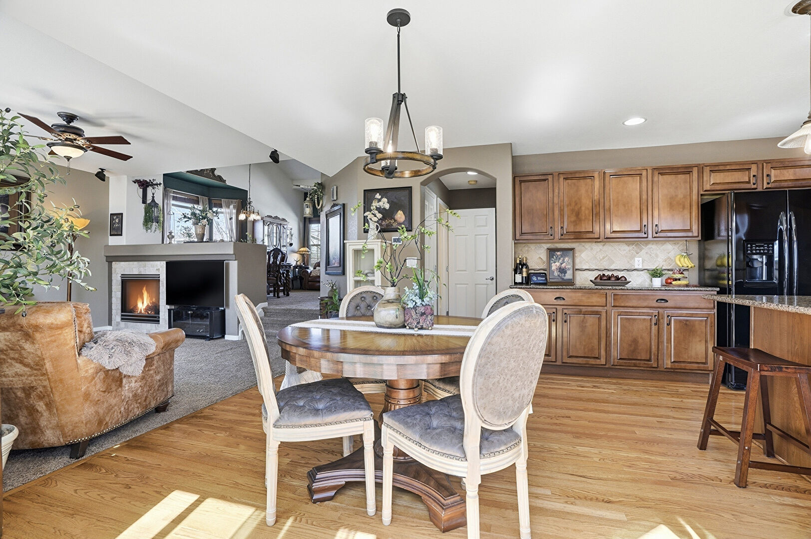 Arched Walkways, Baseboards Wall, Ceiling Fan, Drywall, Fireplace, G Shaped Kitchen, Natural Light, Notable Chandelier, Recessed Lighting, Vaulted Ceiling, Vent, Wood Finish Floor, Baseboards Wall, Ceiling Fan, Drywall, Notable Chandelier, U Shaped Kitchen