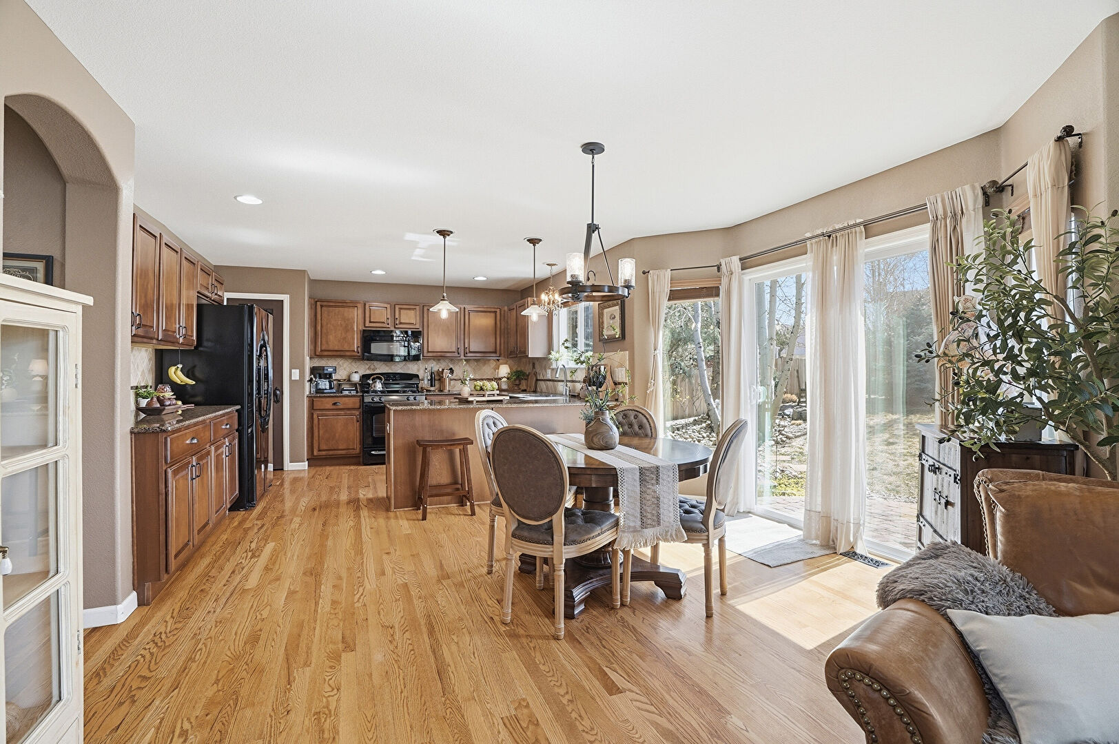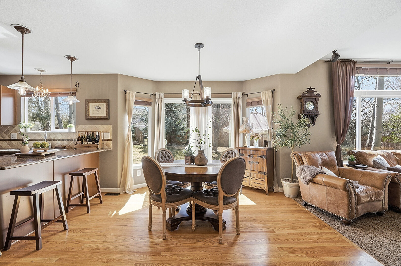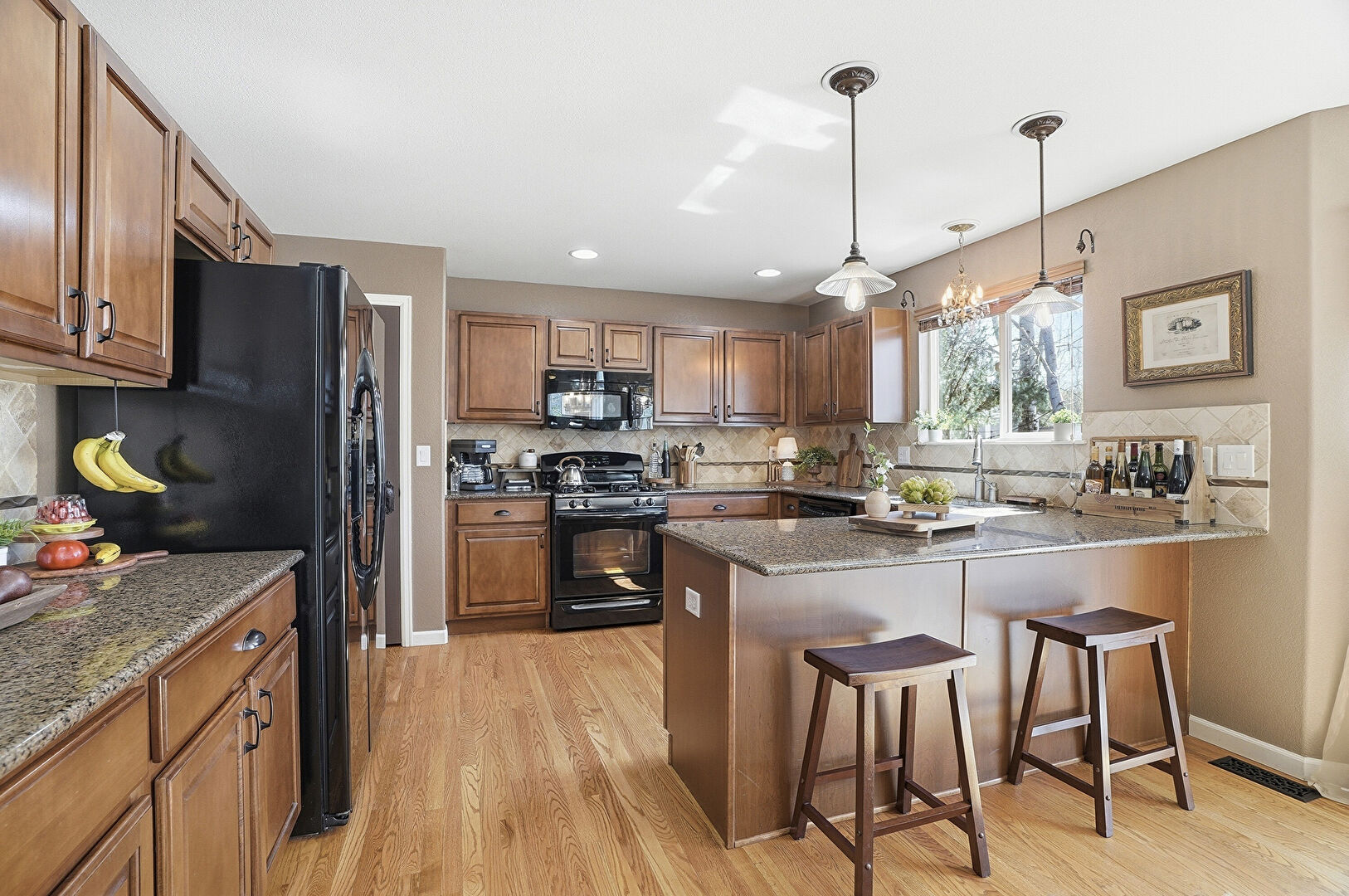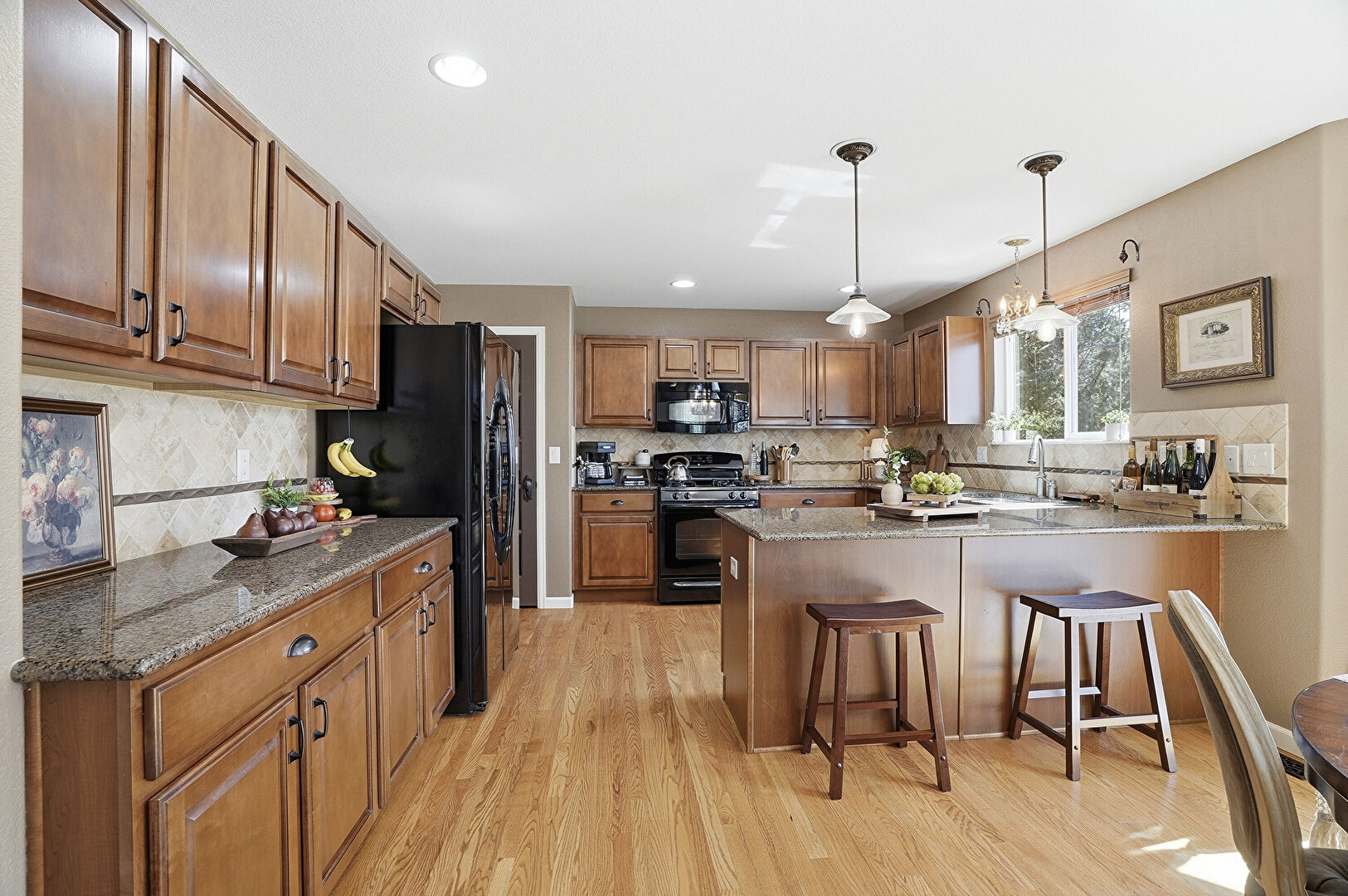 Baseboards Wall, Drywall, G Shaped Kitchen, Kitchen Bar, Kitchen Peninsula, Medium Brown Cabinets, Natural Light, Notable Chandelier, Pendant Lighting, Raised Cabinets, Recessed Lighting, Stone Countertops, Vent, Wood Finish Floor, Kitchen Bar, Medium Brown Cabinets, Pendant Lighting, Stone Countertops