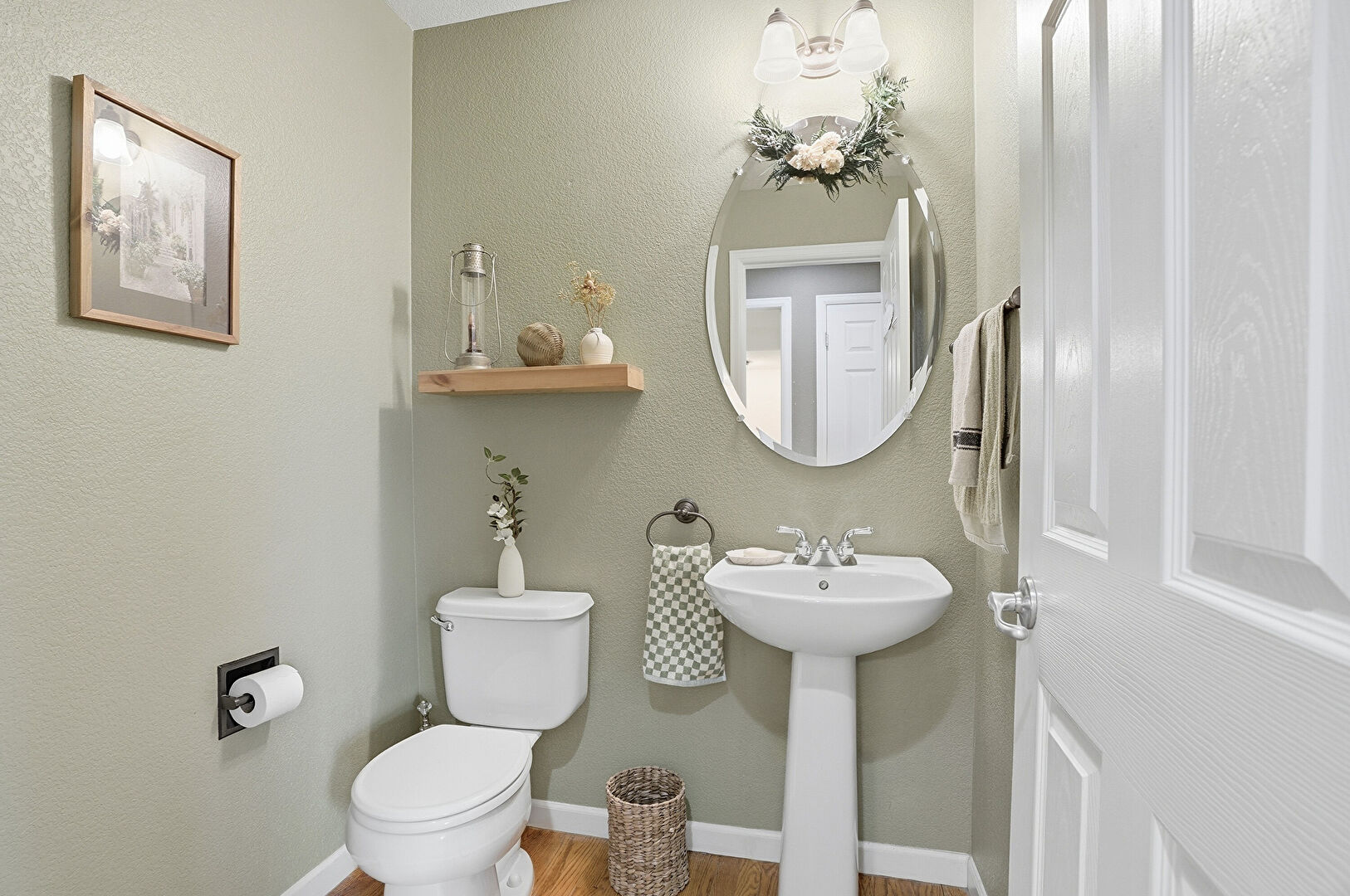 Baseboards Wall, Combined Bath Shower, Natural Light, Textured Wall, Tile Floor, Vanity, Vent, Wood Finish Floor, Full Bathroom, Half Bathroom