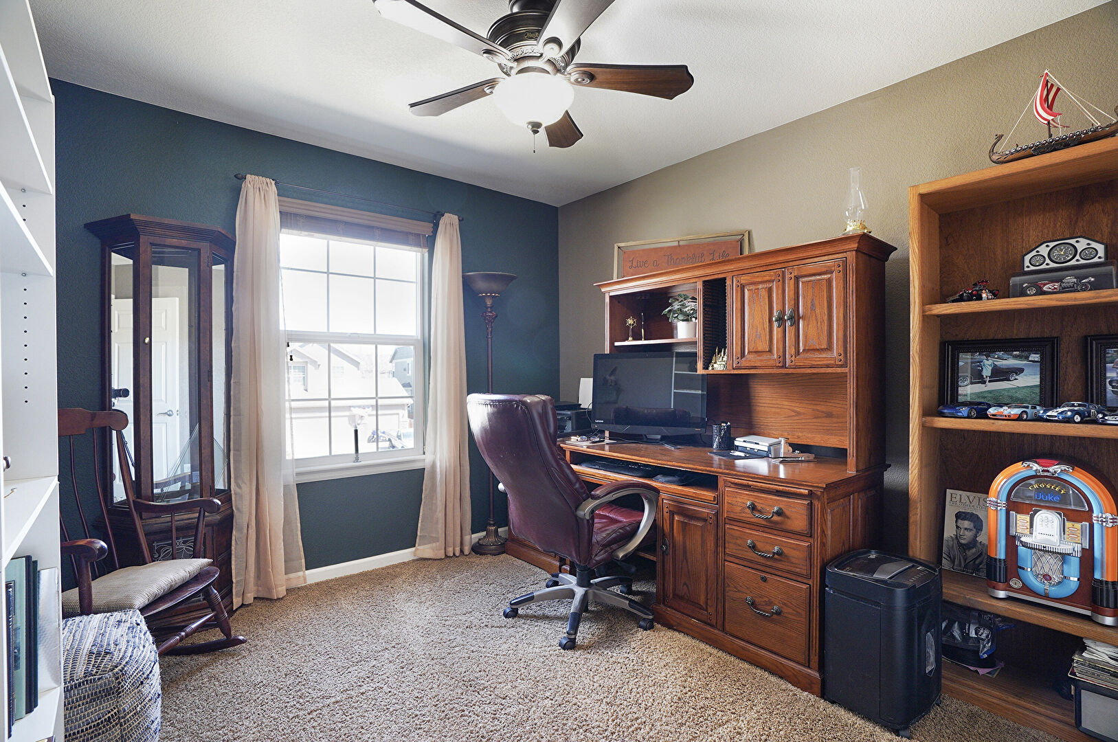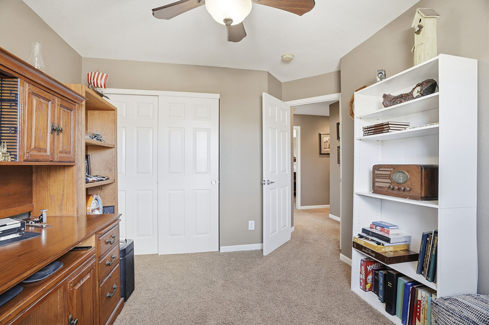 Baseboards Wall, Carpet, Ceiling Fan, Drywall, Natural Light, Office Area, Smoke Carbon Monoxide Detector, Baseboards Wall, Office Area