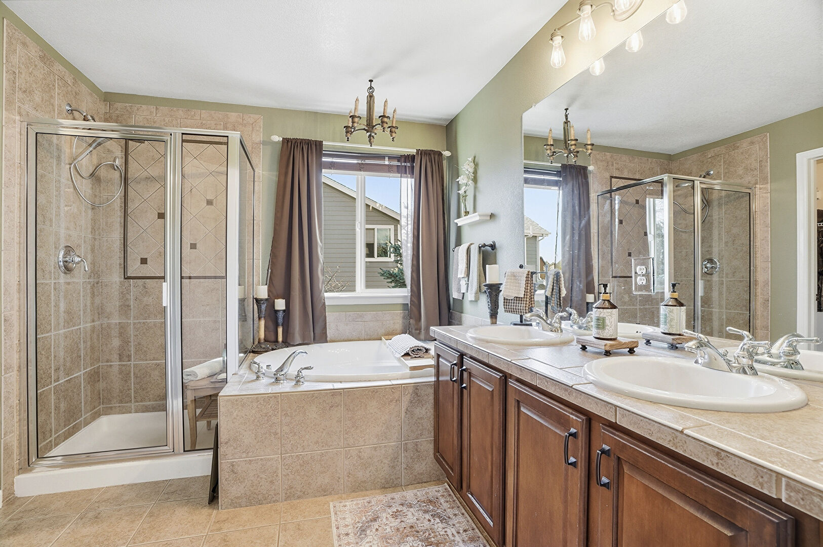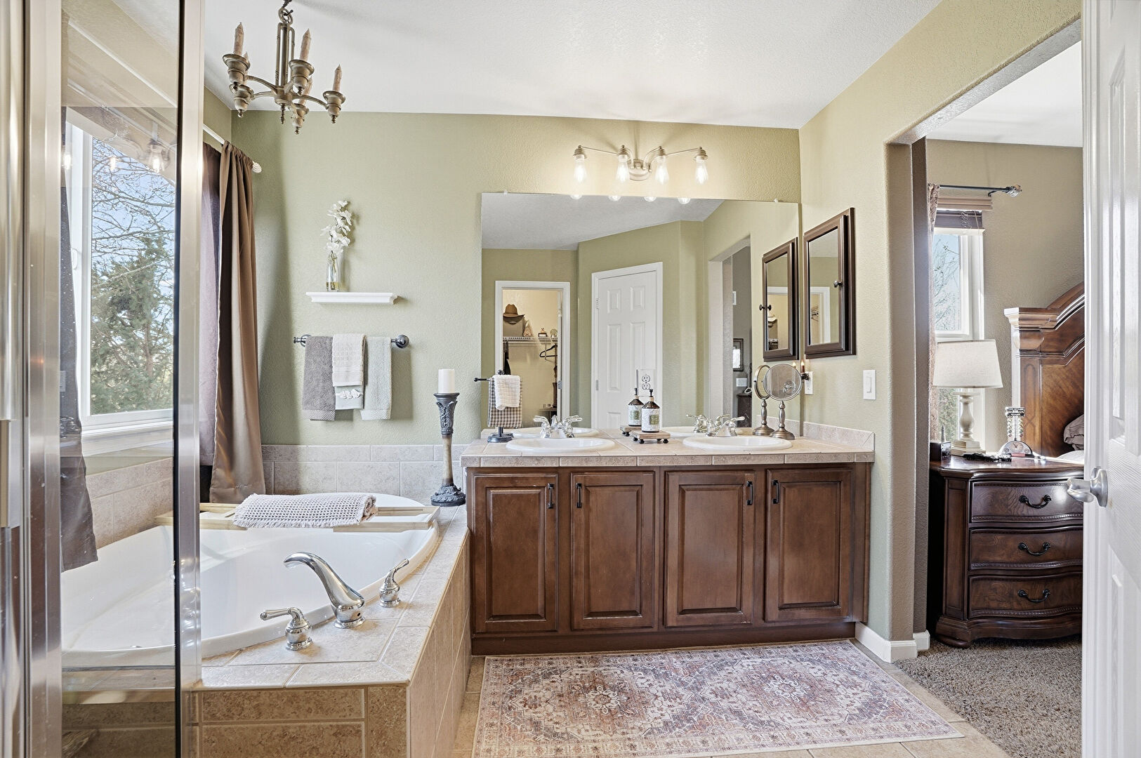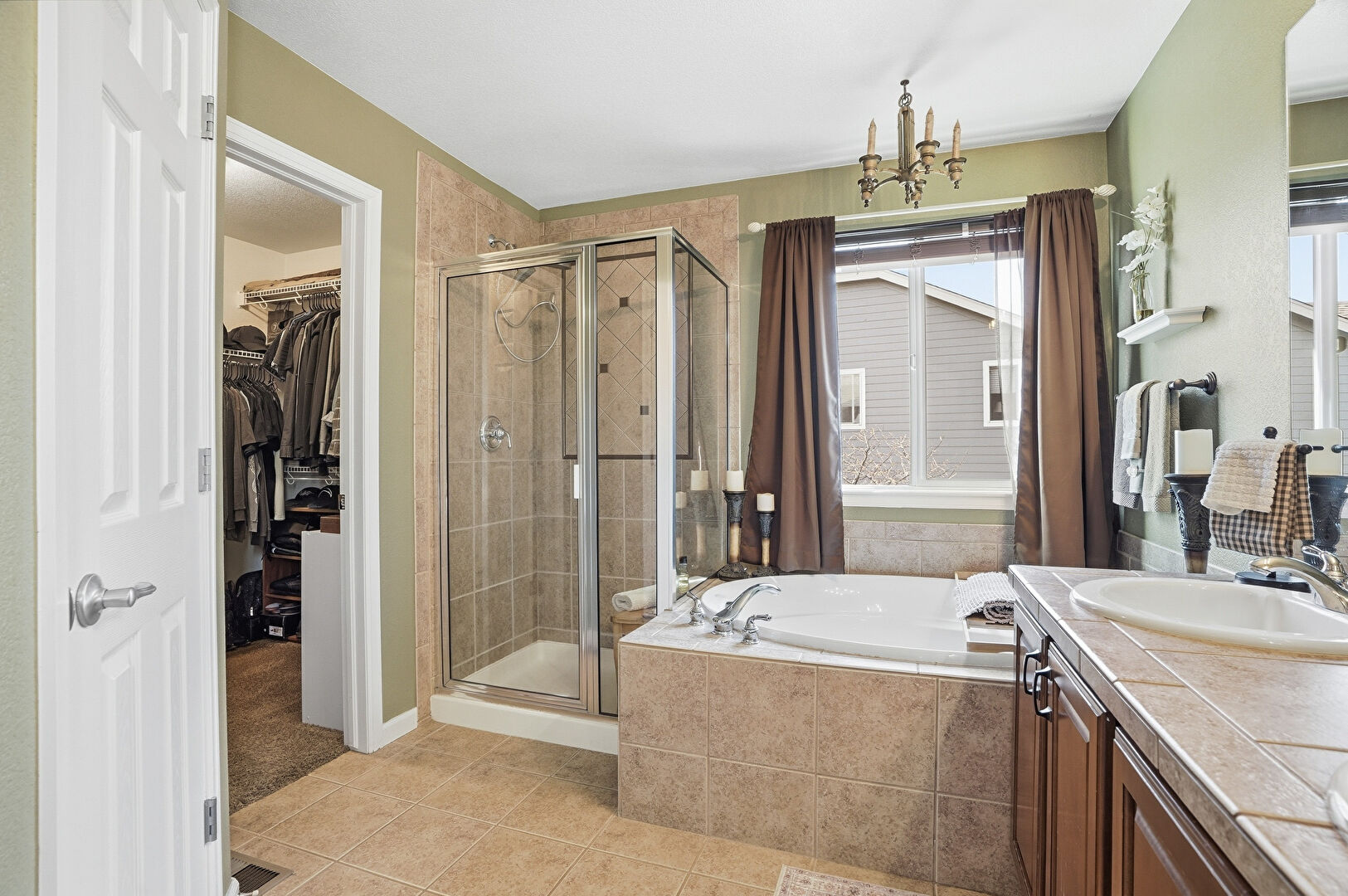 Baseboards Wall, Double Vanity, Drywall, Full Bathroom, Natural Light, Notable Chandelier, Tile Floor, Vanity, Walk In Closet, Baseboards Wall, Double Vanity, Full Bathroom
