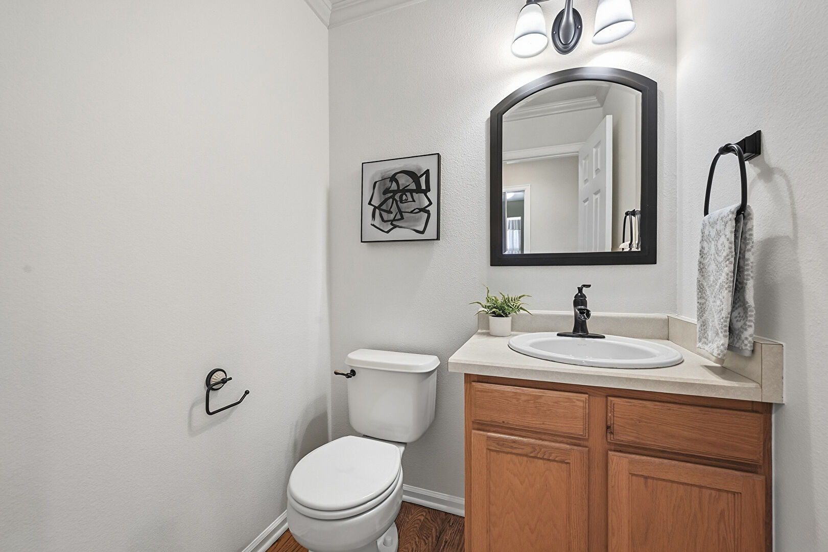 Baseboards Wall, Combined Bath Shower, Crown Molding, Drywall, Full Bathroom, Half Bathroom, Tile Floor, Wood Finish Floor, Recessed Lighting, Vanity