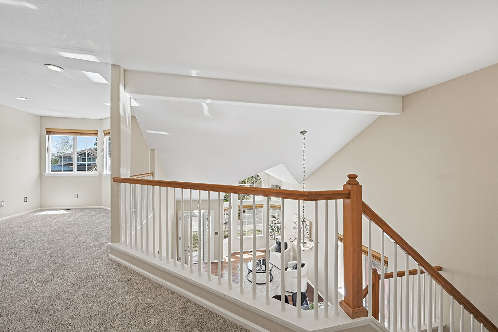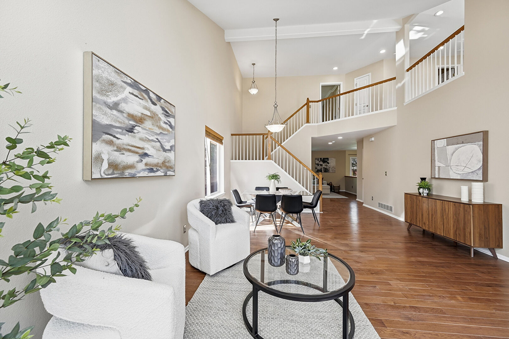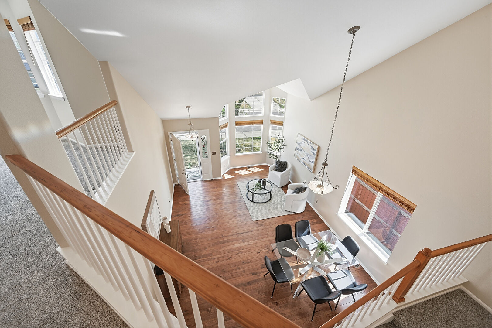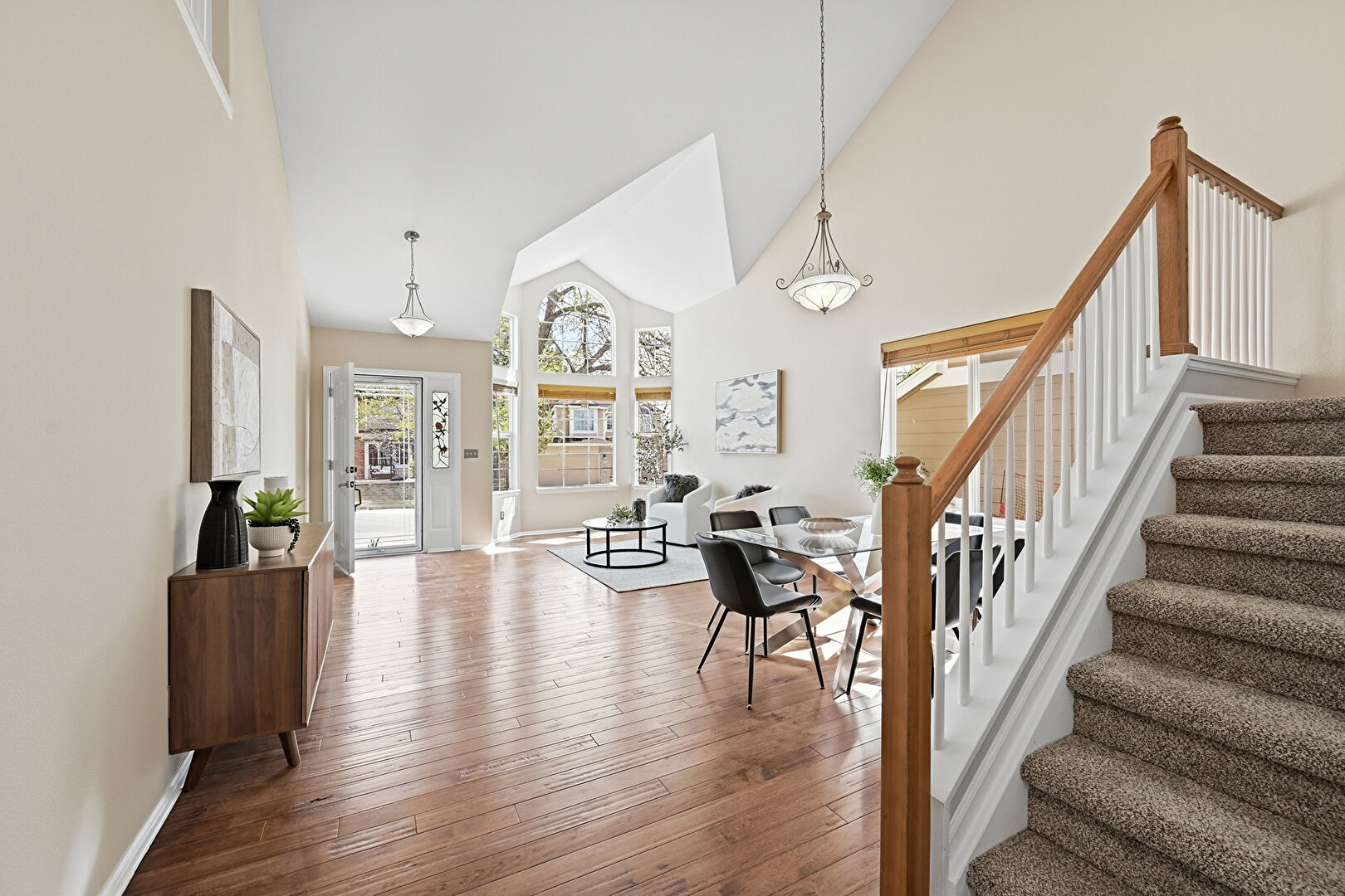 Baseboards Wall, Drywall, High Ceiling, Natural Light, Notable Chandelier, Recessed Lighting, Stairs, Vaulted Ceiling, Vent, Wood Finish Floor, Carpet, High Ceiling, Stairs, Vaulted Ceiling