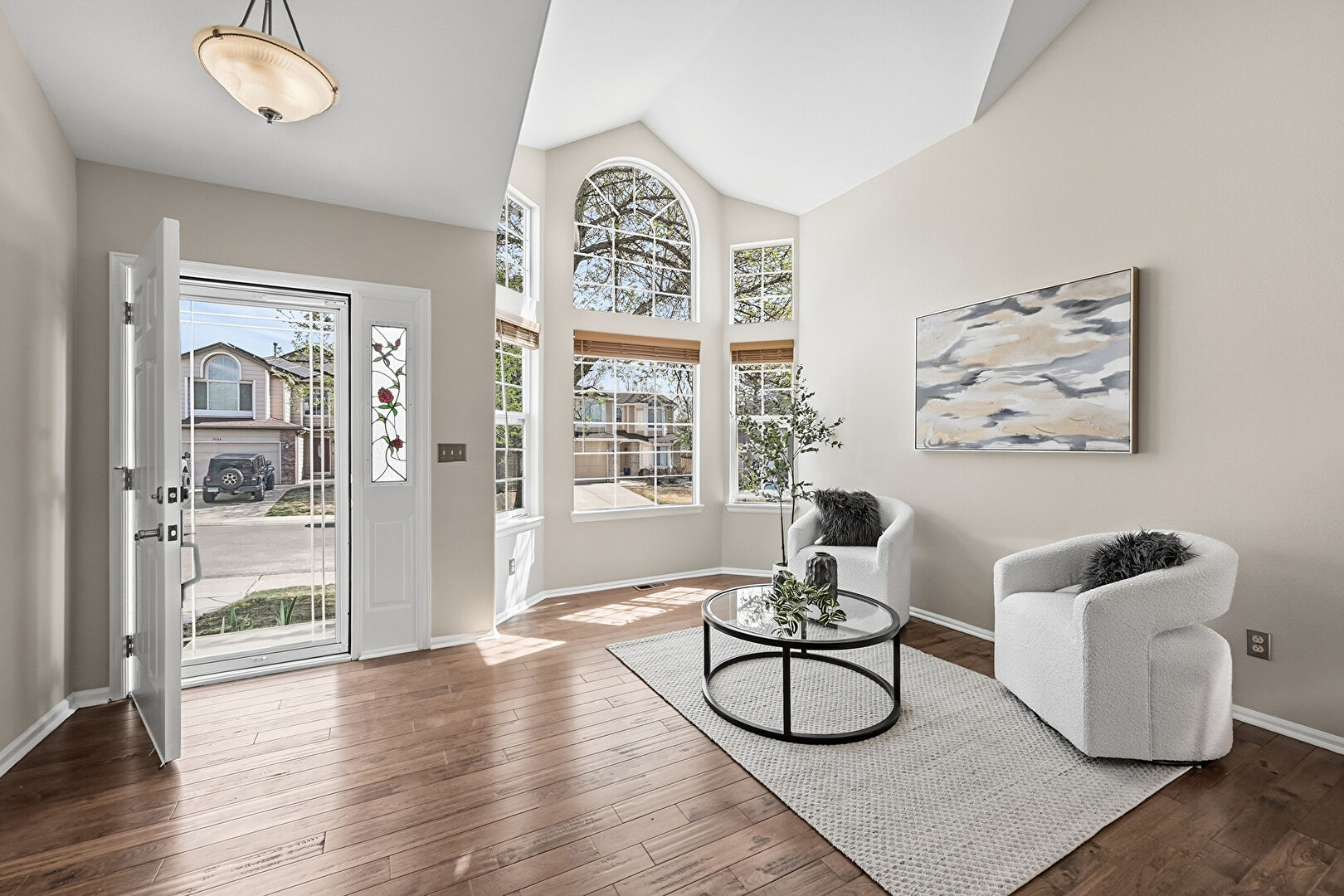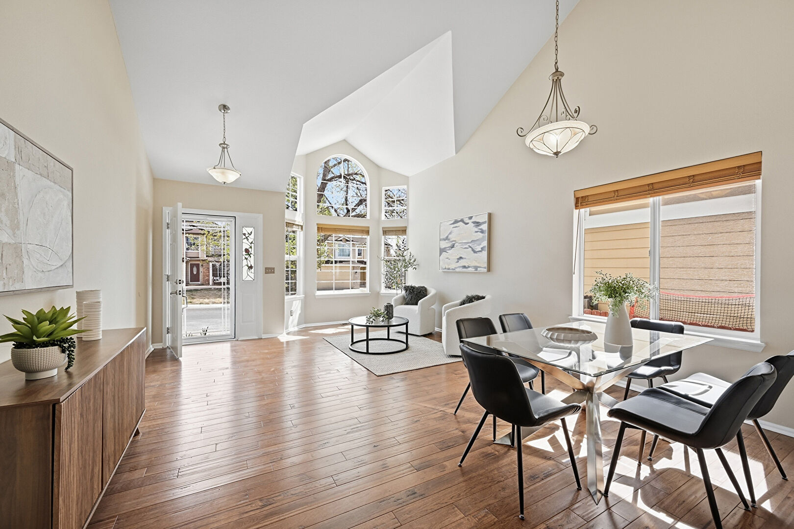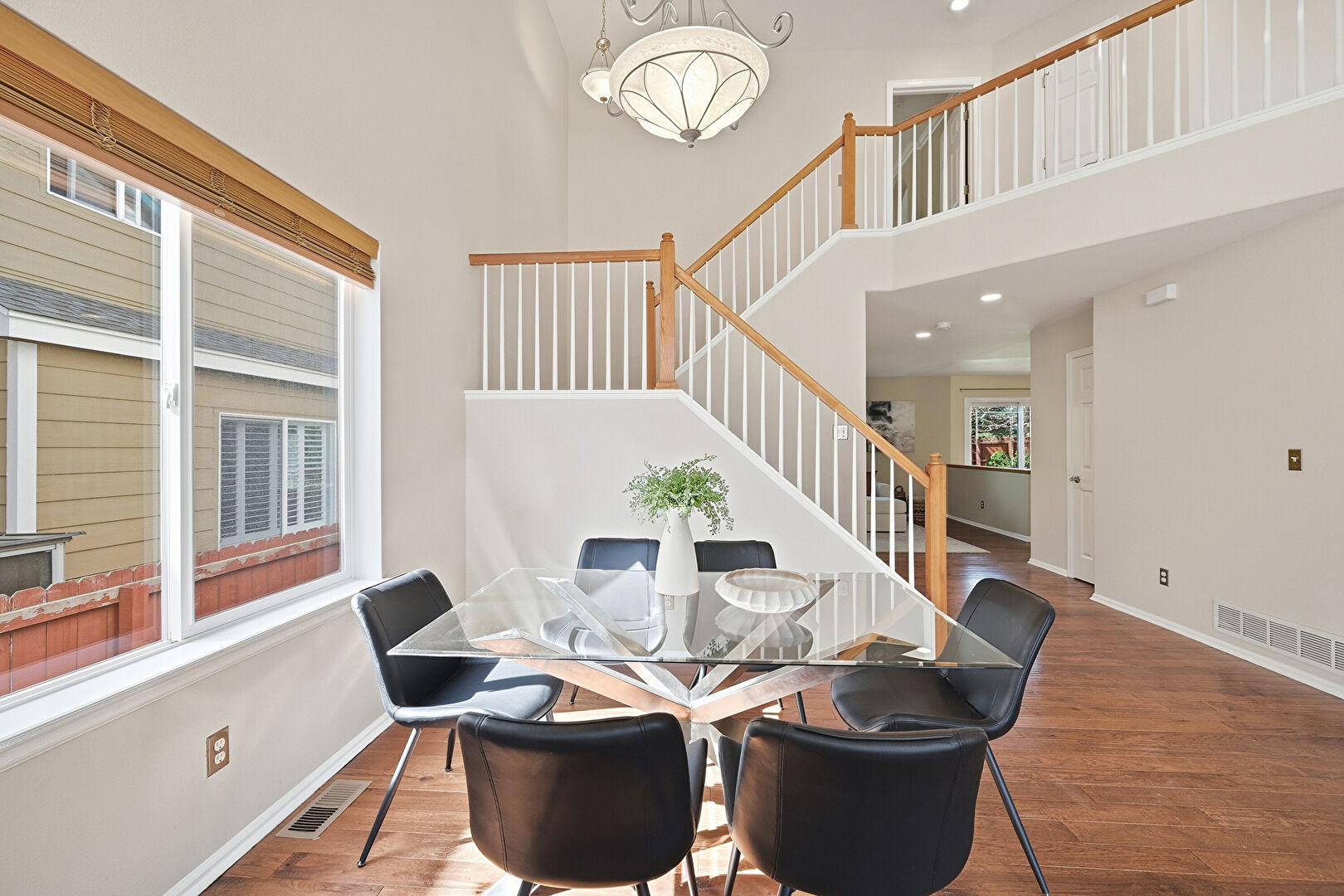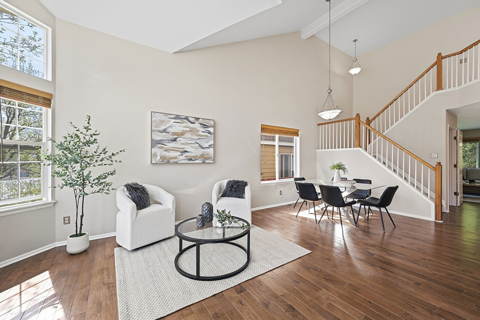 Baseboards Wall, Drywall, High Ceiling, Natural Light, Notable Chandelier, Recessed Lighting, Stairs, Vaulted Ceiling, Vent, Wood Finish Floor, Carpet, High Ceiling, Stairs, Vaulted Ceiling