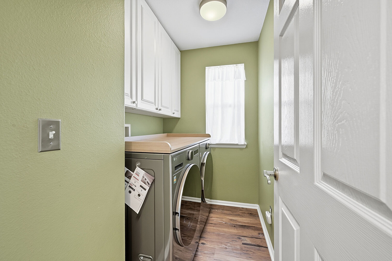 Baseboards Wall, Natural Light, Textured Wall, Washer Hookup, Wood Finish Floor, Laundry