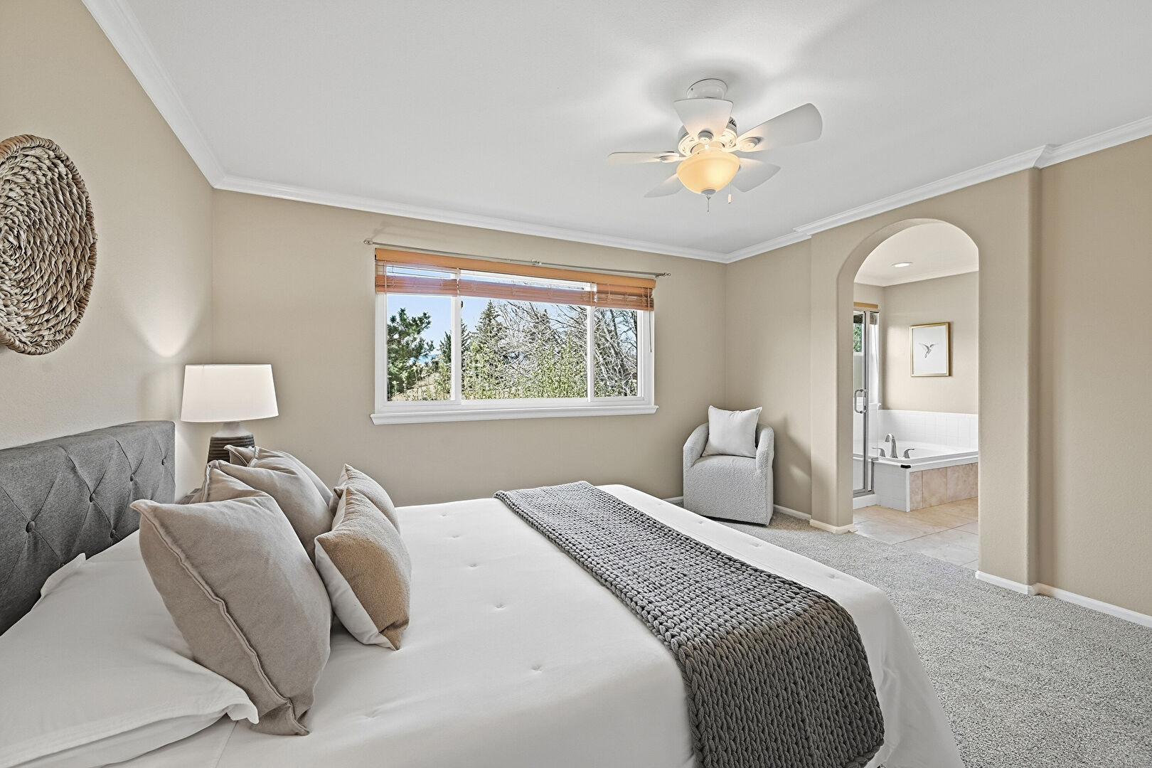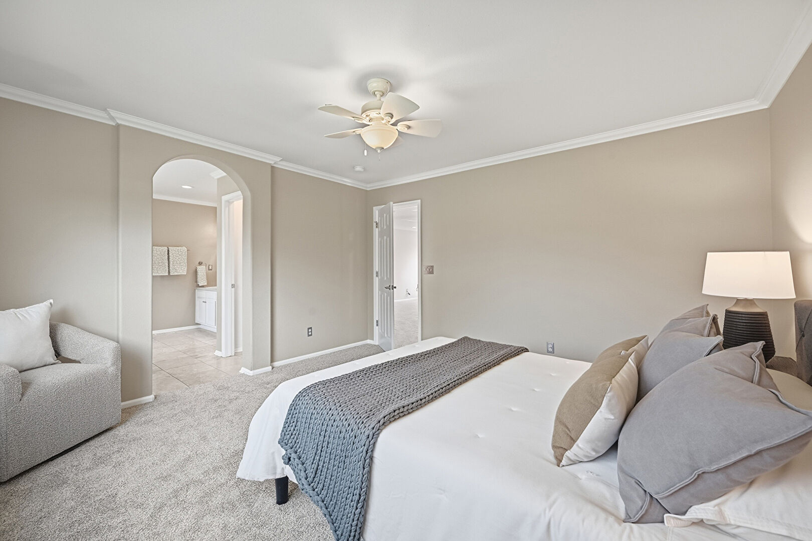 Arched Walkways, Baseboards Wall, Carpet, Ceiling Fan, Crown Molding, Drywall, Ensuite Bathroom, Natural Light, Baseboards Wall, Carpet, Ensuite Bathroom, Natural Light