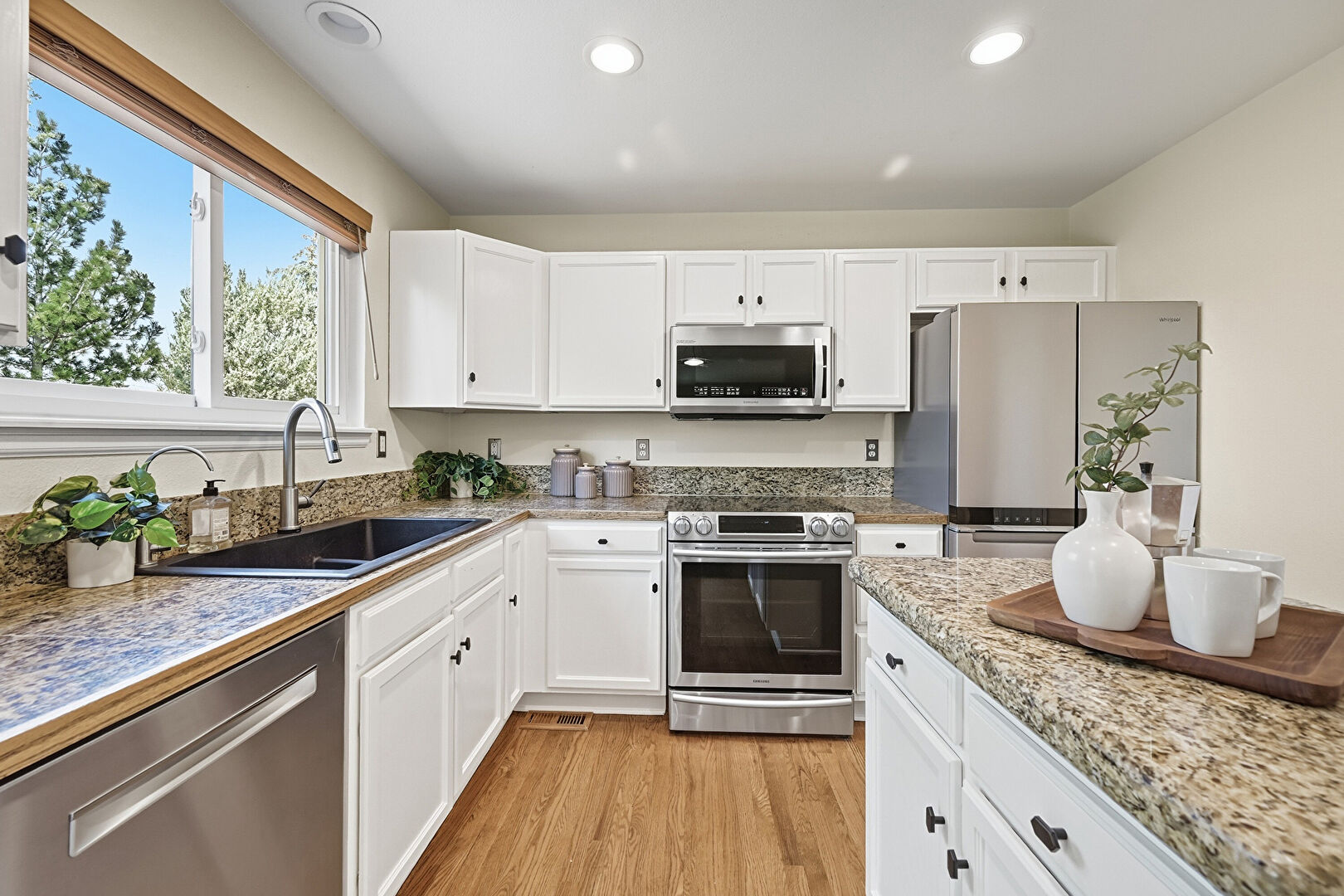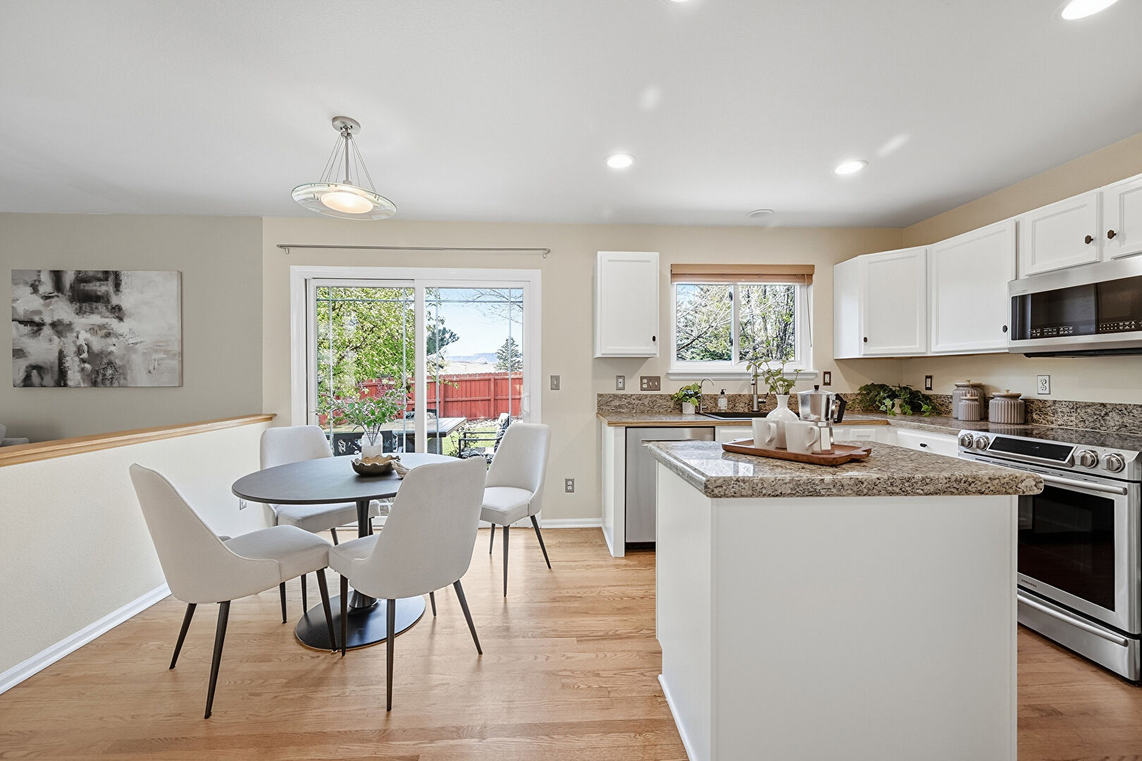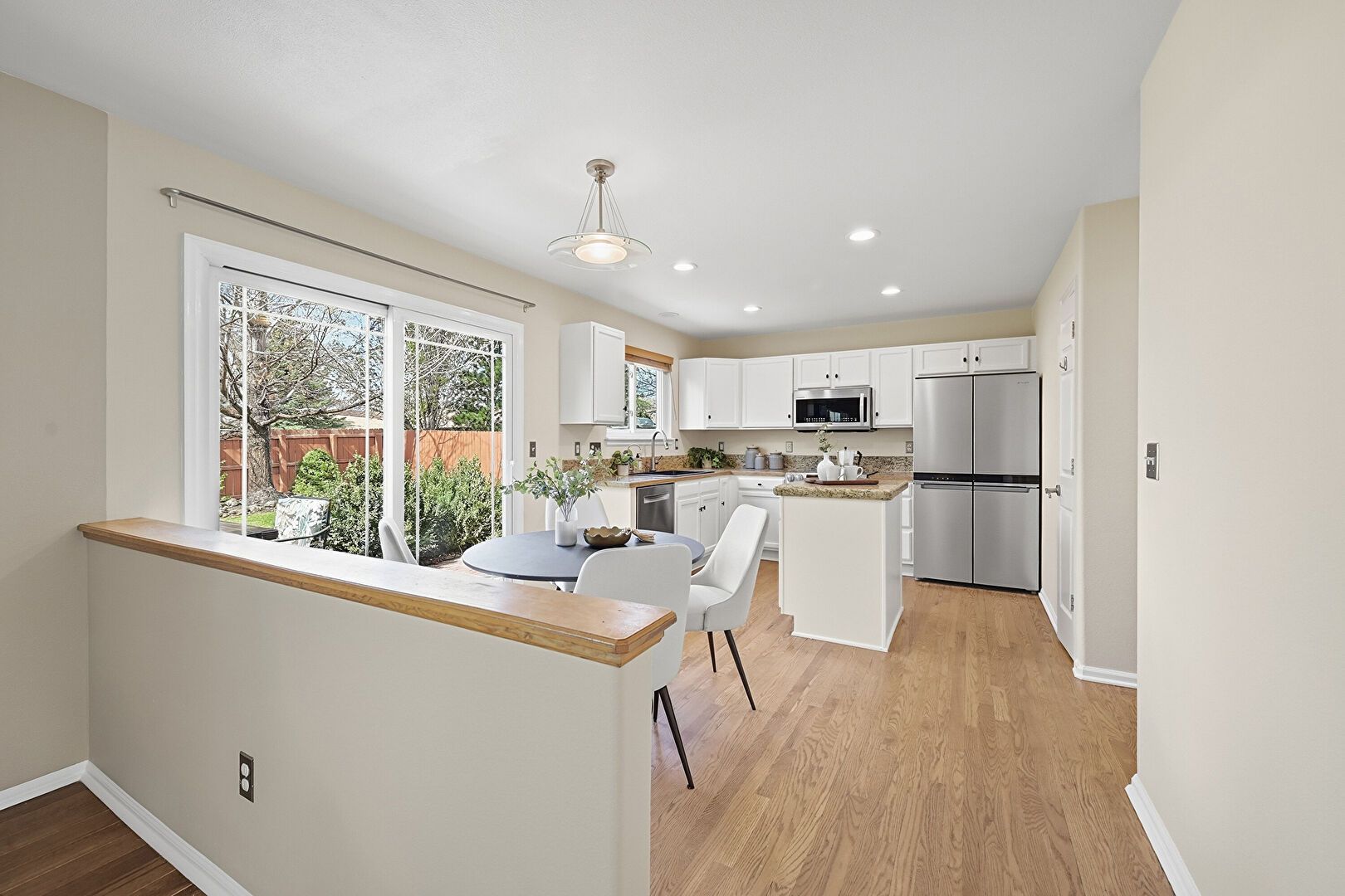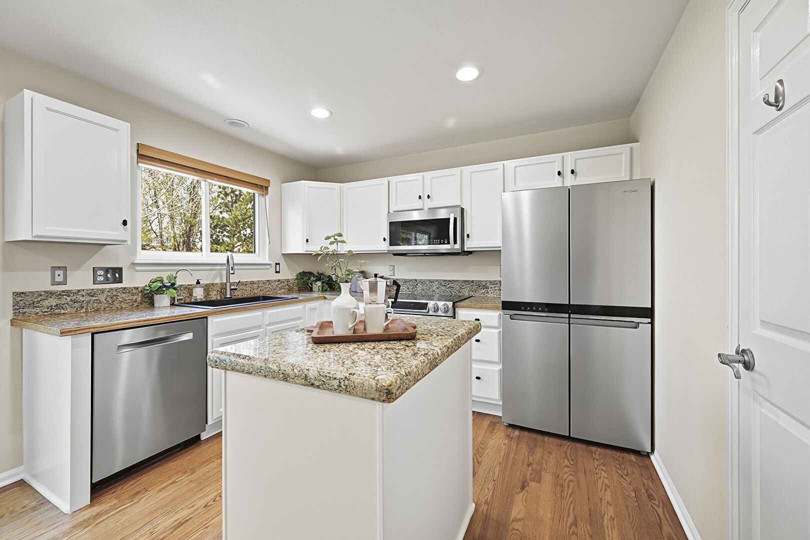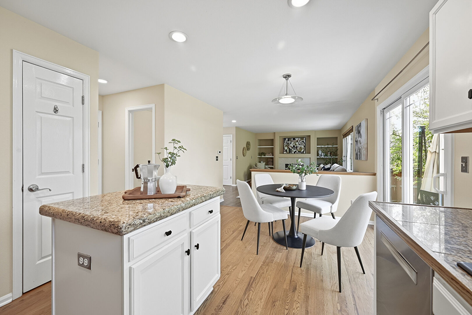 Baseboards Wall, Built In Shelves, Drywall, Kitchen Bar, Kitchen Island, L Shaped Kitchen, Natural Light, Opens To Living Area, Pendant Lighting, Recessed Lighting, Shaker Cabinets, Stone Countertops, Wood Finish Floor, Baseboards Wall, Drywall, Kitchen Island, Natural Light, Vent