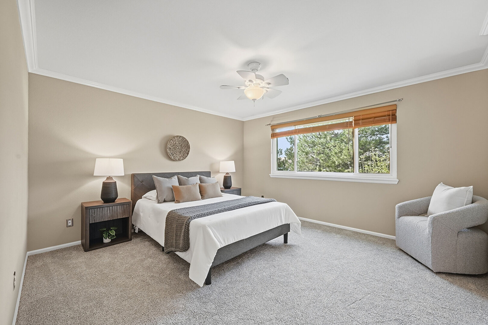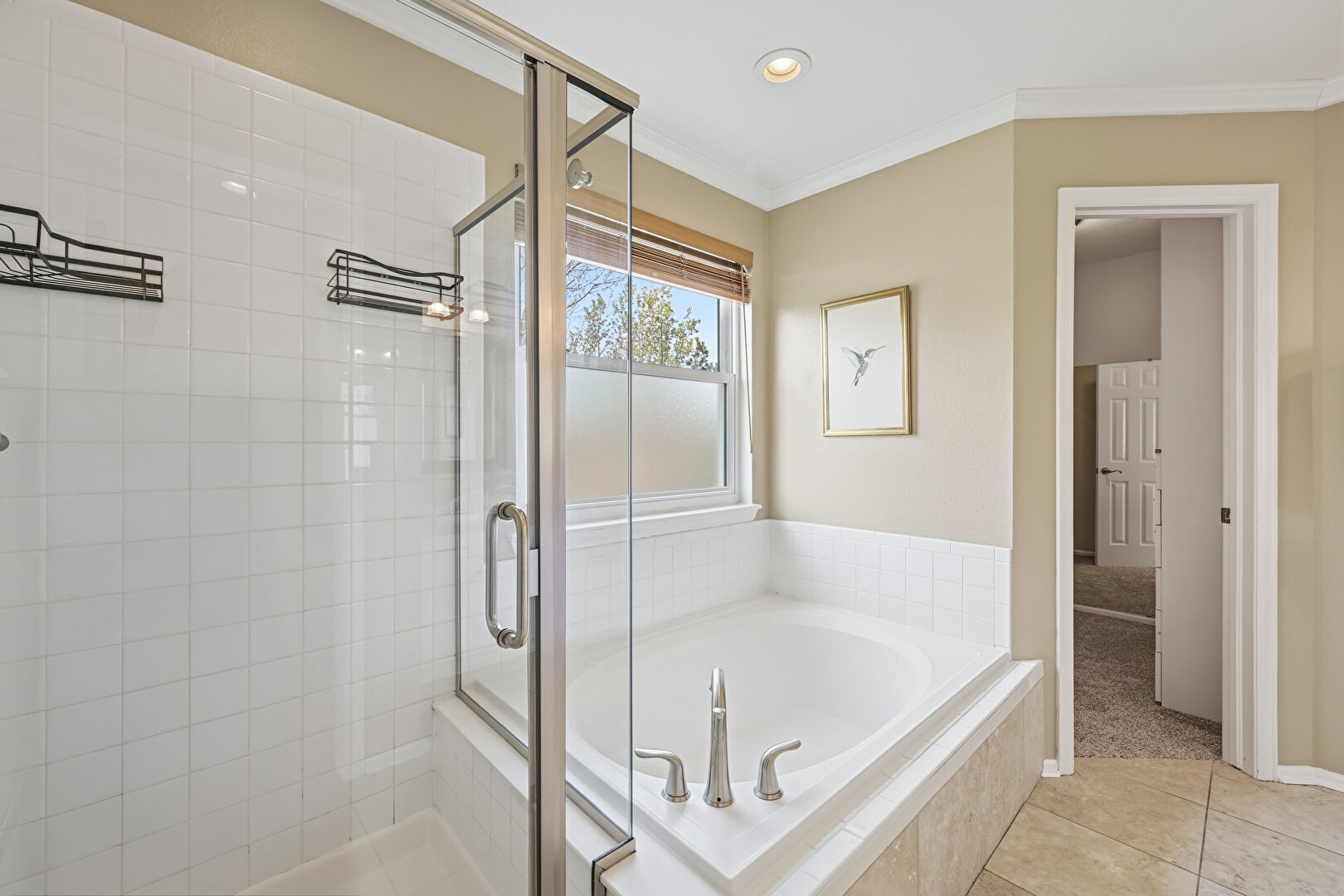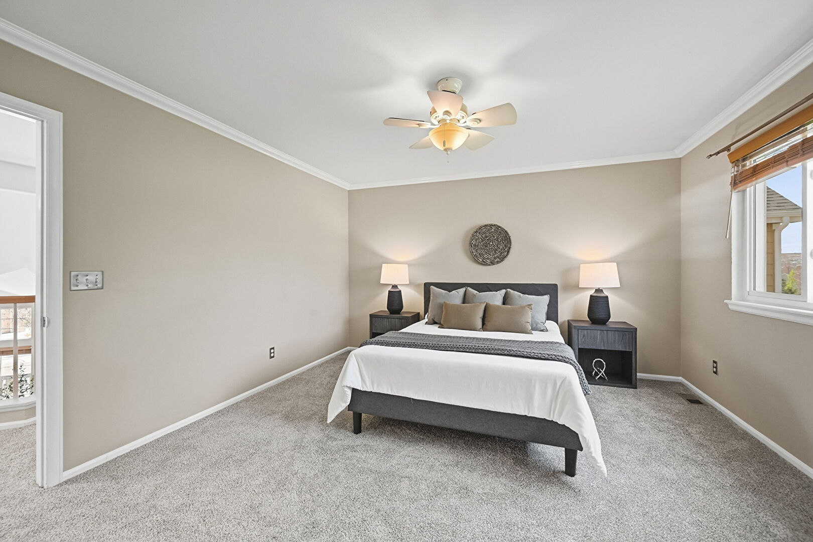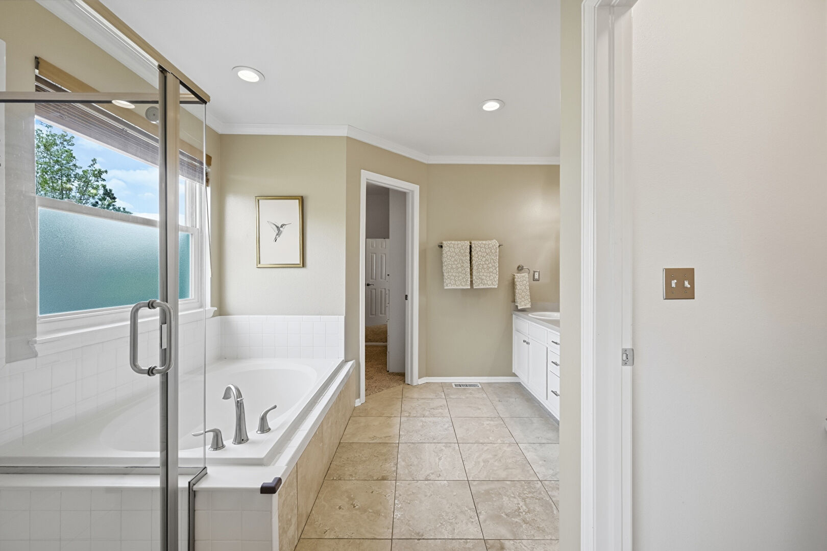 Baseboards Wall, Carpet, Crown Molding, Double Vanity, Drywall, Ensuite Bathroom, Full Bathroom, Natural Light, Recessed Lighting, Tile Floor, Vanity, Vent, Ceiling Fan, Full Bathroom, Recessed Lighting