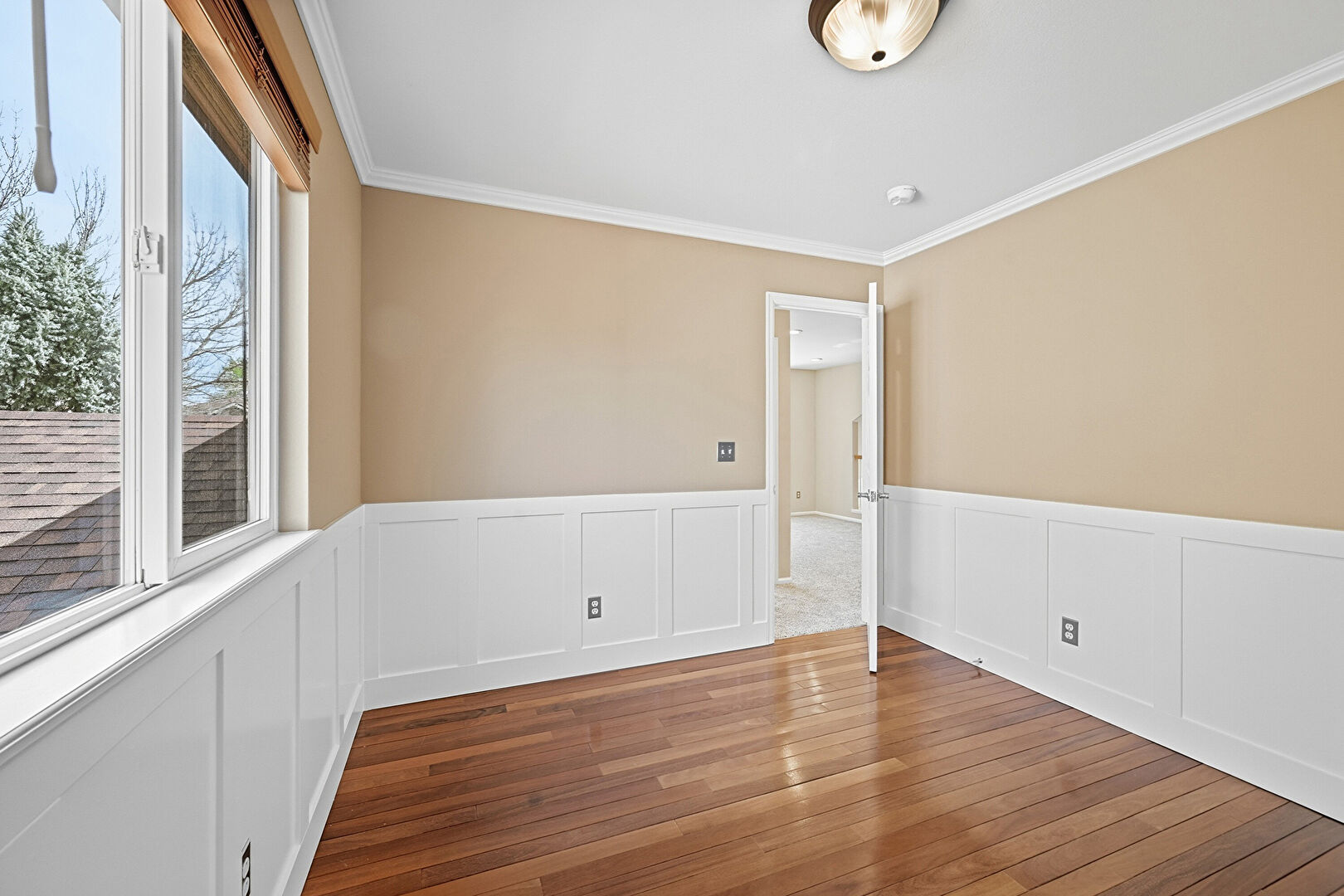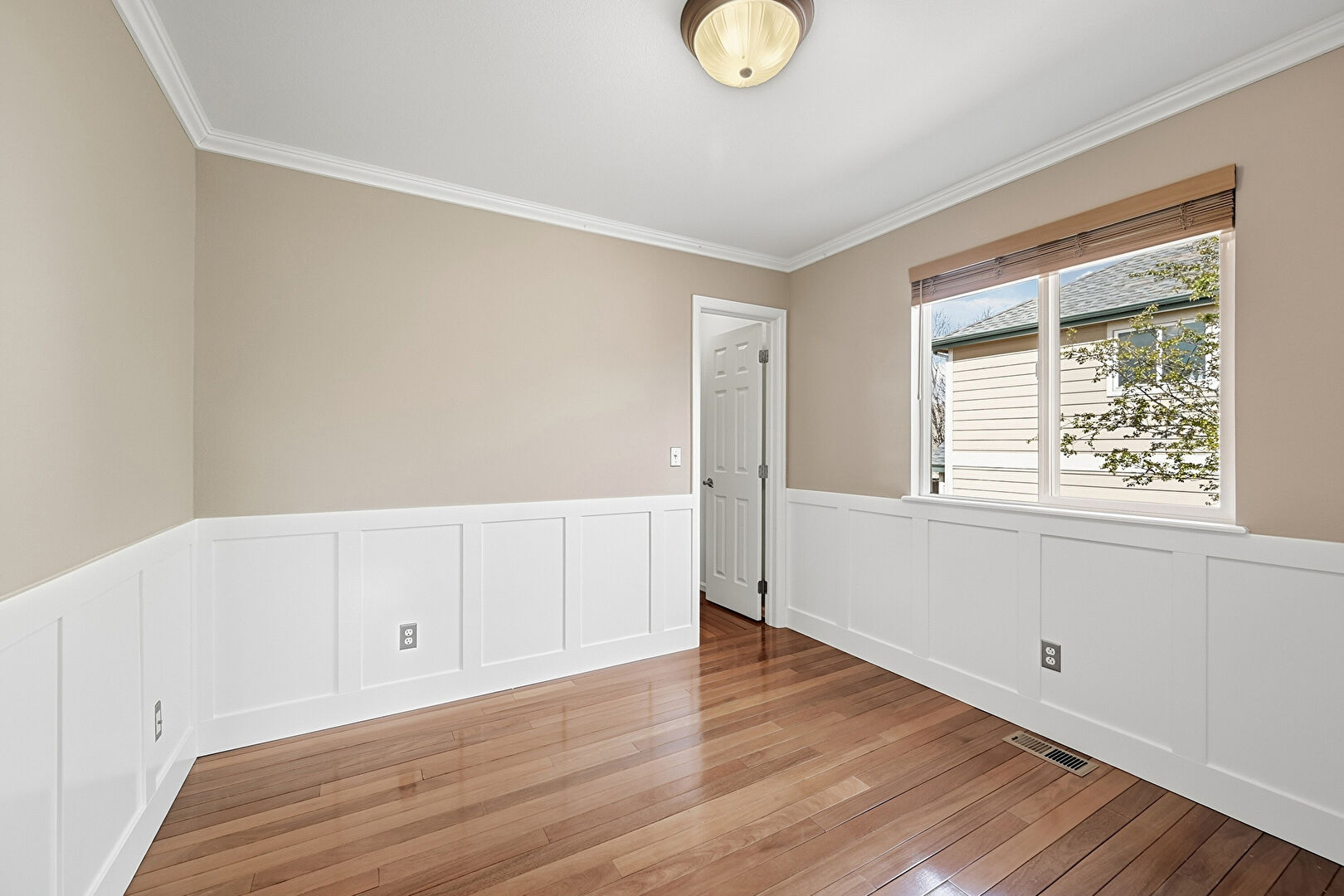 Crown Molding, Drywall, Natural Light, Paneling Wall, Smoke Carbon Monoxide Detector, Wainscot Wall, Wood Finish Floor, Crown Molding, Vent