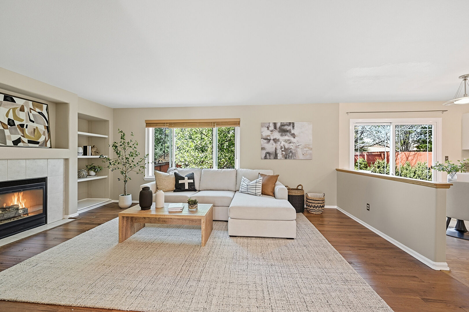 Baseboards Wall, Built In Shelves, Drywall, Fireplace, Natural Light, Recessed Lighting, Smoke Carbon Monoxide Detector, Stairs, U Shaped Kitchen, Vent, Wood Finish Floor, Baseboards Wall, Fireplace, Natural Light, Vent