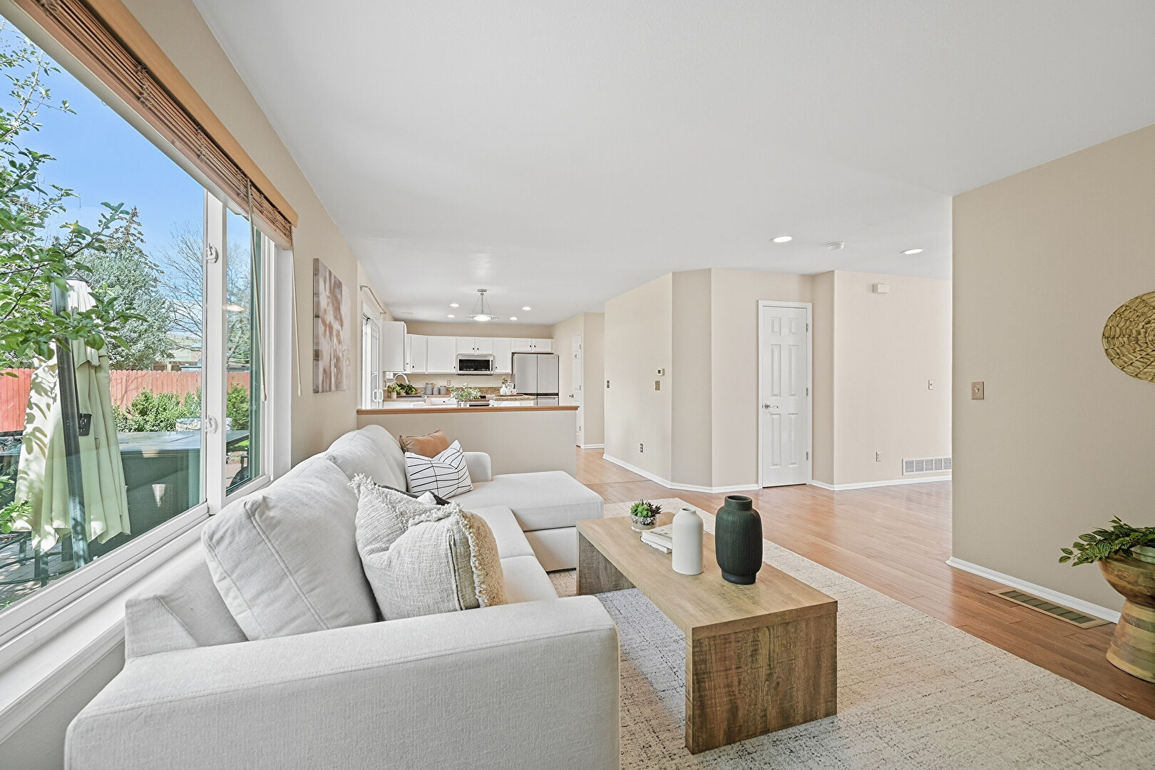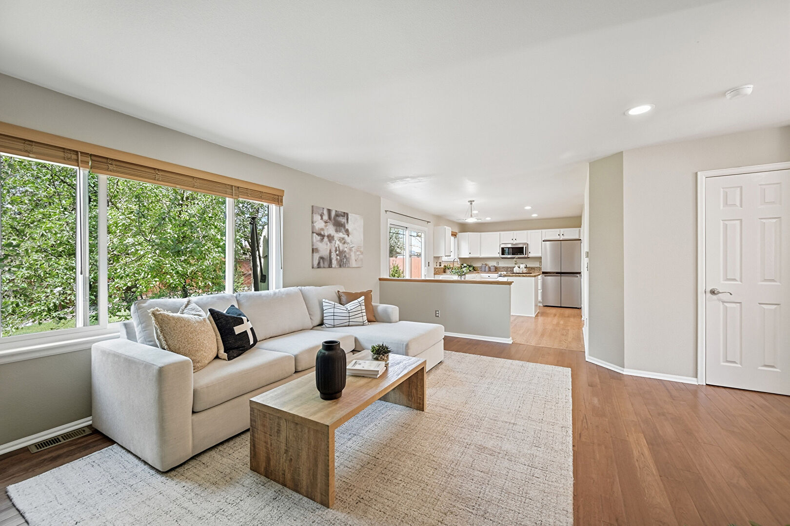 Baseboards Wall, Built In Shelves, Drywall, Fireplace, L Shaped Kitchen, Natural Light, Recessed Lighting, Wood Finish Floor, Natural Light, Wood Finish Floor