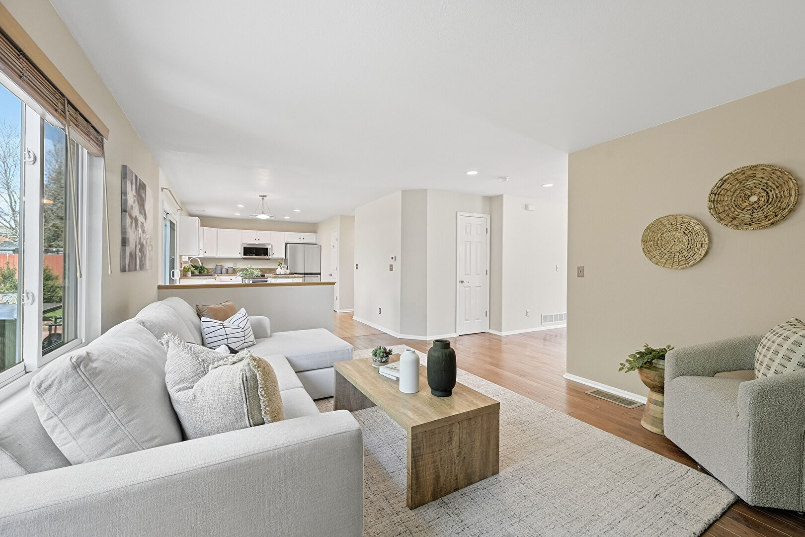 Baseboards Wall, Beamed Ceiling, Cathedral Ceiling, Drywall, High Ceiling, Natural Light, Recessed Lighting, Stairs, Vaulted Ceiling, Vent, Wood Finish Floor, Natural Light, Wood Finish Floor