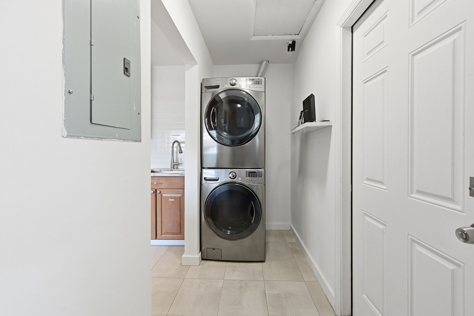 Baseboards Wall, Drywall, Electric Panel, Scuttle, Tile Floor, Laundry